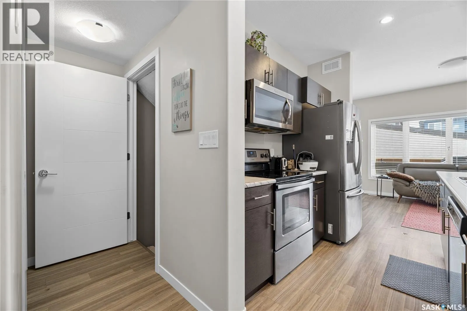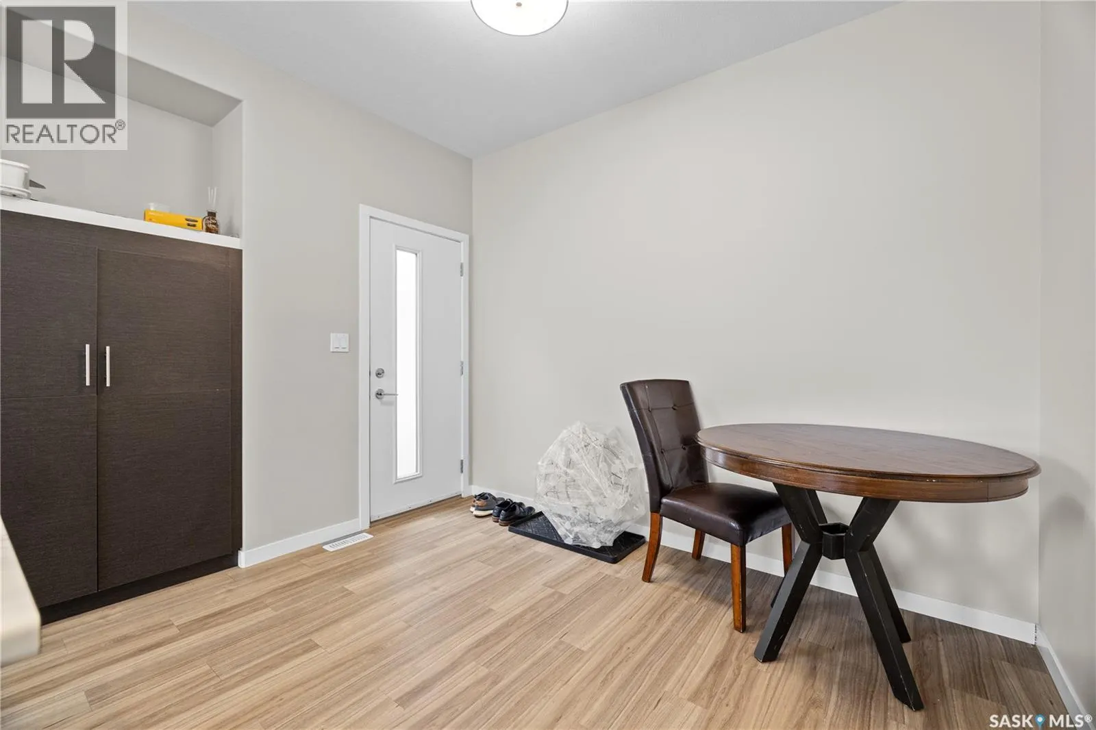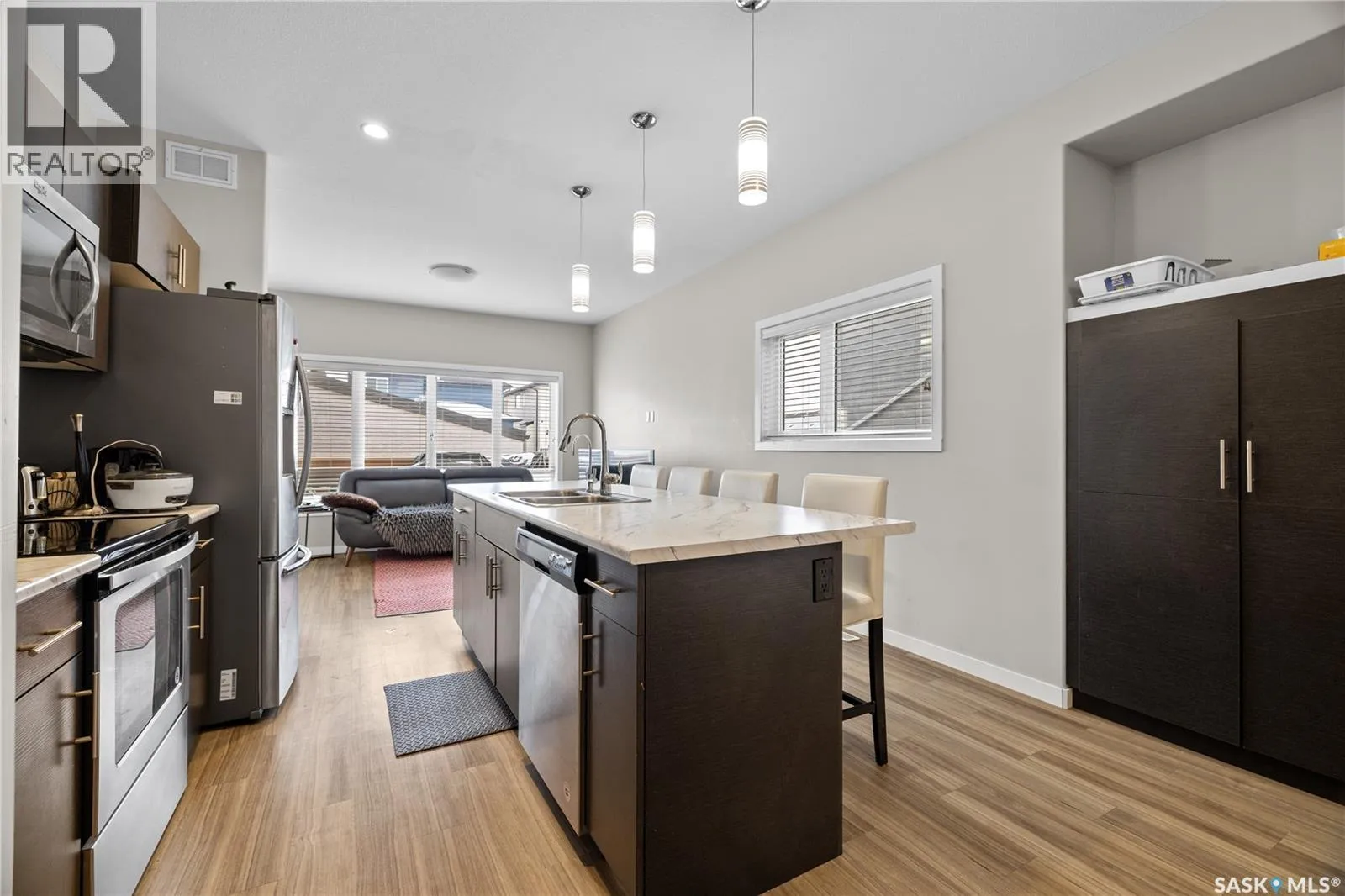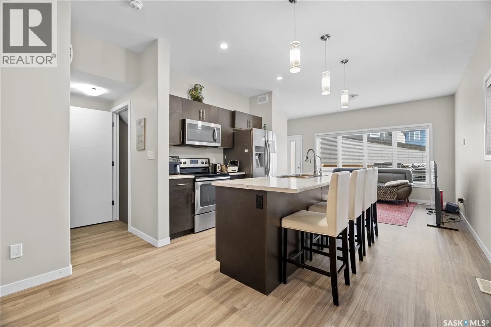 This beautifully and tremendously townhouse condo in amazing Harbour Landing neighbourhood community is less than 7 minutes drive to Regina International Airport, few metres to Havilland Park and short walking distance to school, seniors home, daycare, and shopping centres. The home is fitted with metal roof, primary bedroom balcony, barbecue deck and on 1 detached garage. Upon entry, you are welcome by the modern open plan concept with sizable living room open to the dining area and U-shaped kitchen that is equipped with sit-up island, numerous cabinets and stainless-steel appliances, mudroom, 2 pc washroom and vinyl plank floorings. 2nd level features sizable primary bedroom with 4pcs bathroom en-suit and walk-in closet, another good size bedroom, 4pcs bathroom and laundry room compliment this level. Basement level is professionally and fully finished with spacious recreational room, roughed-in bathroom and utilities room for tons of storage. The condo fee is $150 and include: Common Area Maintenance, External Building Maintenance, Lawncare, Snow Removal, Insurance (Common). Schedule your showings. (id:27476)