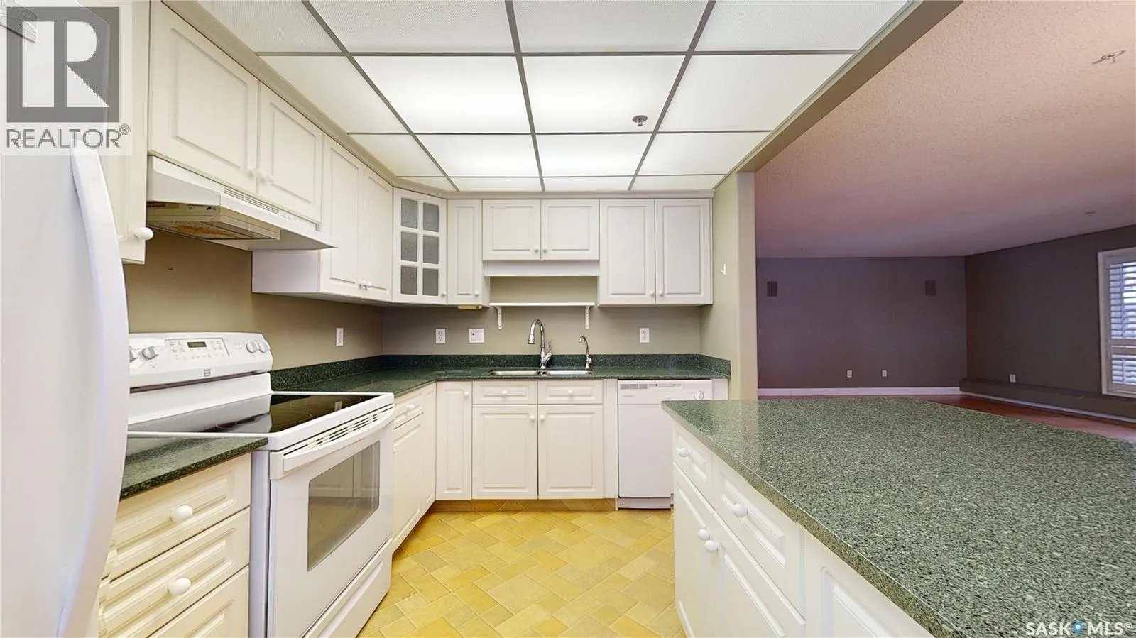 Welcome Marian Gardens, a mature condo complex located in Regina's Hillsdale Neighbourhood. This spacious 1,266 sqft main-floor corner unit offers 2 bedrooms and 2 bathrooms, ideal for comfortable, low-maintenance living. Walking distance to grocery stores, pharmacies, gas stations, restaurants, and other everyday amenities. A wide entryway leads into a bright, open living room, dining area, and functional kitchen. Hardwood flooring extends through the living room and dining area. The kitchen features white cabinetry, granite countertops, a large island, and ample counter space. The open layout allows for easy movement and is well-suited to both daily living and entertaining. The primary bedroom includes a walk-in closet and a private 3-piece ensuite. The second bedroom is generously sized and also offers a walk-in closet, making it ideal for guests, hobbies, or a home office. Additional conveniences include an in-suite laundry room with a washer and dryer, plus extra space for storage, along with two hallway pantry/linen closets. Enjoy the ease of main-floor living with an underground parking stall and storage space conveniently located directly in front of the stall. Residents also have access to a large amenities room featuring a pool table, small kitchen, bathroom, exercise equipment, and plenty of space for socials or private family gatherings. Don't miss out, call your real estate agent today for a private showing. (id:27476)
