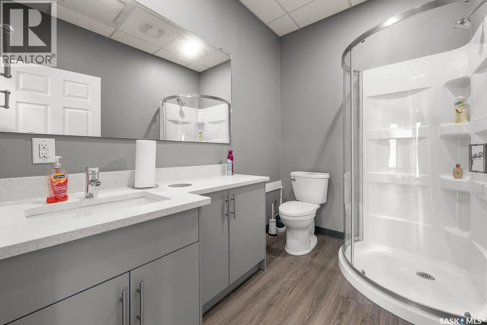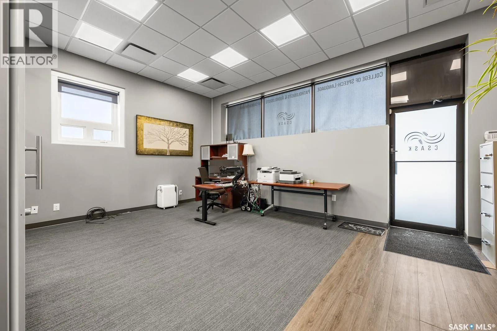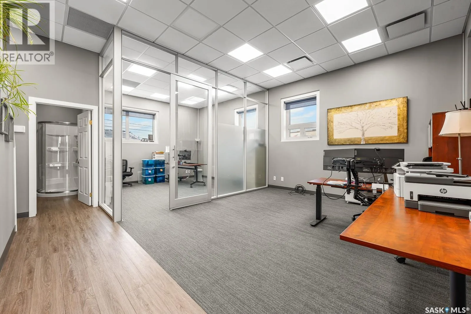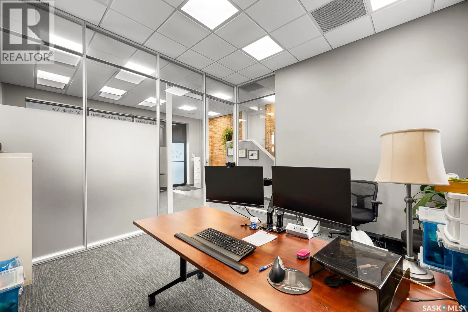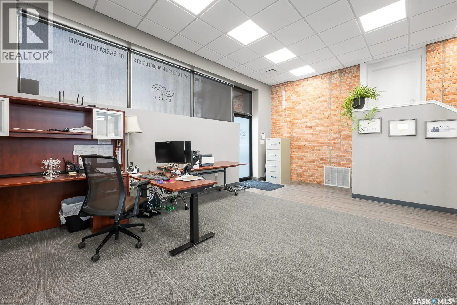 Amazing modern office space located in the sought-after Warehouse District. This unique space boasts its own private entrance and bathroom, offering both convenience and privacy. Inside you will see character meets contemporary design with a striking brick feature wall that adds a touch of warmth and style. Perfectly suited for an office or creative studio, this versatile area can comfortably accommodate 1 to 4 people, making it an ideal setup for small teams or freelancers. Donât miss out on this unique opportunity to establish your workspace in one of the city's most vibrant neighborhoods. (id:27476)