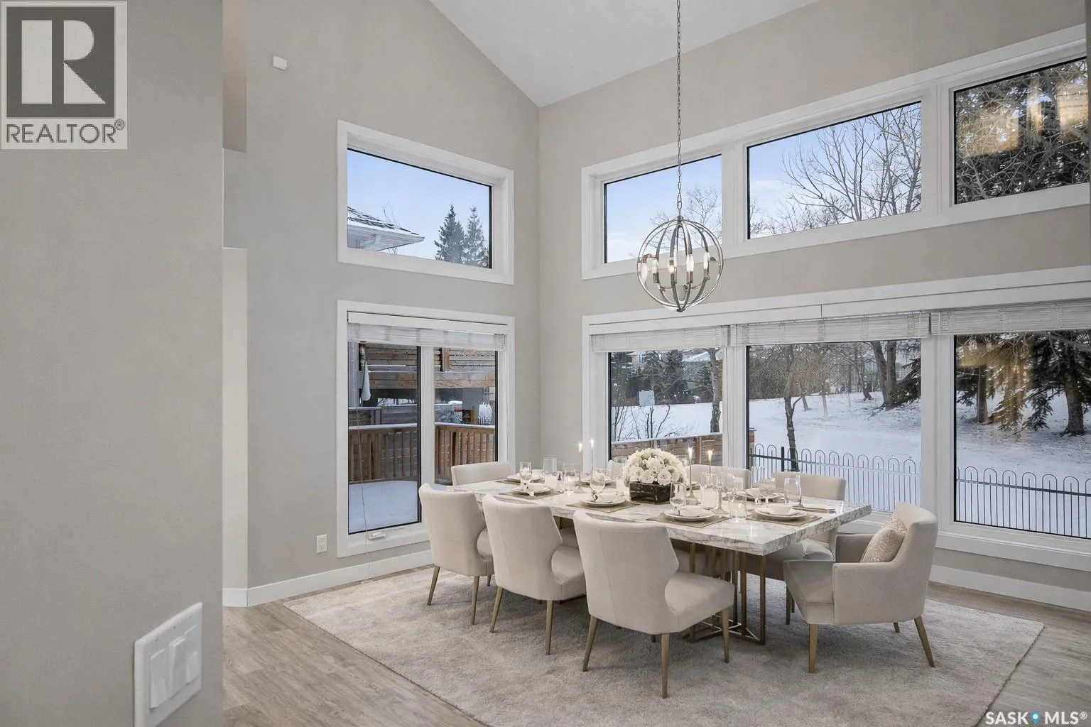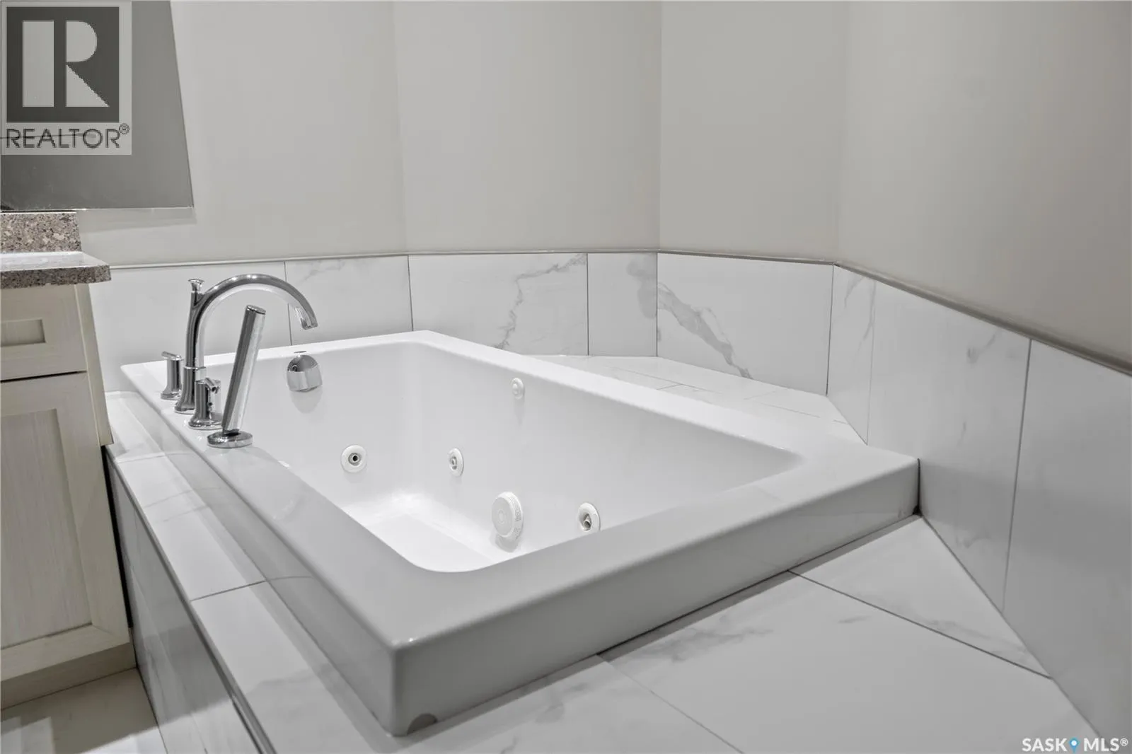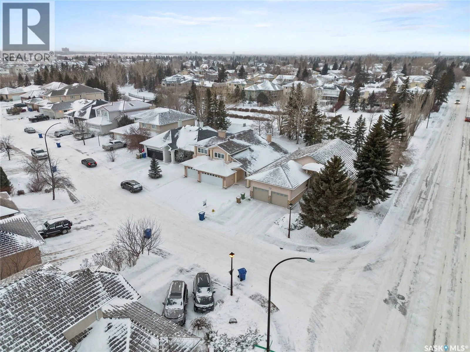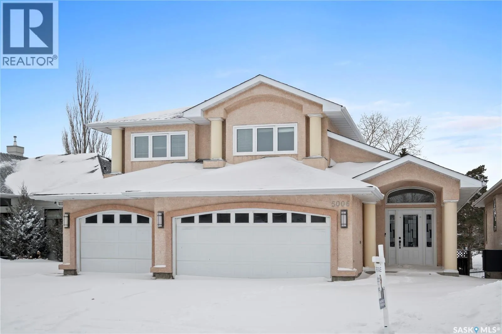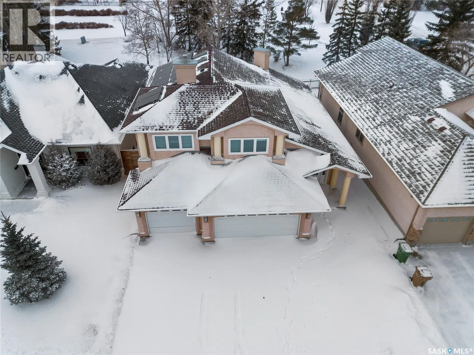 Welcome to 5006 Wascana Vista Court. This former show home is nestled in the sought-after Wascana View neighborhood. This quiet cul-de-sac location backs onto a walking path, offering convenient access to east-end amenities and schools. This two-story split home features 4bd, 3ba, and a spacious 32x24 triple attached insulated garage. The exterior and landscaping are very low maintenance, with a xeriscaped front yard, stucco siding, and a backyard with multiple patio areas and artificial turf. Upon entering, you are greeted by a foyer with 2 closets and tile flooring. A curved staircase descends into the expansive great room, featuring massive windows that provide views of the greenspace. The formal dining room is separated from the great room by a 3 sided gas fireplace. Overlooking the dining room is the updated kitchen, complete with ample cabinet space, quartz countertops, a tile backsplash, and included stainless steel appliances. Next, an additional versatile room can serve as a family room, or reading nook. Adjacent is a main floor bedroom, with natural light from a rear window. The main floor also includes a 2pc bathroom, a large laundry room, and a utility room housing 2 new furnaces and a air conditioner (installed June 2025), a rented water heater, and an r/o system. A storage area completes this level. Ascending a curved staircase, you arrive at a bonus room, located next to the master. The master suite has French doors, expansive windows, a custom-built walk-in closet, and a luxurious 5pc ensuite bathroom with 2 sinks, a jet tub, a custom tile shower, and heated floors. A few more stairs lead to the top floor that has an additional nook, 2 generous bedrooms, and a 5pc bathroom equipped with double sinks and a deep soaker bathtub. The entire home has been recently painted, and significant energy efficiency upgrades were made in 2023, including new shingles and solar panels. Certain photos have been digitally staged and are clearly marked. (id:27476)