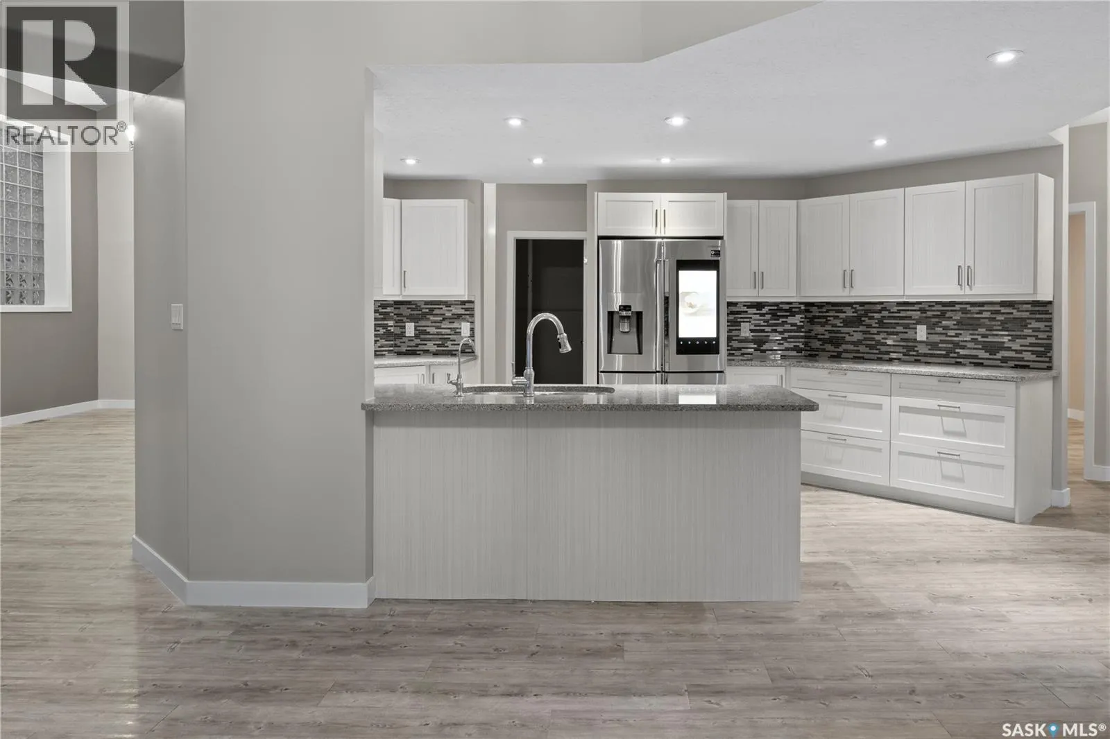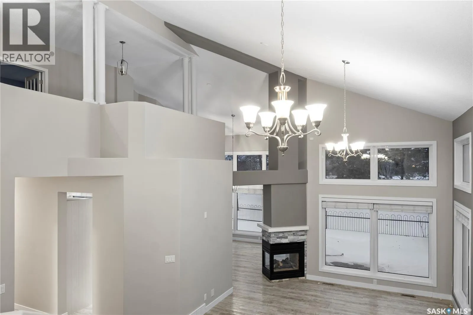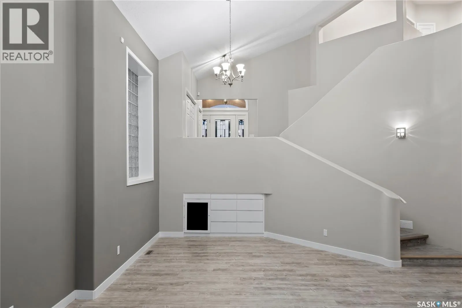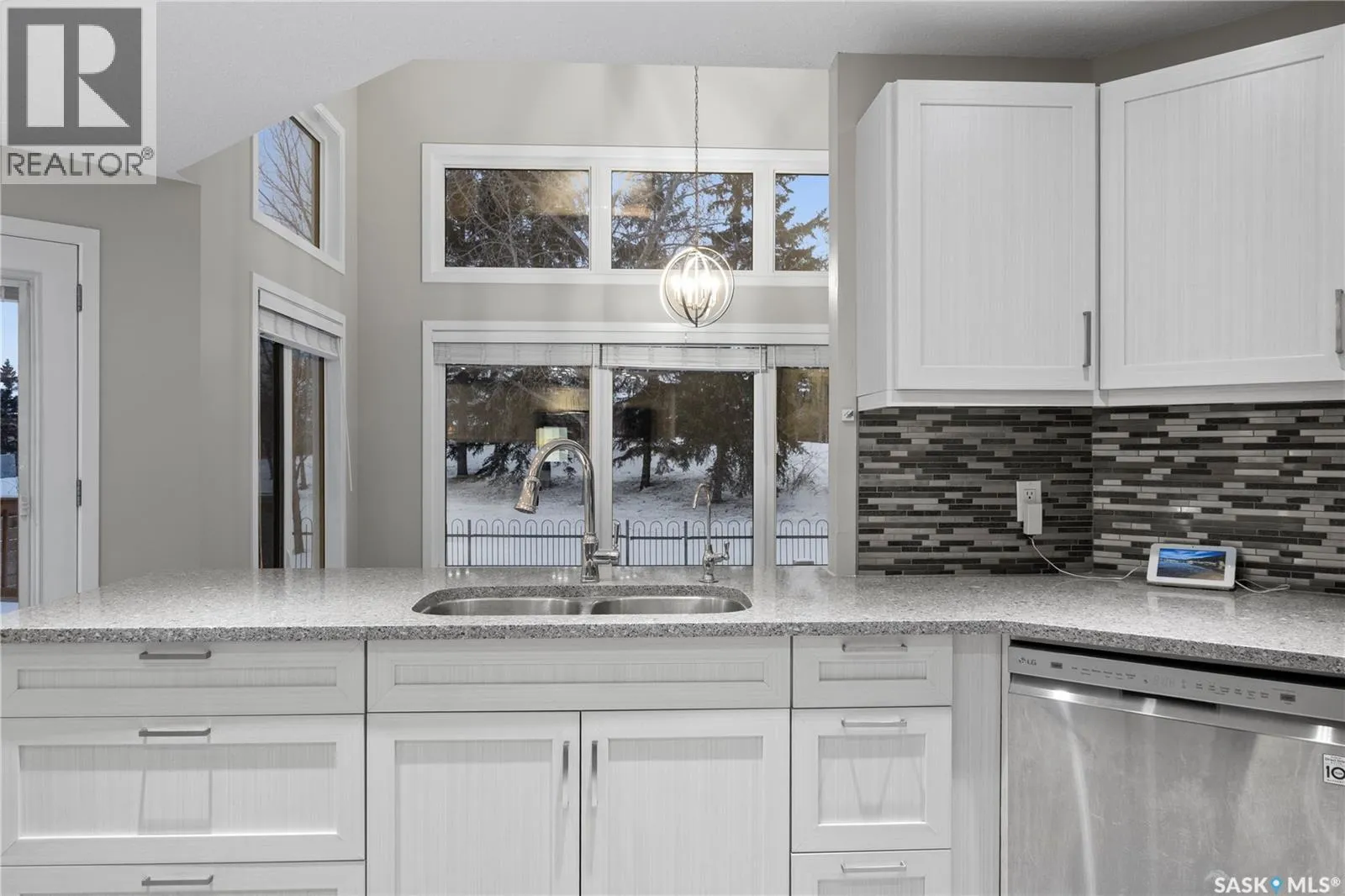 Welcome to 5006 Wascana Vista Court. This former show home is nestled in the sought-after Wascana View neighborhood. This quiet cul-de-sac location backs onto a walking path, offering convenient access to east-end amenities and schools. This two-story split home features 4bd, 3ba, and a spacious 32x24 triple attached insulated garage. The exterior and landscaping are very low maintenance, with a xeriscaped front yard, stucco siding, and a backyard with multiple patio areas and artificial turf. Upon entering, you are greeted by a foyer with 2 closets and tile flooring. A curved staircase descends into the expansive great room, featuring massive windows that provide views of the greenspace. The formal dining room is separated from the great room by a 3 sided gas fireplace. Overlooking the dining room is the updated kitchen, complete with ample cabinet space, quartz countertops, a tile backsplash, and included stainless steel appliances. Next, an additional versatile room can serve as a family room, or reading nook. Adjacent is a main floor bedroom, with natural light from a rear window. The main floor also includes a 2pc bathroom, a large laundry room, and a utility room housing 2 new furnaces and a air conditioner (installed June 2025), a rented water heater, and an r/o system. A storage area completes this level. Ascending a curved staircase, you arrive at a bonus room, located next to the master. The master suite has French doors, expansive windows, a custom-built walk-in closet, and a luxurious 5pc ensuite bathroom with 2 sinks, a jet tub, a custom tile shower, and heated floors. A few more stairs lead to the top floor that has an additional nook, 2 generous bedrooms, and a 5pc bathroom equipped with double sinks and a deep soaker bathtub. The entire home has been recently painted, and significant energy efficiency upgrades were made in 2023, including new shingles and solar panels. Certain photos have been digitally staged and are clearly marked. (id:27476)