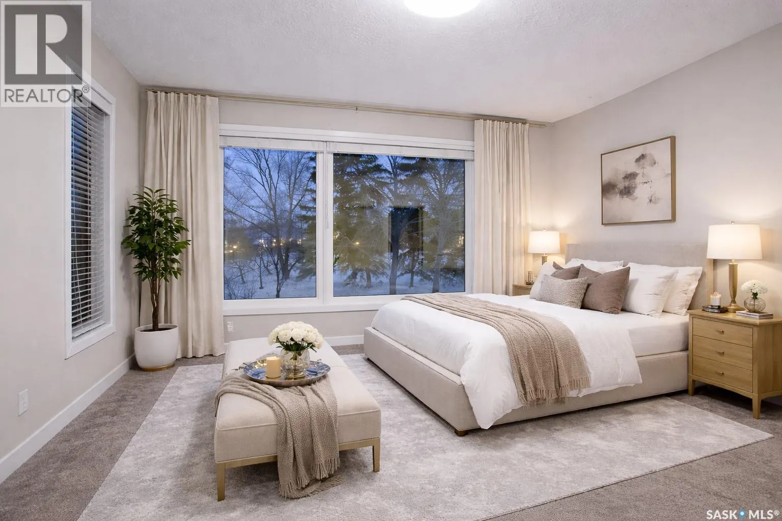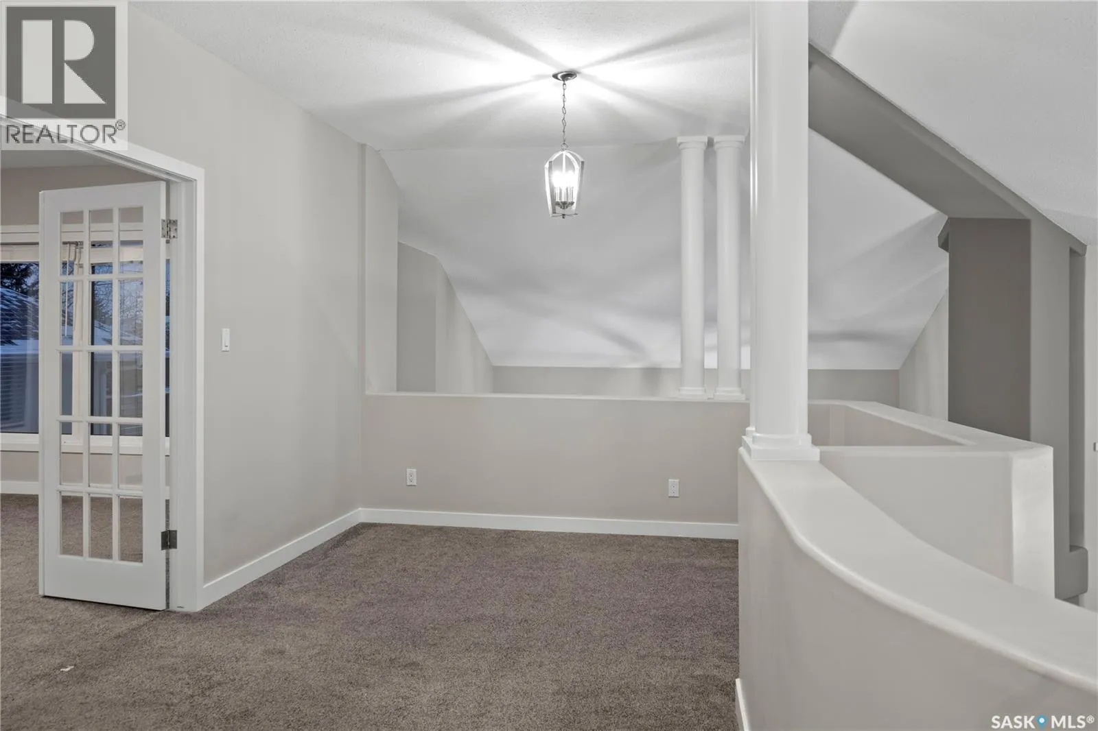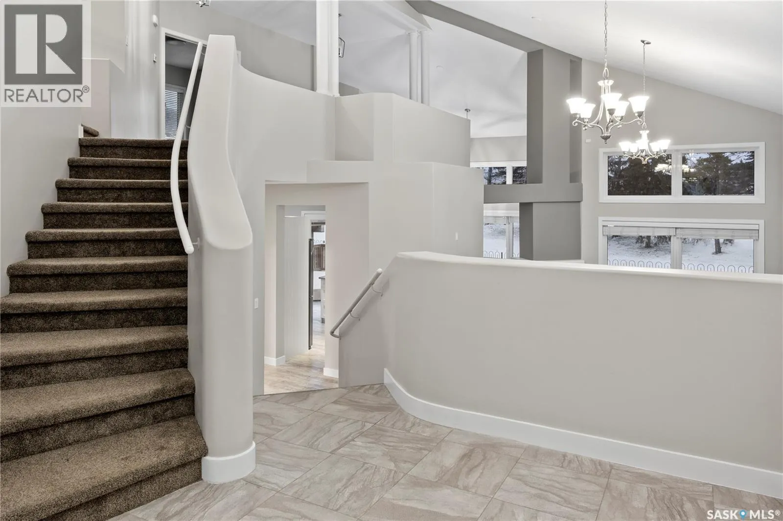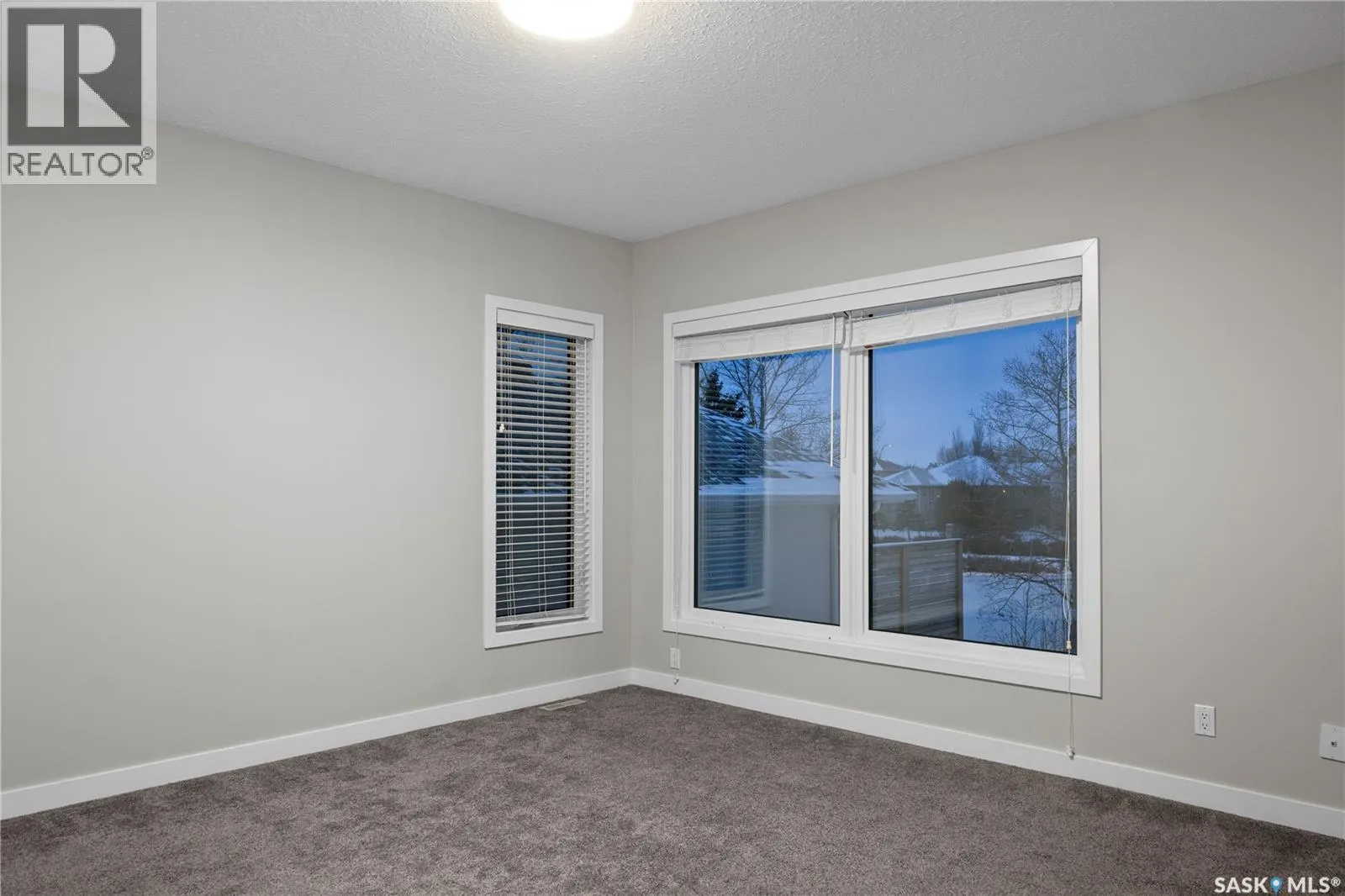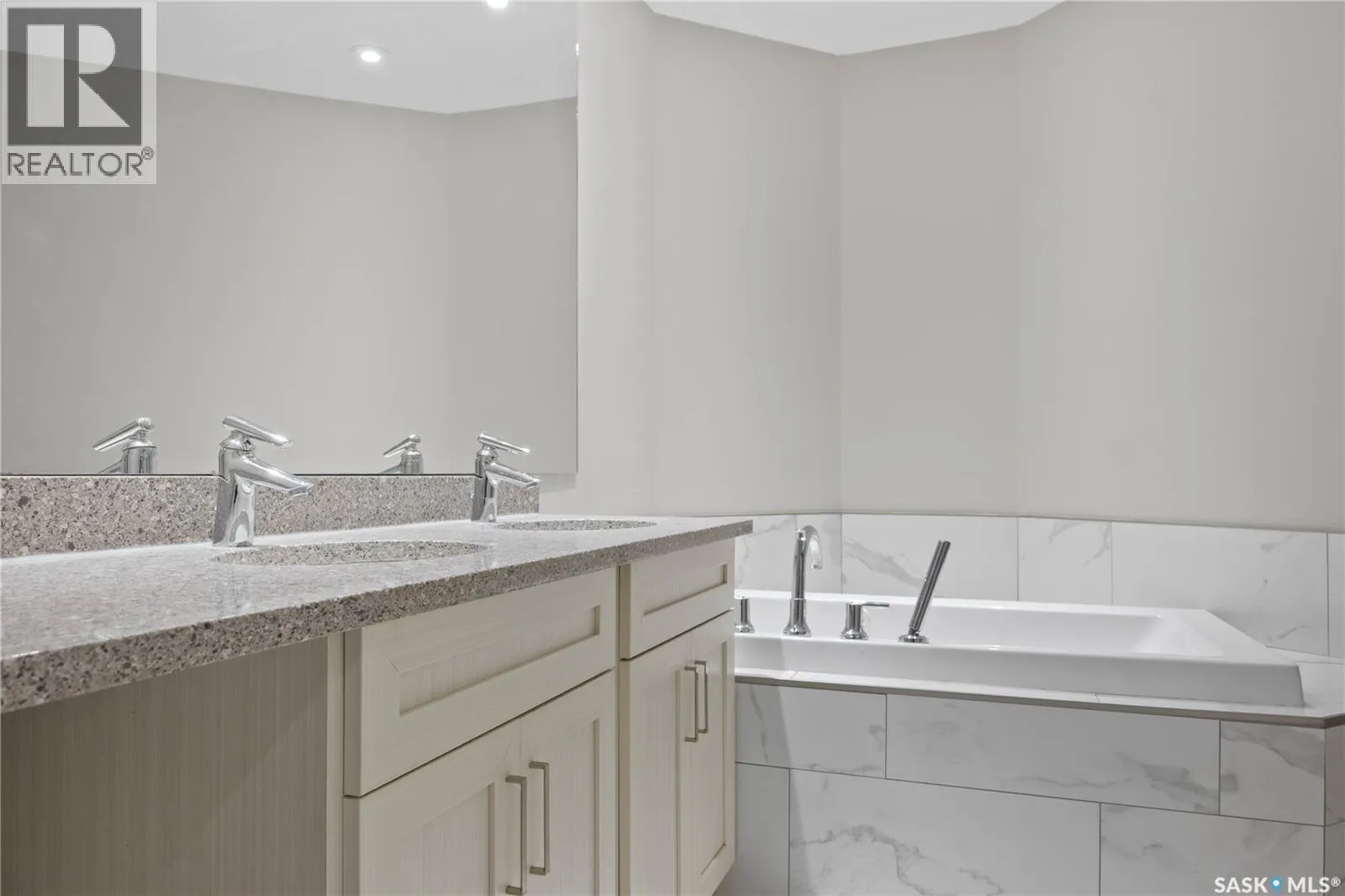 Welcome to 5006 Wascana Vista Court. This former show home is nestled in the sought-after Wascana View neighborhood. This quiet cul-de-sac location backs onto a walking path, offering convenient access to east-end amenities and schools. This two-story split home features 4bd, 3ba, and a spacious 32x24 triple attached insulated garage. The exterior and landscaping are very low maintenance, with a xeriscaped front yard, stucco siding, and a backyard with multiple patio areas and artificial turf. Upon entering, you are greeted by a foyer with 2 closets and tile flooring. A curved staircase descends into the expansive great room, featuring massive windows that provide views of the greenspace. The formal dining room is separated from the great room by a 3 sided gas fireplace. Overlooking the dining room is the updated kitchen, complete with ample cabinet space, quartz countertops, a tile backsplash, and included stainless steel appliances. Next, an additional versatile room can serve as a family room, or reading nook. Adjacent is a main floor bedroom, with natural light from a rear window. The main floor also includes a 2pc bathroom, a large laundry room, and a utility room housing 2 new furnaces and a air conditioner (installed June 2025), a rented water heater, and an r/o system. A storage area completes this level. Ascending a curved staircase, you arrive at a bonus room, located next to the master. The master suite has French doors, expansive windows, a custom-built walk-in closet, and a luxurious 5pc ensuite bathroom with 2 sinks, a jet tub, a custom tile shower, and heated floors. A few more stairs lead to the top floor that has an additional nook, 2 generous bedrooms, and a 5pc bathroom equipped with double sinks and a deep soaker bathtub. The entire home has been recently painted, and significant energy efficiency upgrades were made in 2023, including new shingles and solar panels. Certain photos have been digitally staged and are clearly marked. (id:27476)