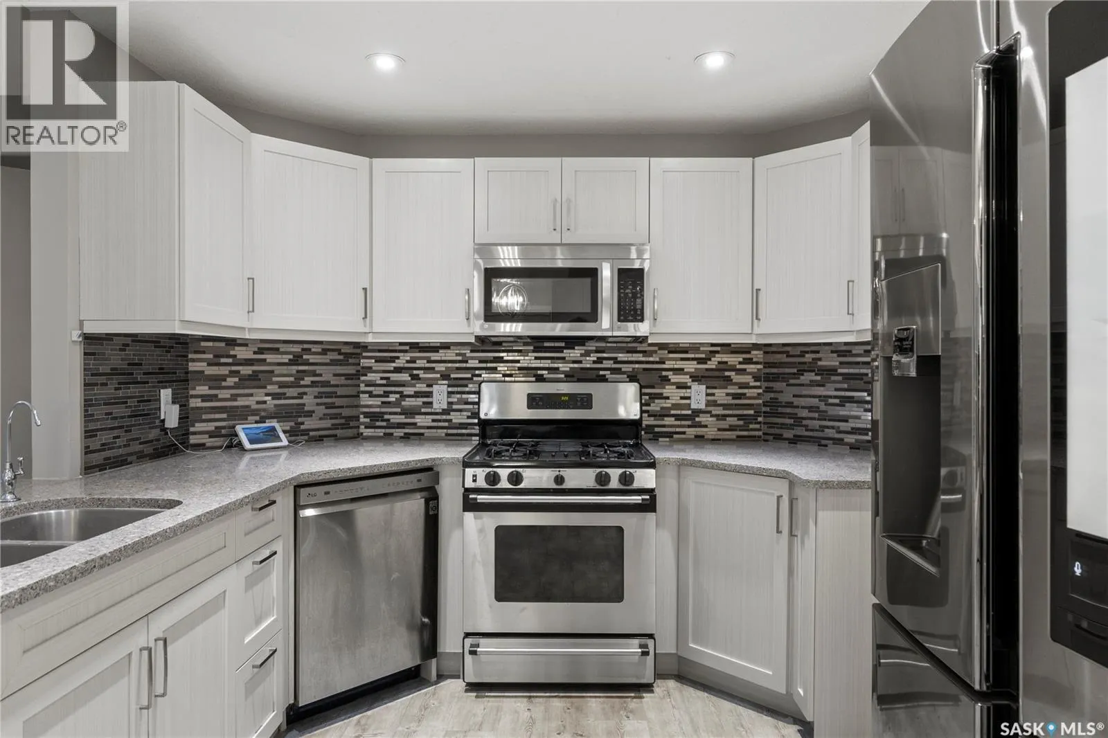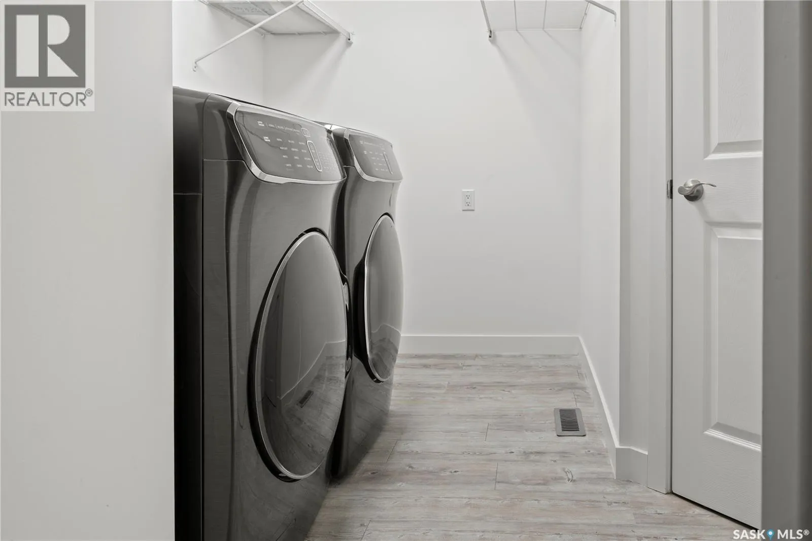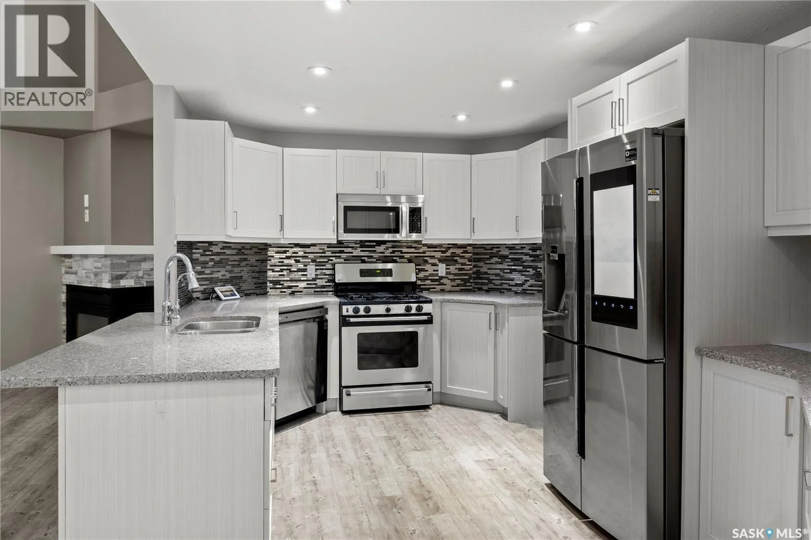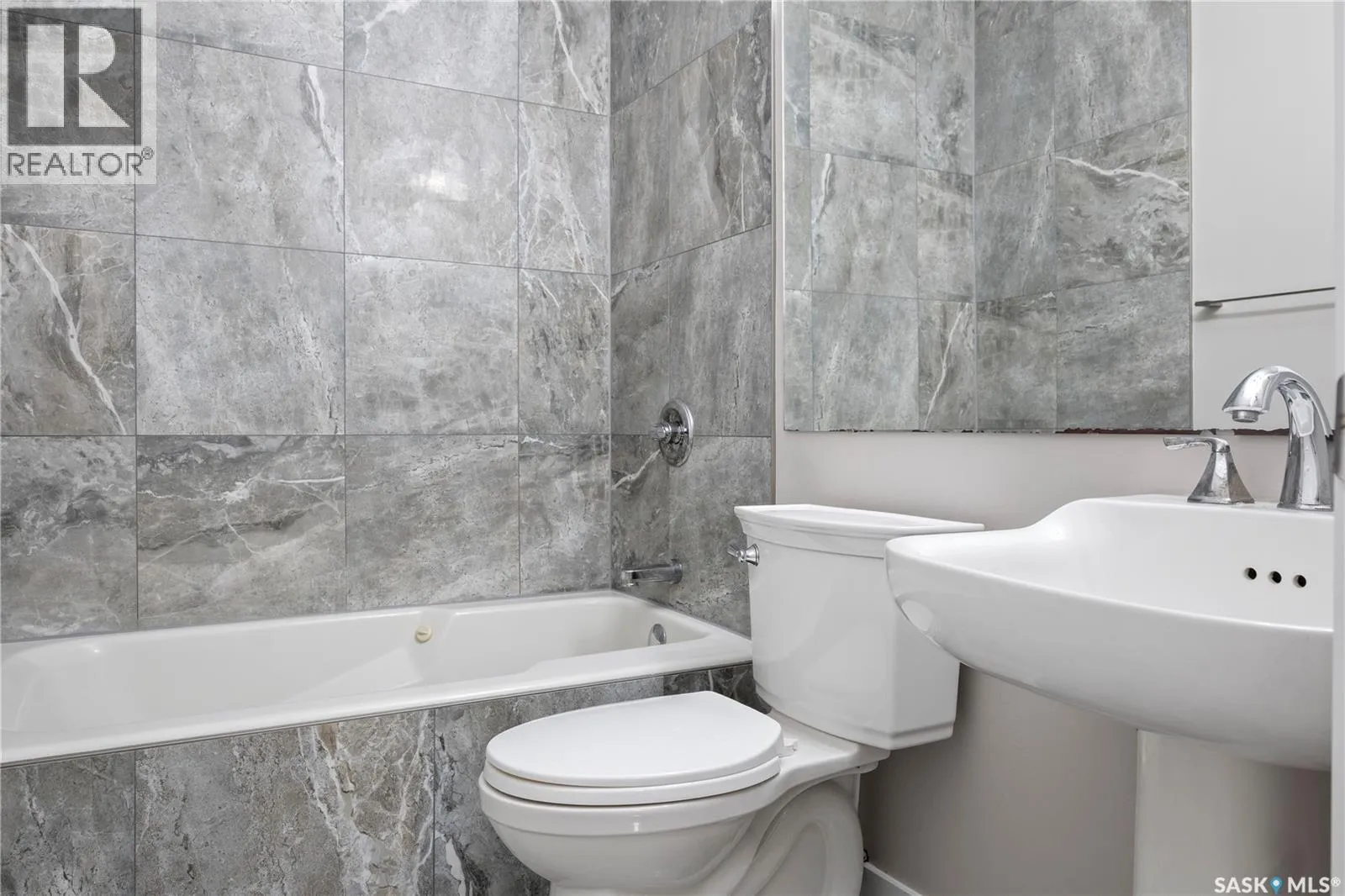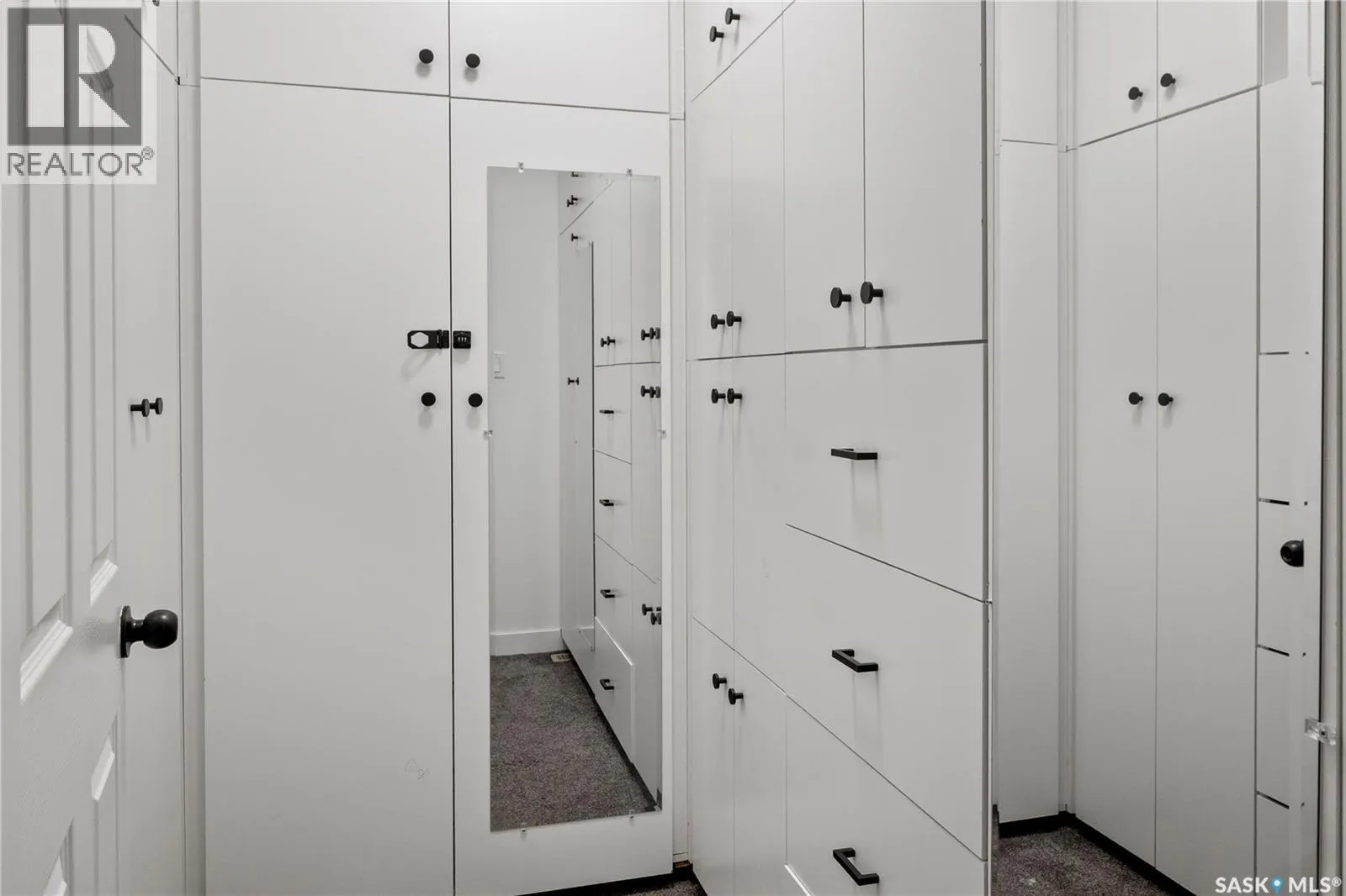 Welcome to 5006 Wascana Vista Court. This former show home is nestled in the sought-after Wascana View neighborhood. This quiet cul-de-sac location backs onto a walking path, offering convenient access to east-end amenities and schools. This two-story split home features 4bd, 3ba, and a spacious 32x24 triple attached insulated garage. The exterior and landscaping are very low maintenance, with a xeriscaped front yard, stucco siding, and a backyard with multiple patio areas and artificial turf. Upon entering, you are greeted by a foyer with 2 closets and tile flooring. A curved staircase descends into the expansive great room, featuring massive windows that provide views of the greenspace. The formal dining room is separated from the great room by a 3 sided gas fireplace. Overlooking the dining room is the updated kitchen, complete with ample cabinet space, quartz countertops, a tile backsplash, and included stainless steel appliances. Next, an additional versatile room can serve as a family room, or reading nook. Adjacent is a main floor bedroom, with natural light from a rear window. The main floor also includes a 2pc bathroom, a large laundry room, and a utility room housing 2 new furnaces and a air conditioner (installed June 2025), a rented water heater, and an r/o system. A storage area completes this level. Ascending a curved staircase, you arrive at a bonus room, located next to the master. The master suite has French doors, expansive windows, a custom-built walk-in closet, and a luxurious 5pc ensuite bathroom with 2 sinks, a jet tub, a custom tile shower, and heated floors. A few more stairs lead to the top floor that has an additional nook, 2 generous bedrooms, and a 5pc bathroom equipped with double sinks and a deep soaker bathtub. The entire home has been recently painted, and significant energy efficiency upgrades were made in 2023, including new shingles and solar panels. Certain photos have been digitally staged and are clearly marked. (id:27476)