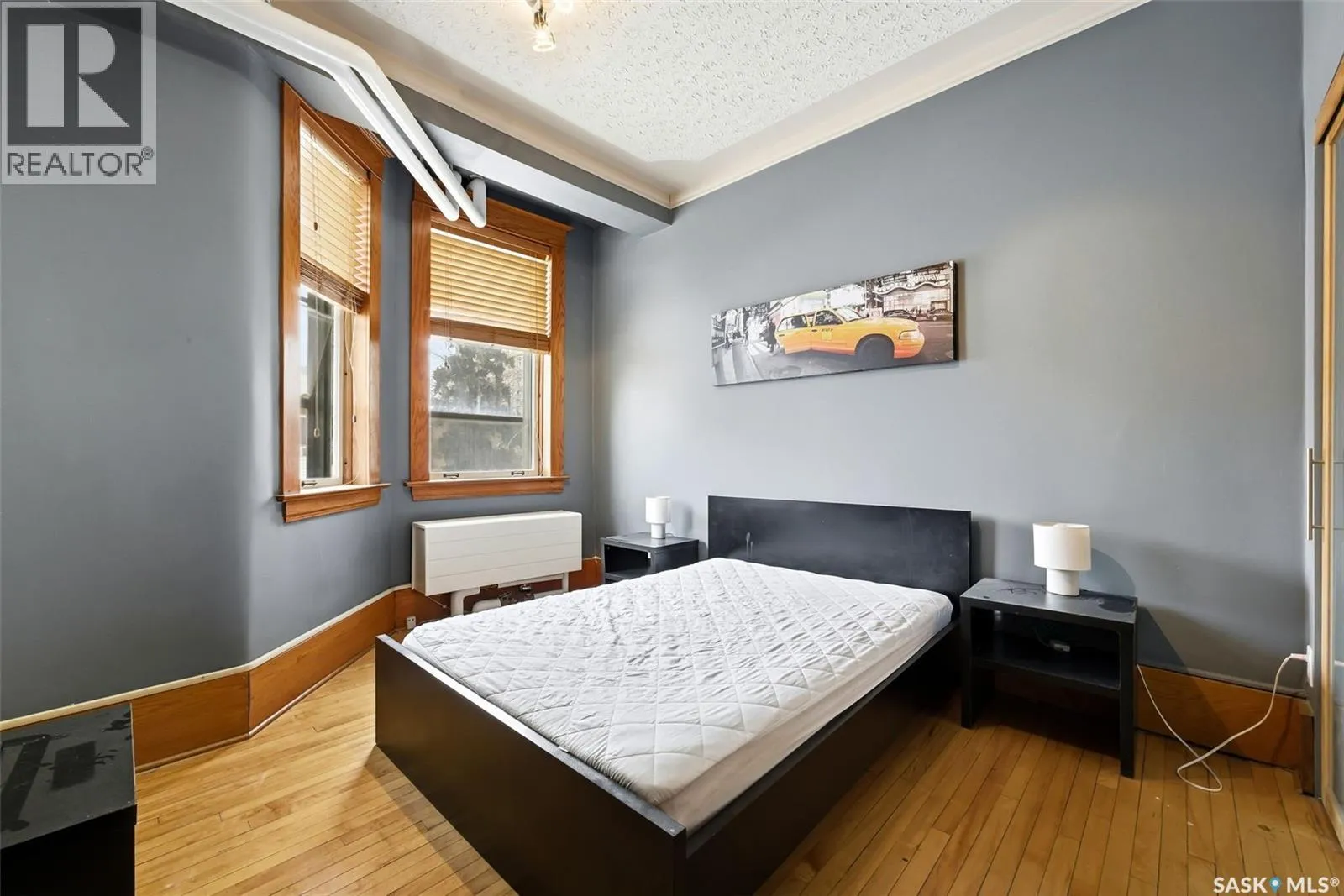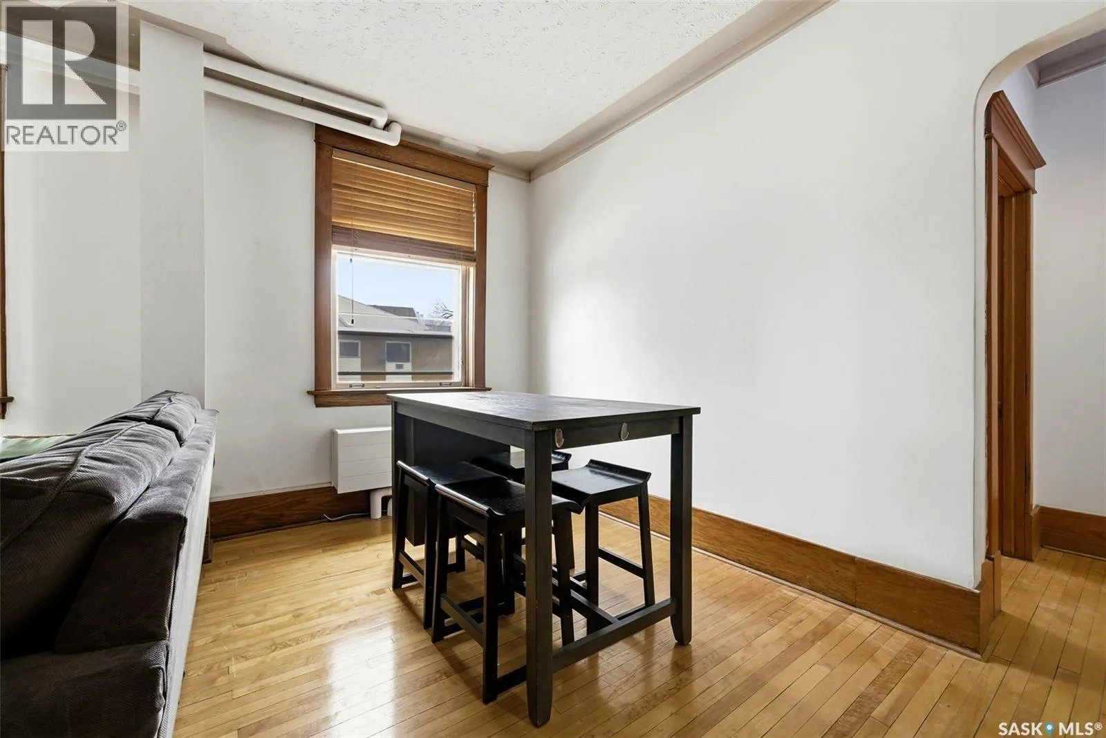 Discover the charm of this two-bedroom condo located in the iconic Bartleman building. Original hardwood floors grace the bedrooms, living room, and formal dining area, creating a warm and timeless atmosphere throughout. The kitchen is both functional and inviting, offering ample cupboard space and direct access to a shared balcony with an exterior staircaseâperfect for unwinding or enjoying summer days. A spacious four-piece bathroom features handy direct access to the primary bedroom which has two generous closets to keep everything organized. Ideally located within walking distance to Downtown, Wascana Park, and the General Hospital, this condo offers comfortable living in an exceptional location. A wonderful opportunity to own a character-filled home in one of the cityâs most desirable neighbourhoods. (id:27476)