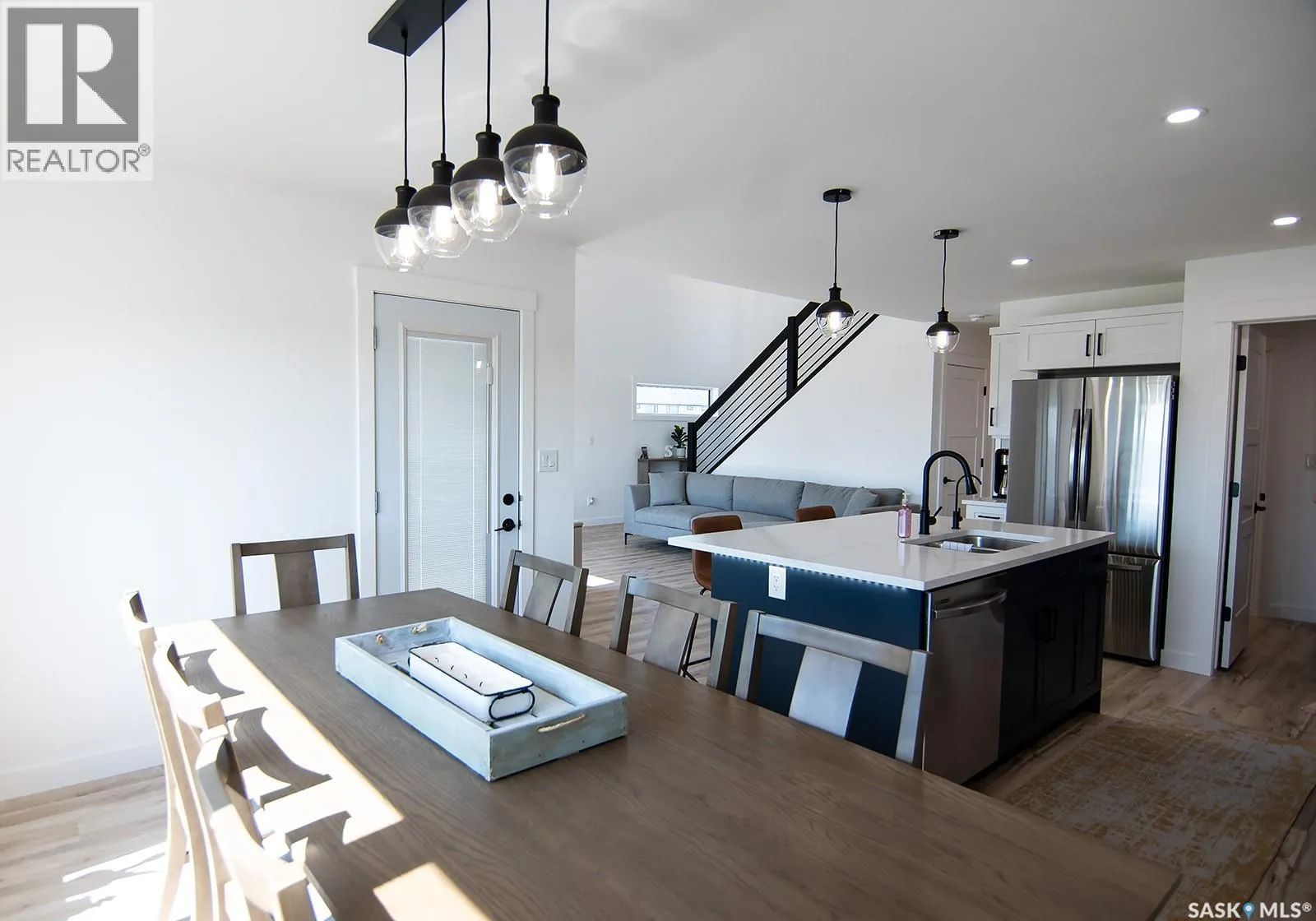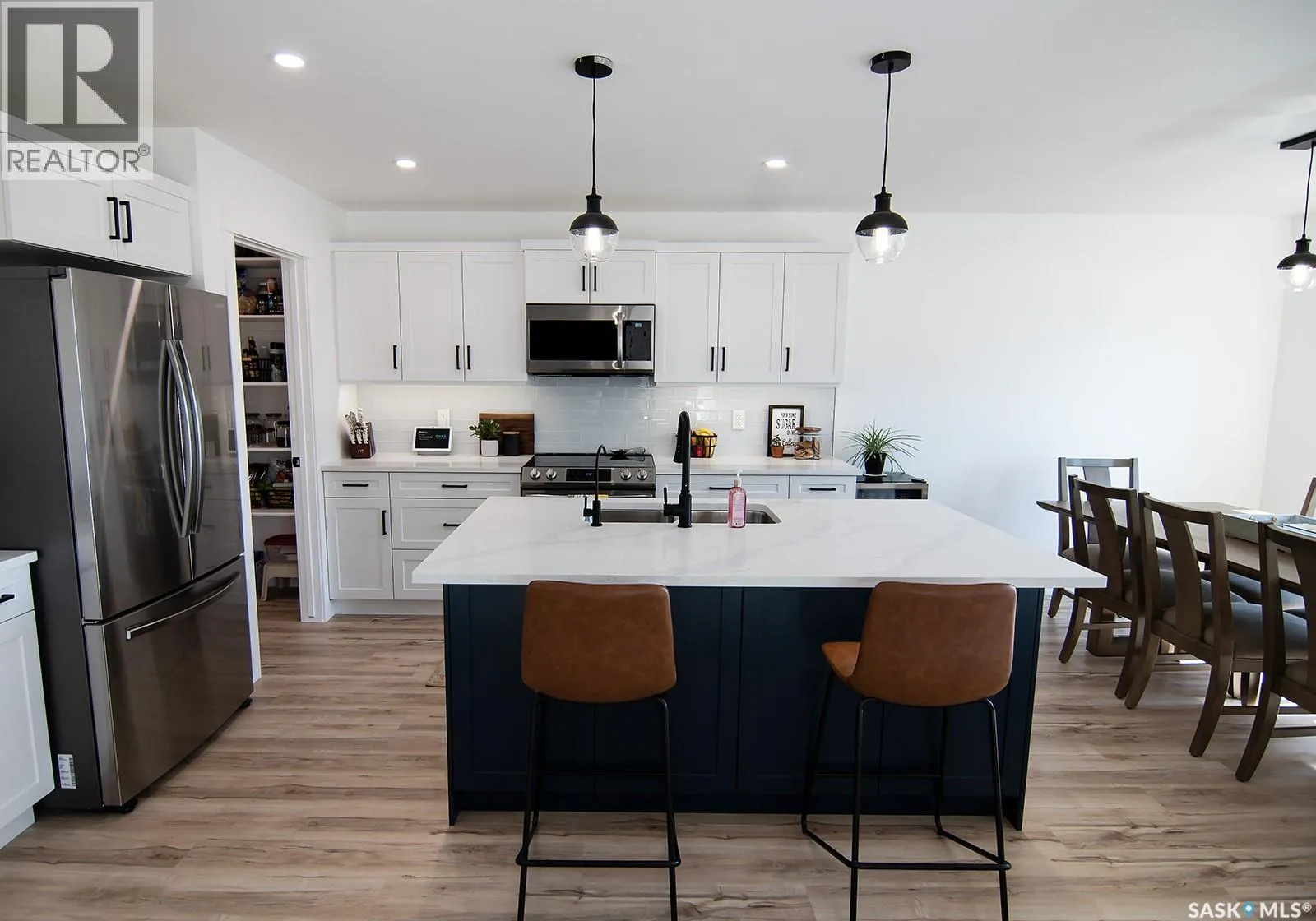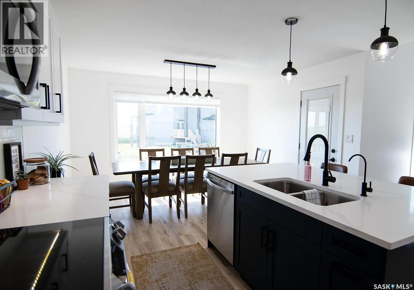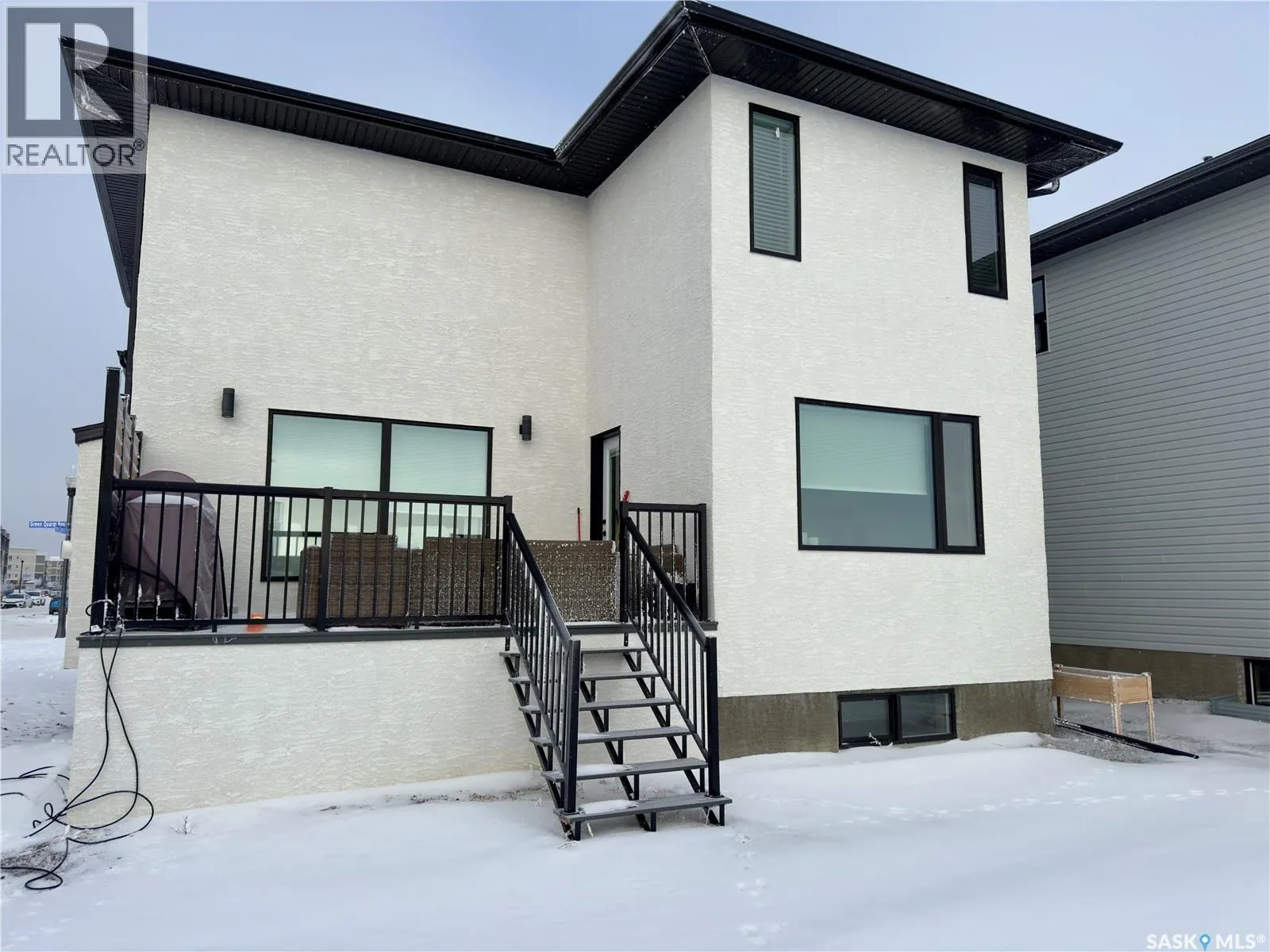 Welcome to this stunning 2-storey custom built home located in the desirable neighbourhood of the Greens on Gardiner! With only one owner and built on piles, this home features a functional layout with modern aesthetic finishes. As you enter the home you are greeted with 17â high ceilings and large windows allowing ample daylight in. The open concept layout makes it perfect for hosting and entertaining family and friends. Making your way through the spacious living room, you will find a kitchen full of stainless steel appliances, two-tone cabinetry with plenty of cabinets, modern backsplash and a walk through pantry for some additional storage. Off the kitchen you have a large size dining area with a door that leads to your spacious 16âx10â deck that has a privacy fence and natural gas hookup. Making your way up the second level you will find three bedrooms and two full bathrooms. The primary bedroom features a nice size walk-through closet to the primary en-suite which offers custom tile work in the shower, and a large vanity with a getting ready seating area. Not far down the hall you also have two very nice sized bedrooms with large windows in each. Some other nice features this home has includes a high-efficiency furnace, water softener, reverse osmosis system, xeriscaped front yard, fully insulated garage, rough in gas hookup and electrical for a future garage heater, triple pane low-e windows throughout, roughed-in plumbing in the basement with the bathroom and a bedroom framed and roughed in electrical in the basement. This home blends comfort and convenience while being in close proximity to schools and all the amenities the Greens has to offer! (id:27476)
