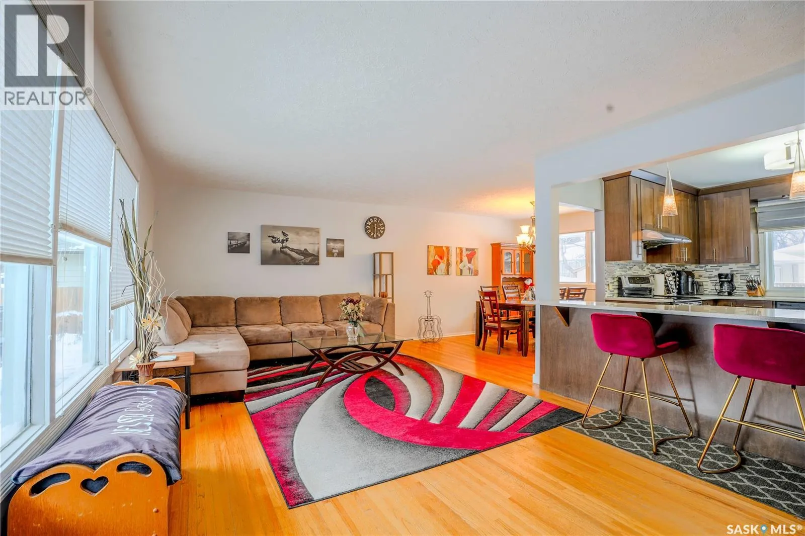 Welcome home to this beautifully upgraded nearly 1,200 sq.ft. bungalow in the heart of Whitmore Park. From the moment you enter, you are greeted by classic hardwood floors spanning the bright living room, dining area, and three spacious main-floor bedrooms. The heart of the home is the fully renovated kitchen, boasting gorgeous dark cabinetry, stainless steel appliances, and a new window. The wall has been opened up to create an inviting eating barâperfect for morning coffee or entertaining guests. The main bathroom has also been refreshed with a modern vanity, ceramic tile, and a deep soaker tub. The lower level offers incredible value and versatility, featuring a separate back entrance for privacy and convenience. This fully finished space includes three additional bedrooms (windows do not meet egress requirements) and a second bathroom. You can buy with confidence knowing the major structural and mechanical items are already done. Updates include a new high-efficiency furnace (2022). The exterior features shingles updated in 2014 and extensive landscaping improvements, including a beautiful brick patio and backyard lawn redone in 2020. With a large lot and City approval for a carport, this home offers the perfect blend of lifestyle, stability, and income potential. (id:27476)