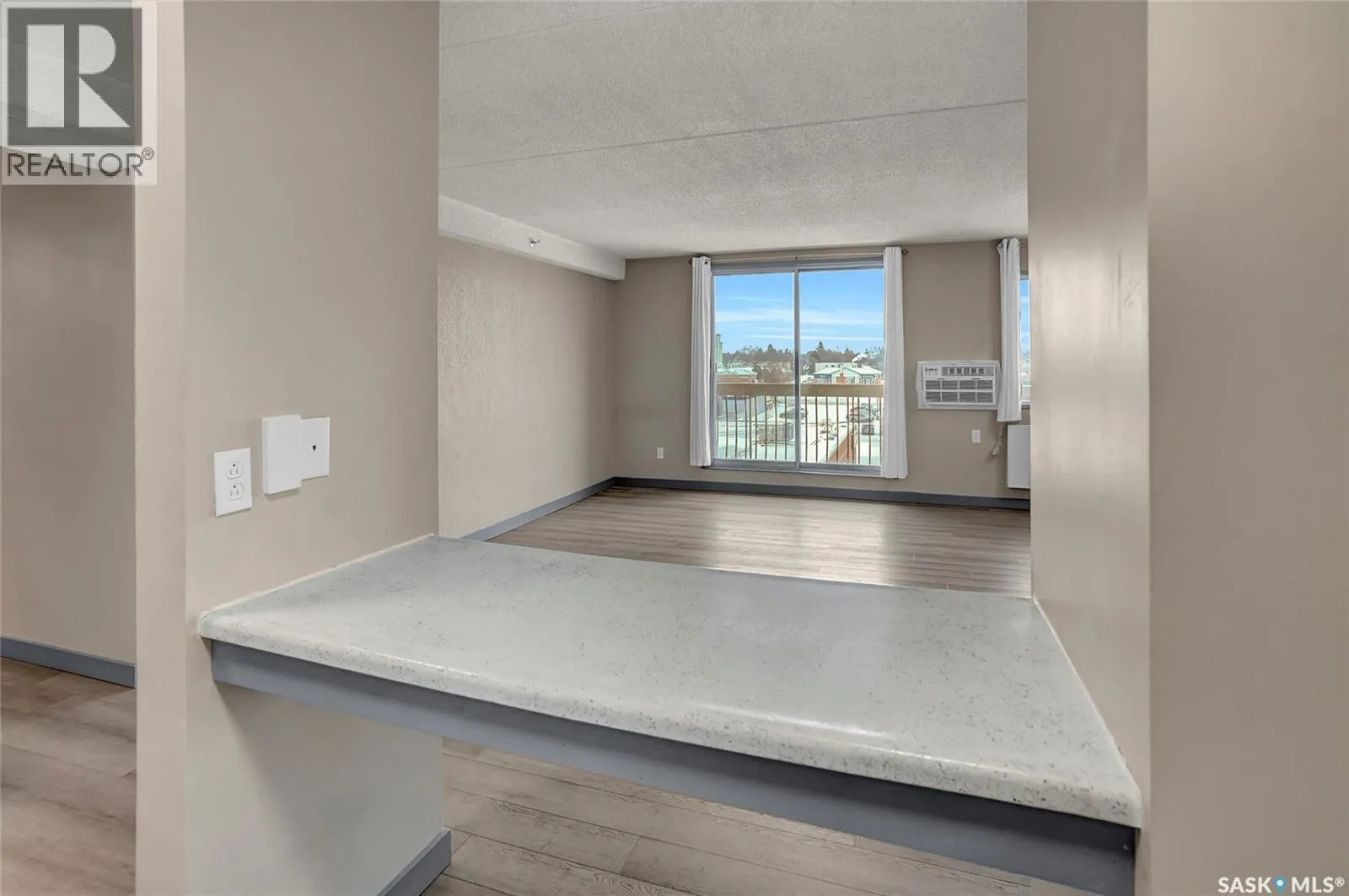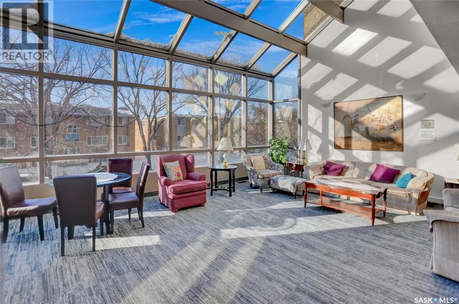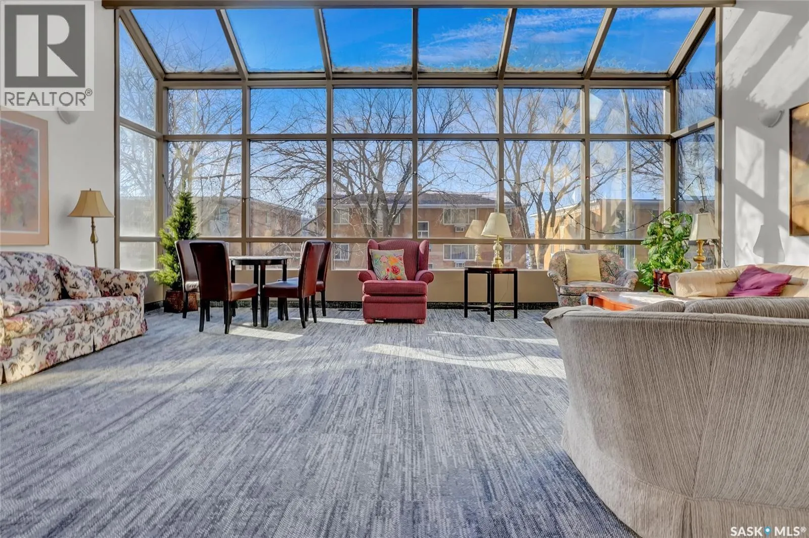 The Atrium Condo Complex, located in a fantastic Southwest area of Regina in Parliament Place is an extremely well-maintained 2 bedroom apartment-style condo that offers both convenience & comfort. Its proximity to shopping, restaurants, & medical clinics makes it an ideal spot for those who enjoy city living. Perfect for 1st time buyers, downsizing & investors. This desirable location & condo complex is constructed from concrete, ensuring security & quietness for all residents. Additionally, it offers various shared spaces such as an amenities room, Atrium lounge on the 2nd floor, an exercise area, visitor parking & common laundry rooms as well is wheelchair accessible w/elevator and underground parking. This unit is situated on the 5th floor and provides great views from its expansive balcony, making it perfect for enjoying summer evenings. Welcome new vinyl floor plank flooring that runs through the unit, creates a seamless connection in the open concept design. The living & formal dining areas enjoy large windows and patio doors to the balcony and are spacious. The dining area opens into the casual dining nook that connects to the galley style kitchen. All appliances are included. The kitchen even has a breakfast bar nook overlooking the living room which adds not only openness but extra workspace. Being one of the larger units in the building, there are 2 bedrooms with the primary bedroom boasting an oversized walk-in closet that offers additional storage space. Completing this unit is a 4pc. bath and a practical storage space which is perfect for pantry items. This condo combines practicality with elegance, making it a desirable choice for anyone looking to enjoy urban living with all the comforts of home in an affordable and prime location. (Some photos for Living, Dining and Bedrooms have been virtually staged to show space and possible furniture arrangements). CLICK ON THE MULTI MEDIA LINK FOR A FULL VISUAL TOUR and call today for a personal tour. (id:27476)
