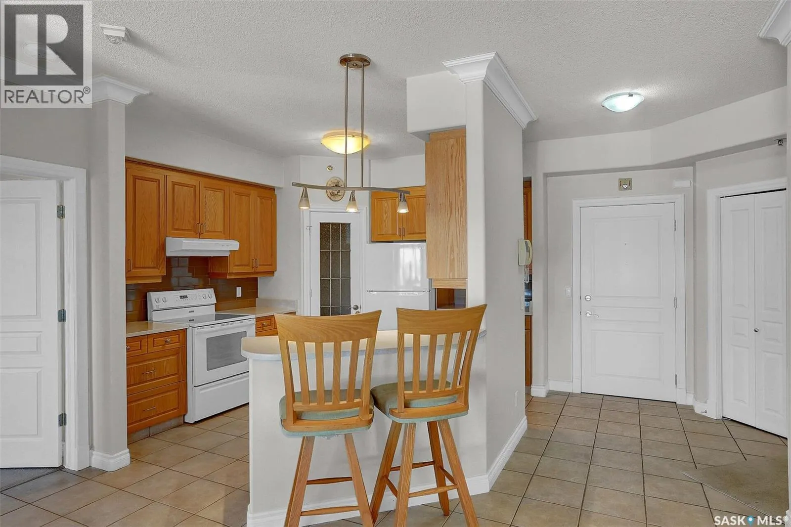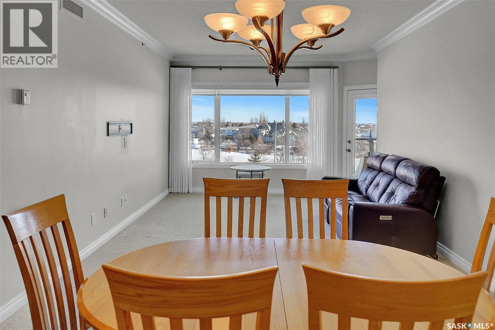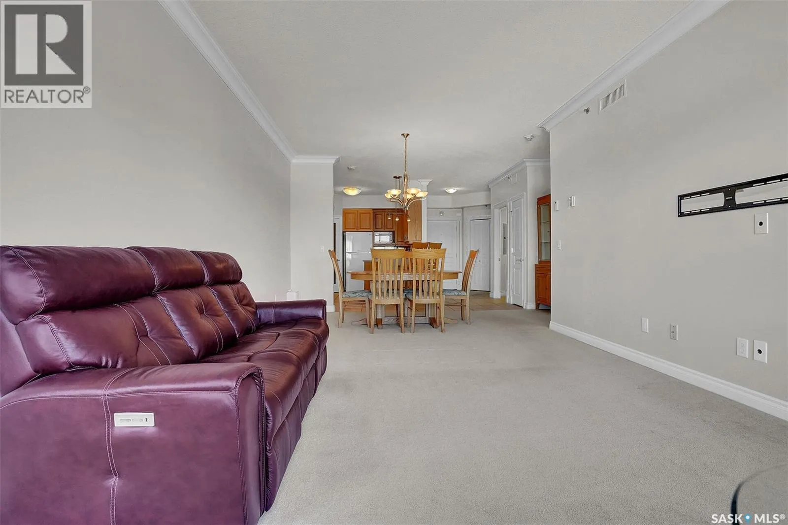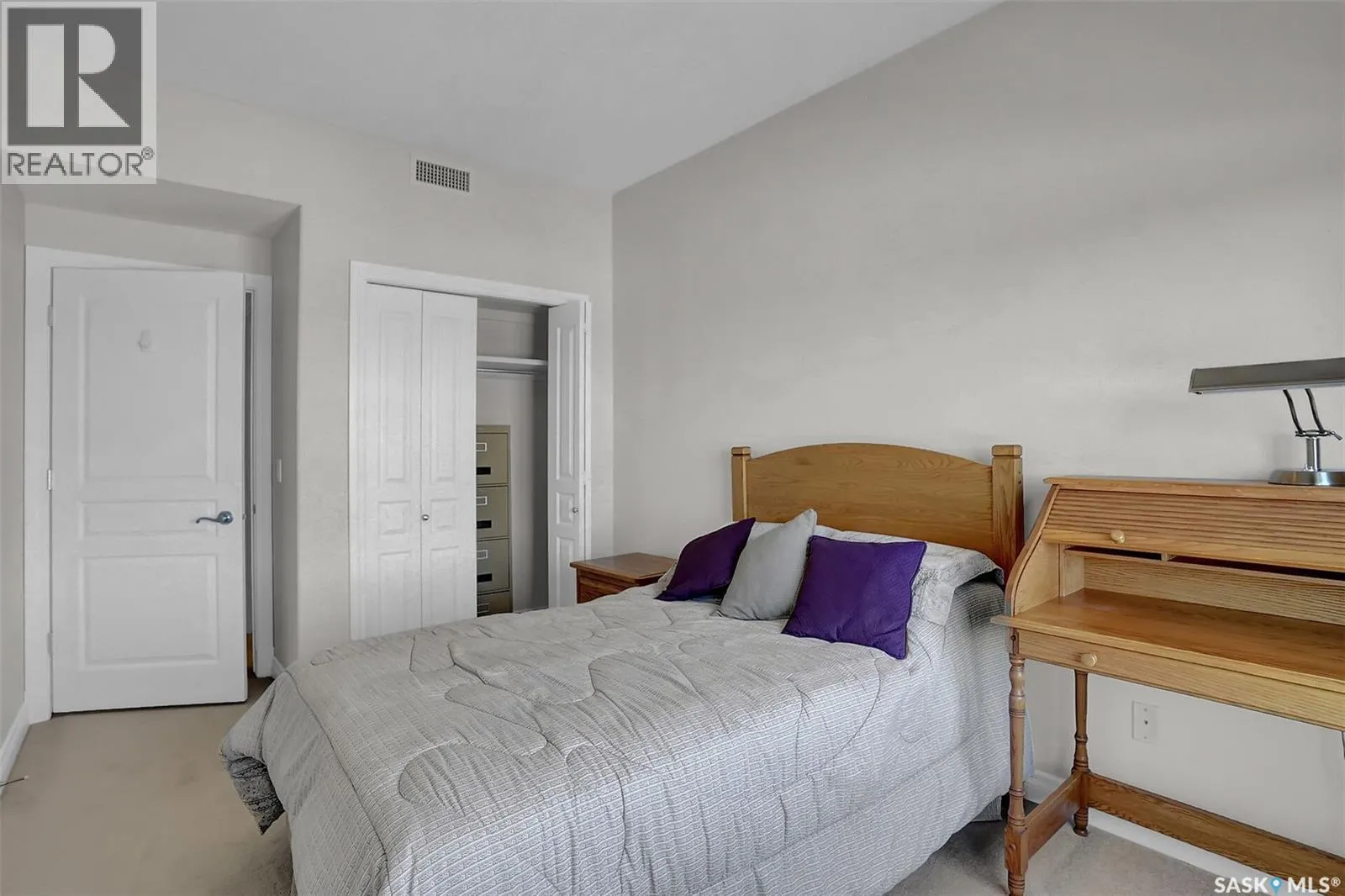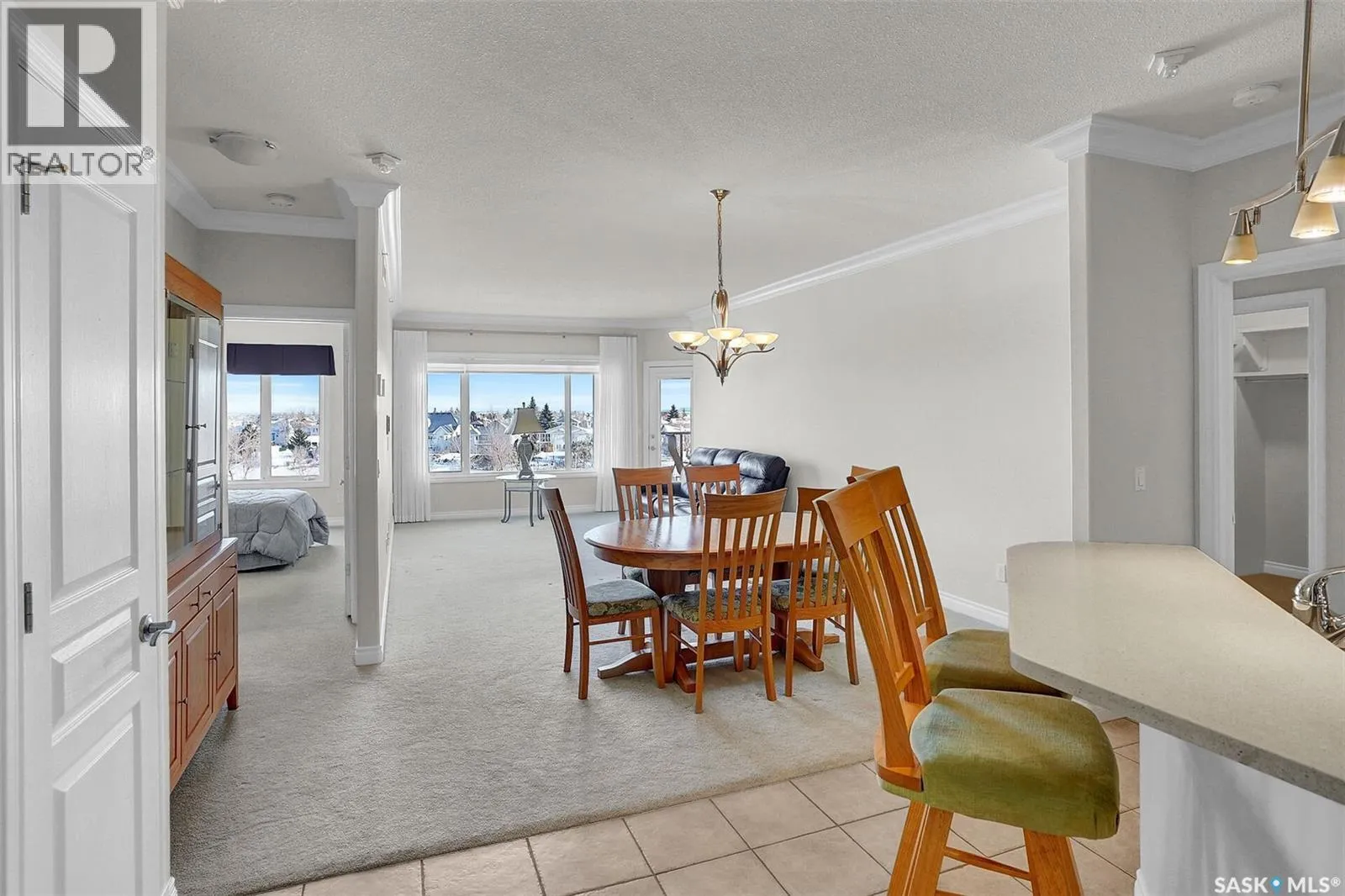 Welcome to this lovely top floor condo that offers 2 spacious bedrooms, 2 bathrooms, and 2 designated parking spots. This condo offers beautiful views of the lake, Sandra Schmirler Leisure Centre, all while being steps away to a coffee shop, library, walking paths, and more. A bright airy condo in an unbeatable location. This spacious and well- designed unit features a fantastic floorplan that is both functional and comfortable. The kitchen is a standout with solid wood cabinets, upgraded granite countertops, ample storage, and a sit up peninsula island â that is perfect for casual dining, and entertaining. The living room and dining area are perfect to relax and enjoy family gatherings. The primary bedroom offers a large walk- in closet and a 4pc ensuite. The 2nd bedroom is spacious and there is a 2nd main 4pc bathroom. You will enjoy the convenience of in suite laundry with storage room. Just off the living area, is access to your private balcony where you can take in the beautiful scenic views, extending your living space outdoors. The condo has been freshly painted and is truly move in ready. There is an additional storage room located on the same floor. The parkade is located on the main floor and includes a wash bay for all residents to use. The building offers a games room, and amenities room. Extremely well maintained, and ready for a new owner, this condo offers an undeniable presence rarely found in the market. Condo fees include: Heat, Water, Sewer, Building Insurance, Common Exterior and Interior maintenance, Lawn Care, Snow Removal and Reserve Fund. (id:27476)