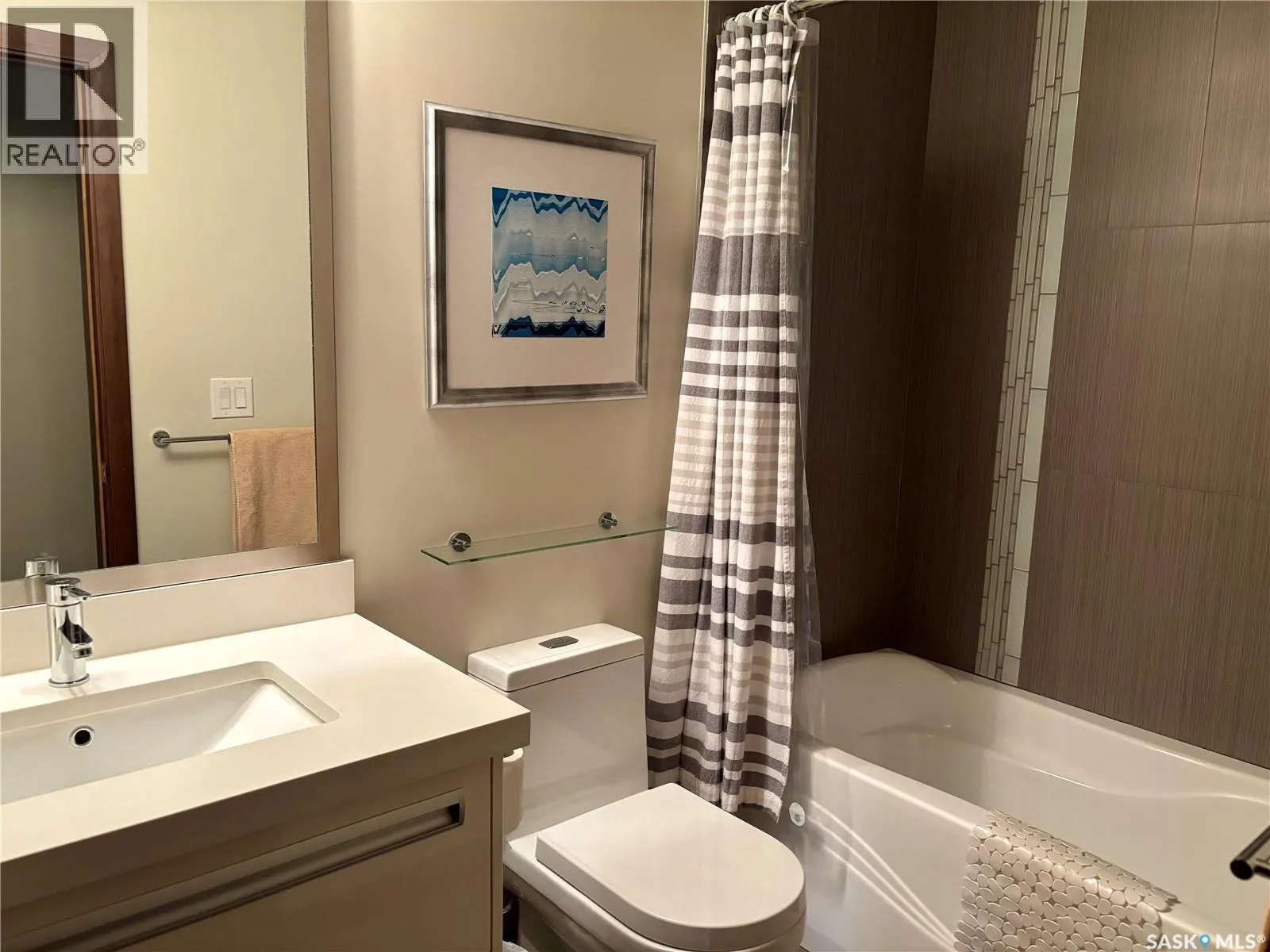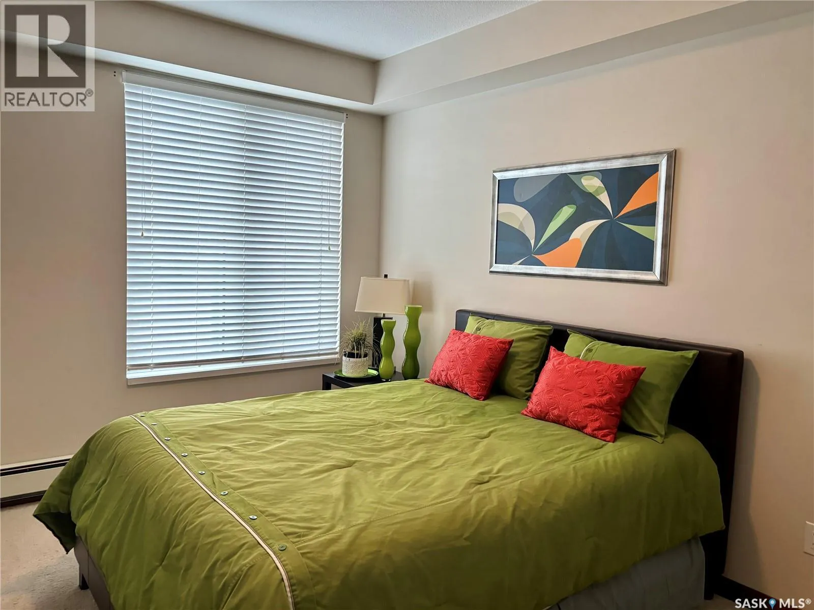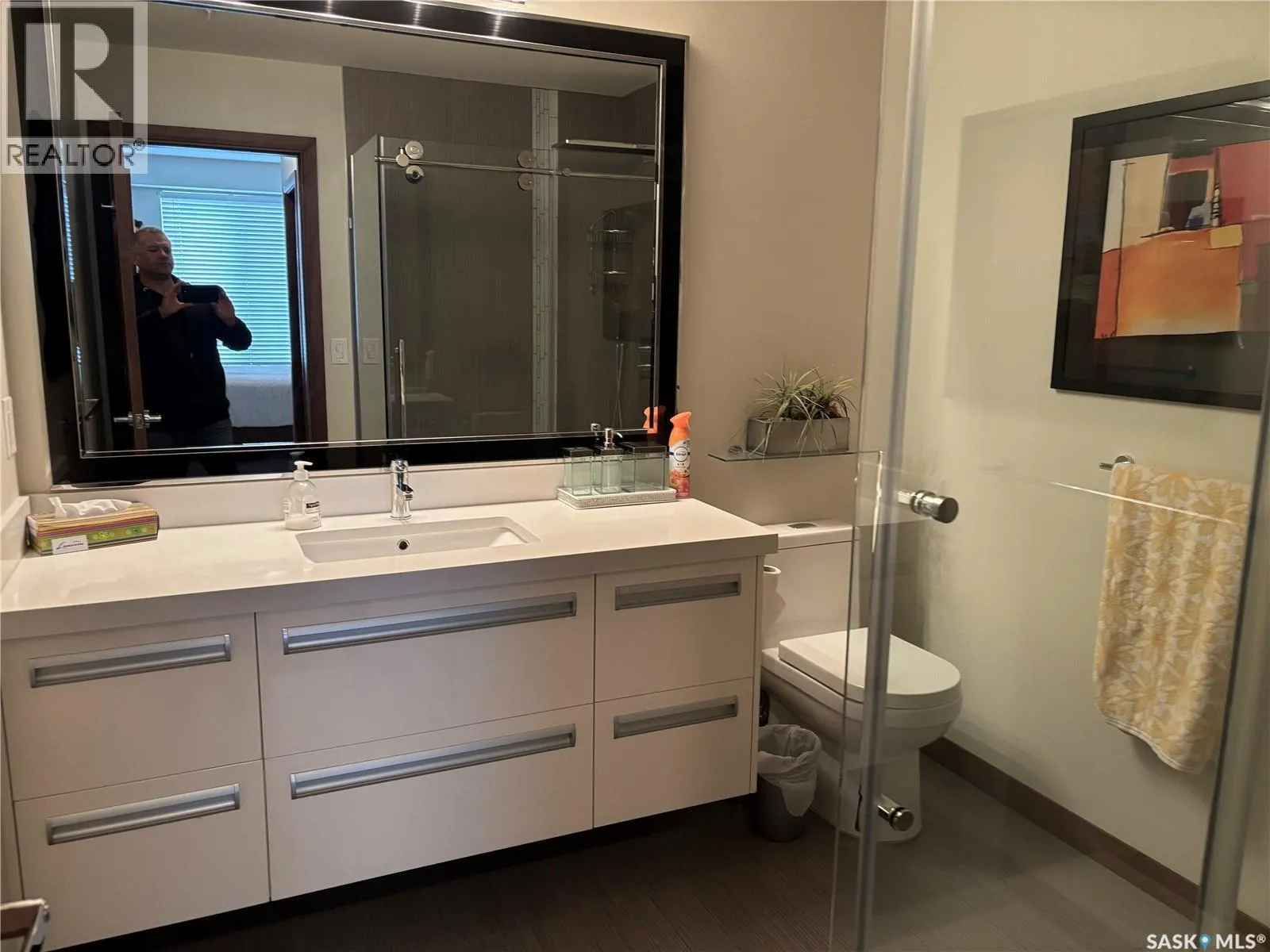 Wow! Here's your chance to own a Mint condition unit in Regina's Exclusive Riverbend district, in the fabulous Aura. Surrounded by water features, you'll love the long list of extras that this Condo offers. 9' Ceilings, Engineered Hardwoods, New York Style cabinets and Quartz Counters accent the Kitchen, with 2 Bedrooms with separate bathrooms off the spacious Living Room. The spacious Master offers plenty of Walk through Closet space and an Elegant Ensuite Bath! Look at the Amenities and compare! Luxurious Indoor pool and Hot Tub, Gym/Exercise Area, Amenities room and Lounge area. This unit includes 1 Surface parking stall. Don't miss out! Call Today! (id:27476)