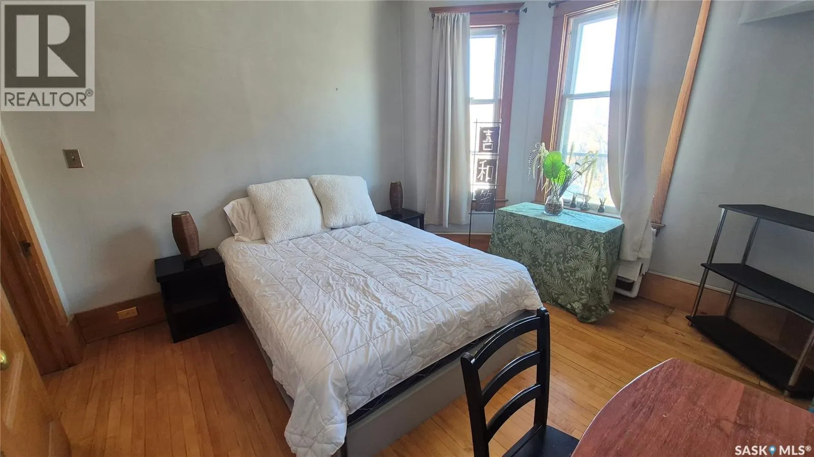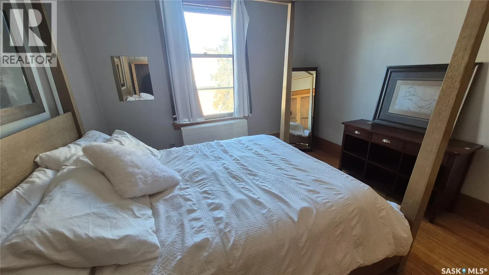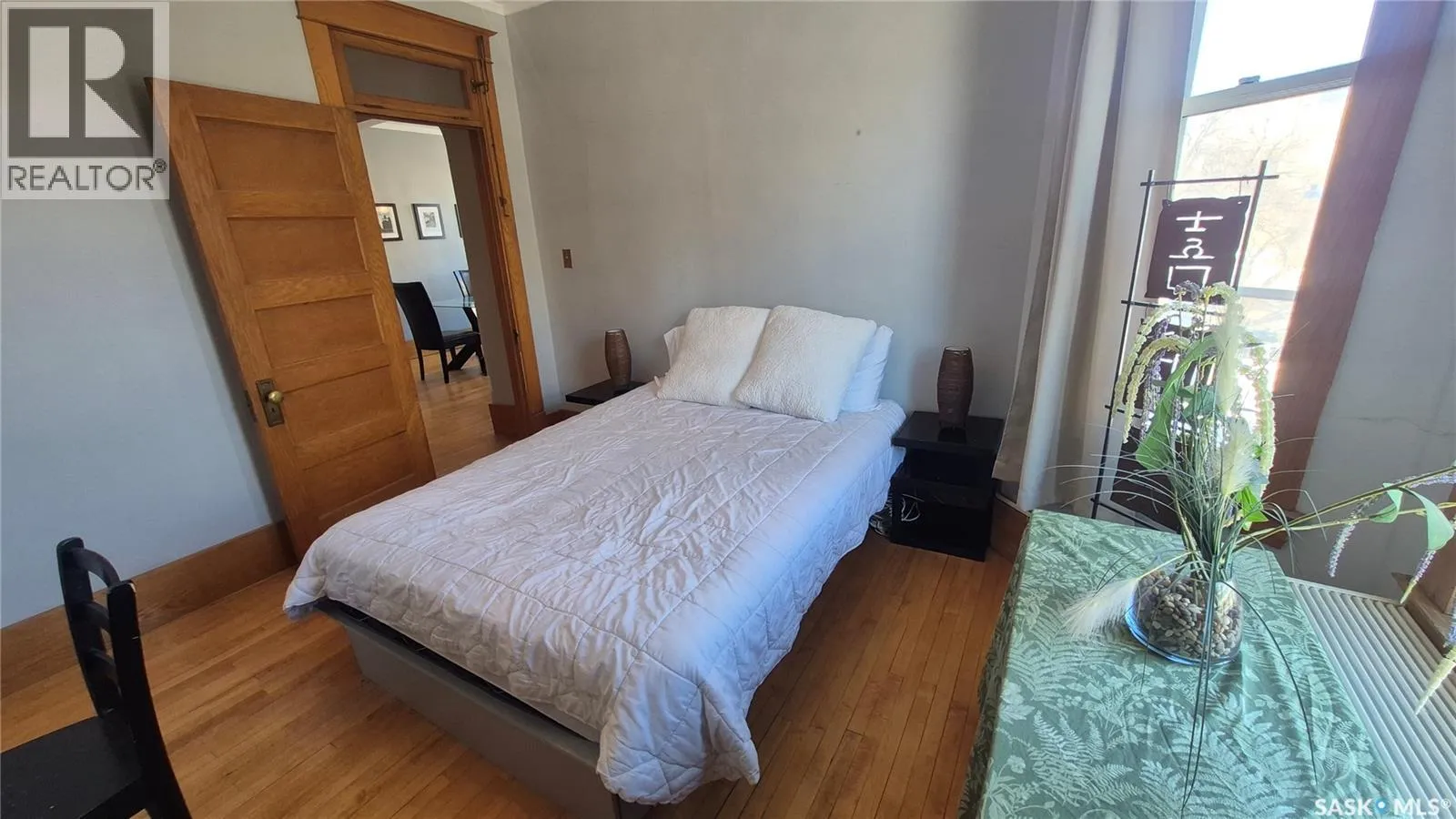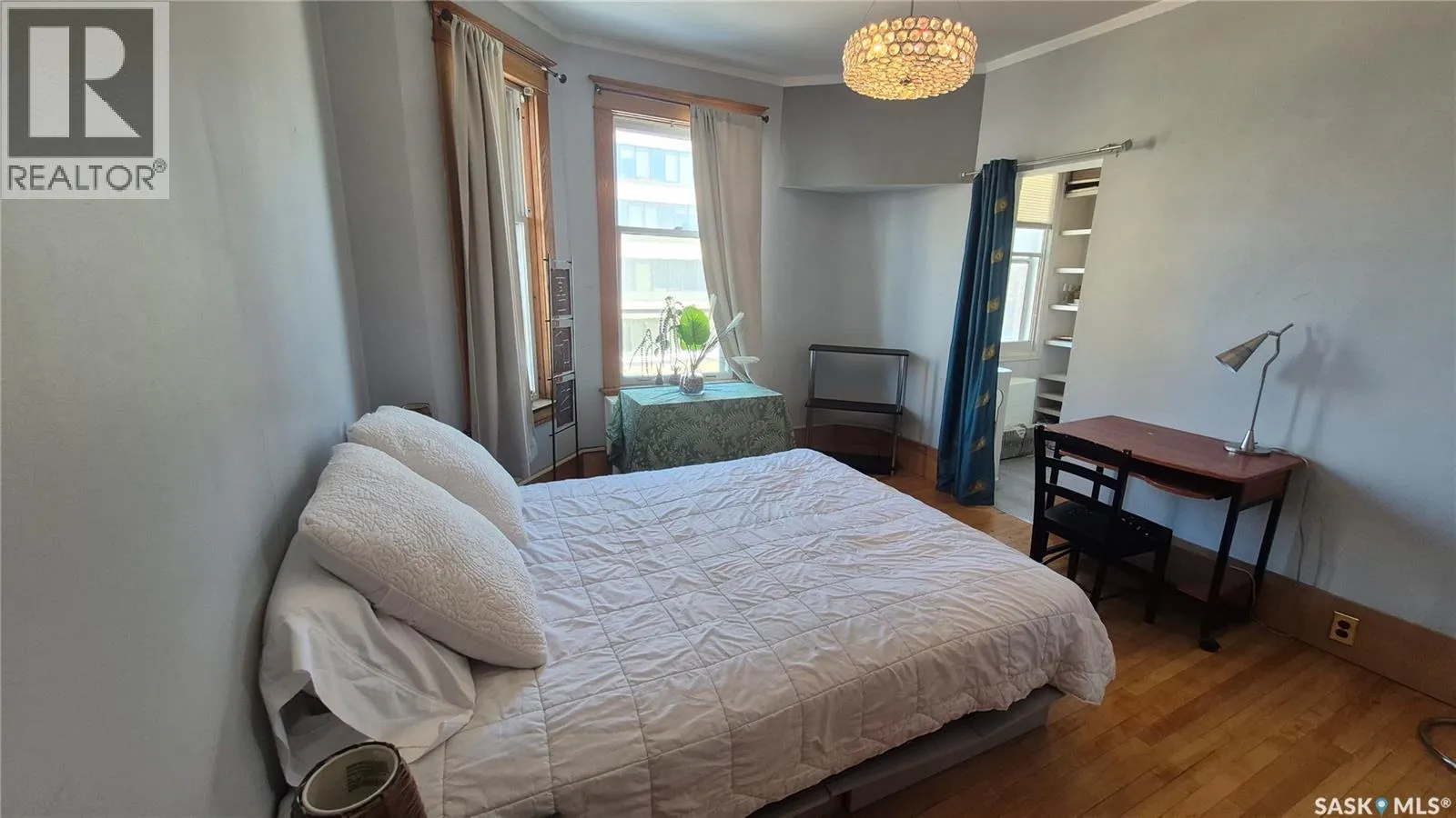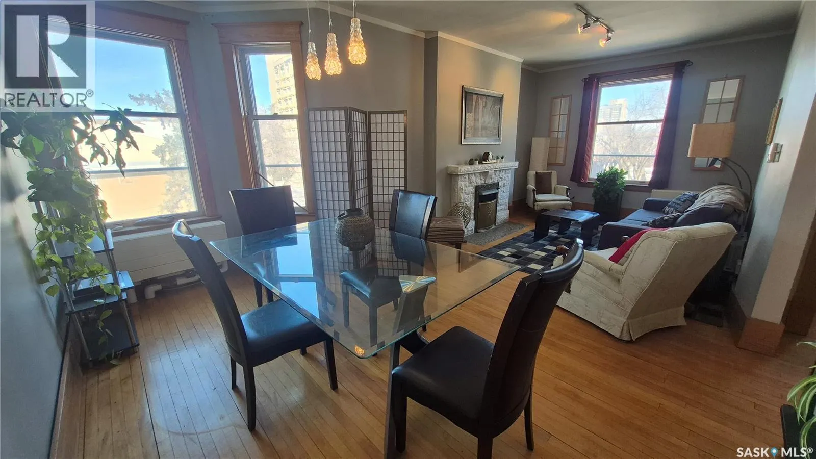 Welcome to this charming top-floor corner-unit condo in the historic Bartleman Building, ideally located in the heart of downtown Regina, just two blocks from beautiful Wascana Park. Offering 889 sq. ft. of living space, this home blends character, comfort, and convenience in a truly walkable location. Step inside to a bright, open-concept living and dining area where extra windows of the corner unit flood the space with natural light, highlighting the homeâs high ceilings and timeless architectural details, including original trim, tall baseboards, and classic doors. Hardwood flooring and a decorative fireplace add warmth and charm, creating an inviting space to relax or entertain. An elegant archway leads to the kitchen. The bright white kitchen provides ample counter space and comes complete with a fridge, stove, built-in dishwasher, and durable vinyl flooring. A garden door extends your living space outdoors to a private patio, the perfect place to enjoy morning coffee or unwind after a long day. The spacious primary bedroom easily accommodates a king-sized bed and is located next to the 4-piece bathroom, which features vinyl flooring, a tiled tub/shower combination, and additional storage. The large second bedroom includes hardwood flooring and a walk-in closet, making it ideal for guests, a home office, or additional living space. Additional highlights include one dedicated parking stall, ample street parking for visitors, and extra storage in the basement. What truly sets this condo apart is the lifestyle it offers. Downtown professionals will appreciate being able to walk to work, enjoy nearby cafés and restaurants, or spend time outdoors at Wascana Park. Local favourites such as Tangerine, Fireside Bistro, Niche Yoga & Therapy, Leoâs OG, the Royal Saskatchewan Museum, and the shops along 13th Avenue are all just minutes away on foot. This is a rare opportunity to own a character-filled condo that's looking for the next perfect owner to call it home! (id:27476)