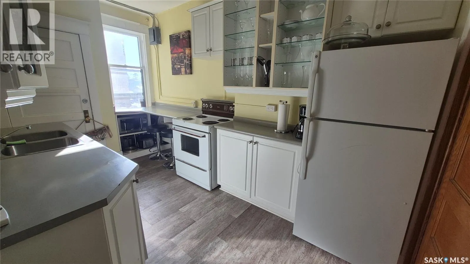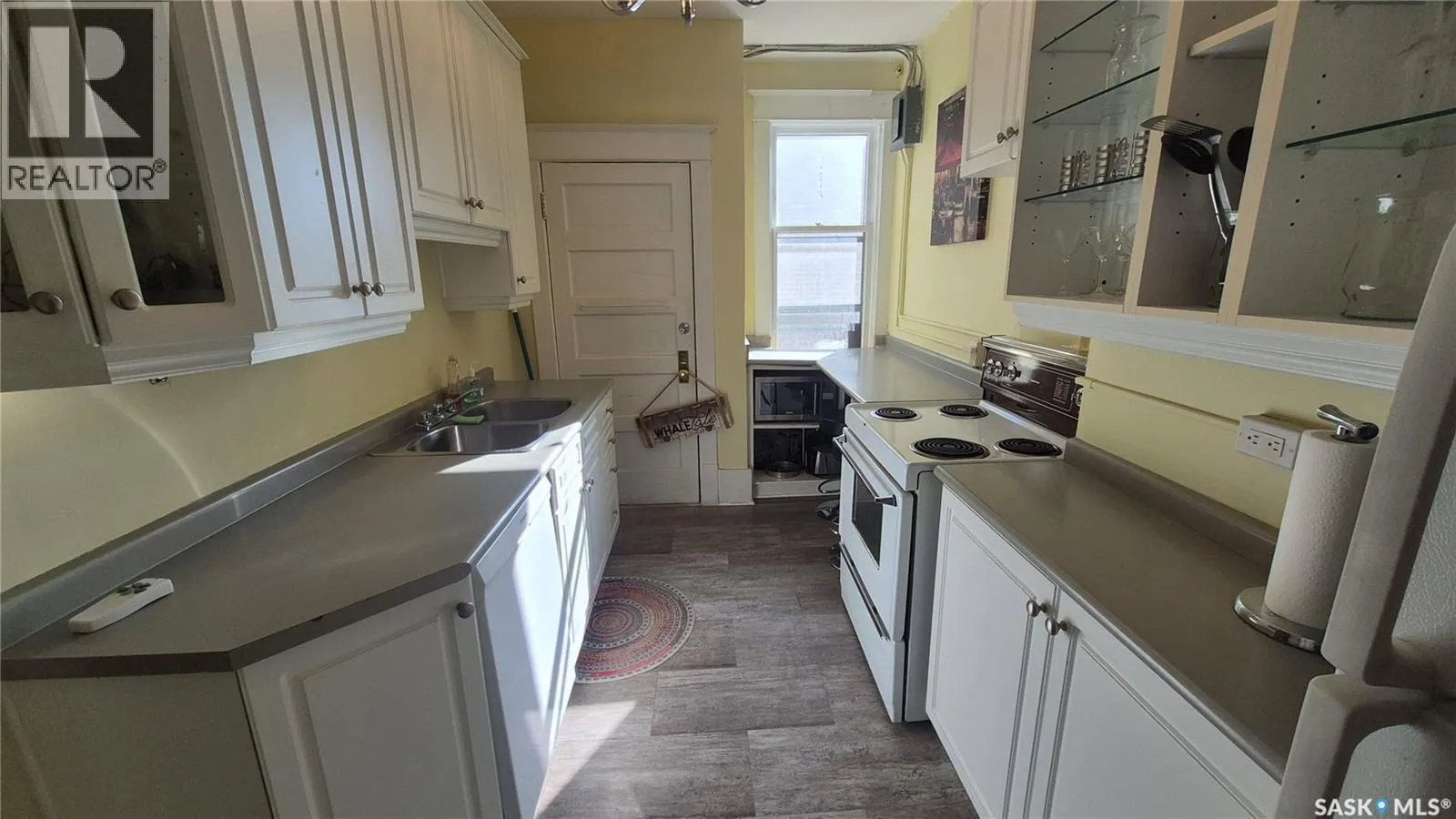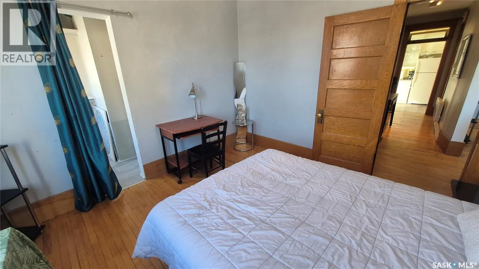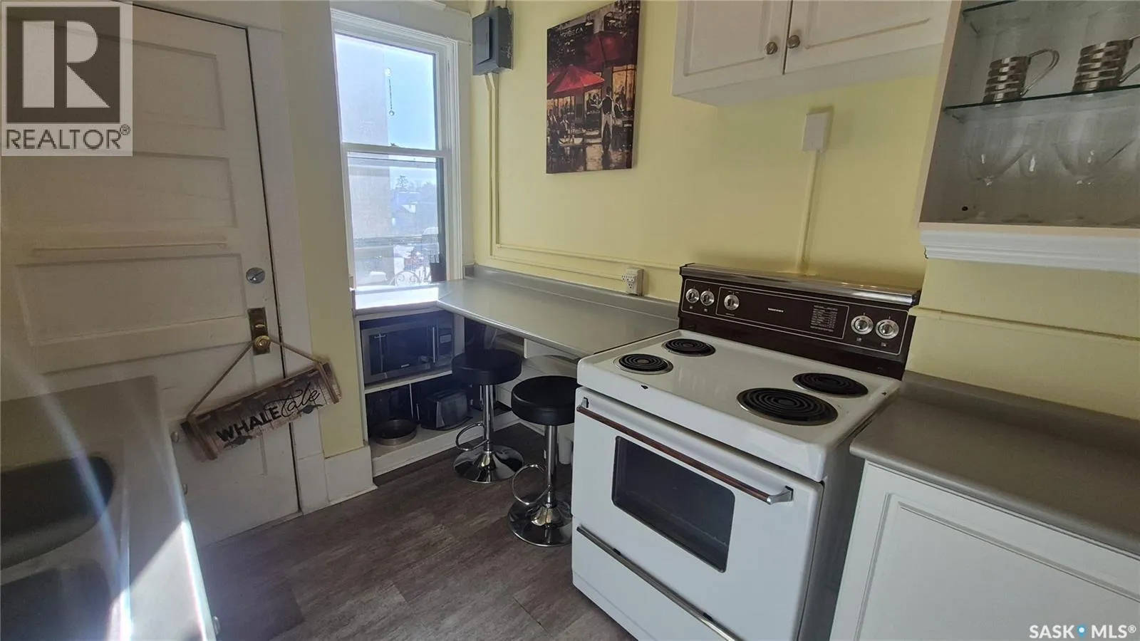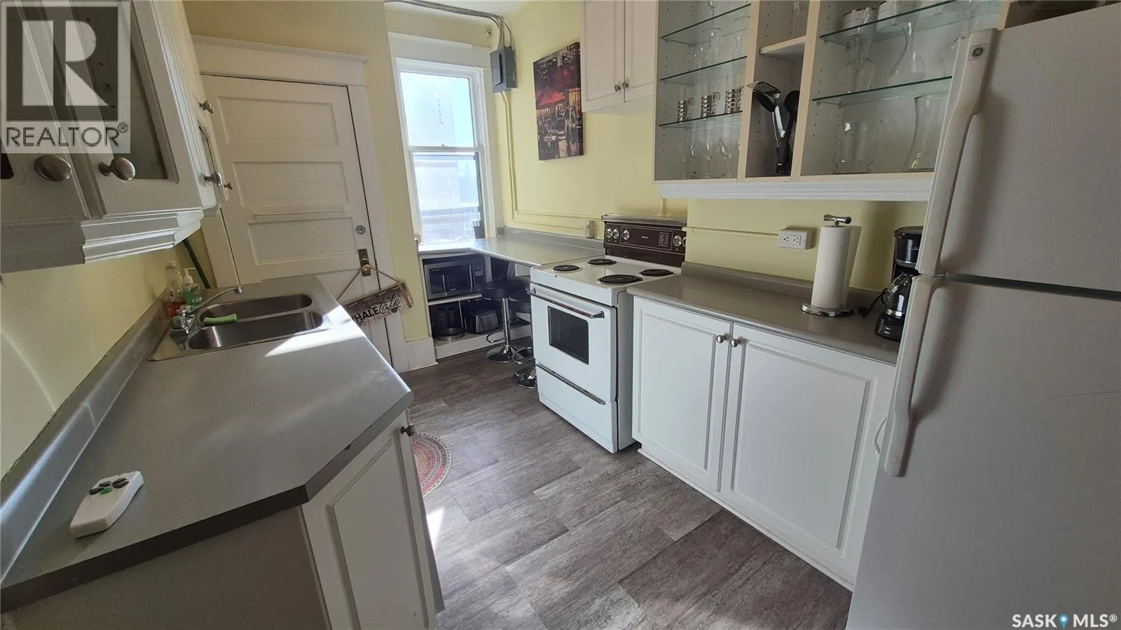 Welcome to this charming top-floor corner-unit condo in the historic Bartleman Building, ideally located in the heart of downtown Regina, just two blocks from beautiful Wascana Park. Offering 889 sq. ft. of living space, this home blends character, comfort, and convenience in a truly walkable location. Step inside to a bright, open-concept living and dining area where extra windows of the corner unit flood the space with natural light, highlighting the homeâs high ceilings and timeless architectural details, including original trim, tall baseboards, and classic doors. Hardwood flooring and a decorative fireplace add warmth and charm, creating an inviting space to relax or entertain. An elegant archway leads to the kitchen. The bright white kitchen provides ample counter space and comes complete with a fridge, stove, built-in dishwasher, and durable vinyl flooring. A garden door extends your living space outdoors to a private patio, the perfect place to enjoy morning coffee or unwind after a long day. The spacious primary bedroom easily accommodates a king-sized bed and is located next to the 4-piece bathroom, which features vinyl flooring, a tiled tub/shower combination, and additional storage. The large second bedroom includes hardwood flooring and a walk-in closet, making it ideal for guests, a home office, or additional living space. Additional highlights include one dedicated parking stall, ample street parking for visitors, and extra storage in the basement. What truly sets this condo apart is the lifestyle it offers. Downtown professionals will appreciate being able to walk to work, enjoy nearby cafés and restaurants, or spend time outdoors at Wascana Park. Local favourites such as Tangerine, Fireside Bistro, Niche Yoga & Therapy, Leoâs OG, the Royal Saskatchewan Museum, and the shops along 13th Avenue are all just minutes away on foot. This is a rare opportunity to own a character-filled condo that's looking for the next perfect owner to call it home! (id:27476)