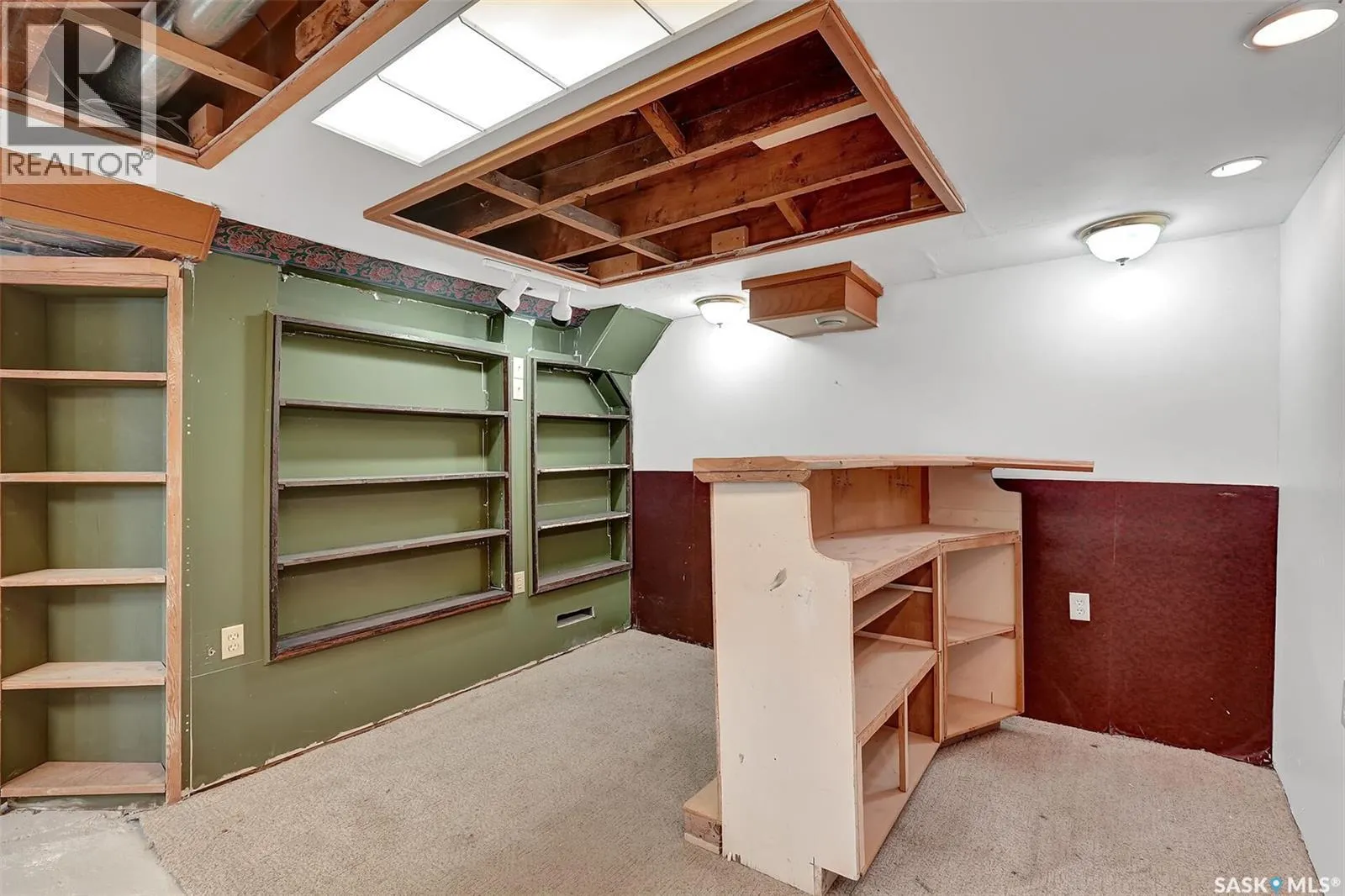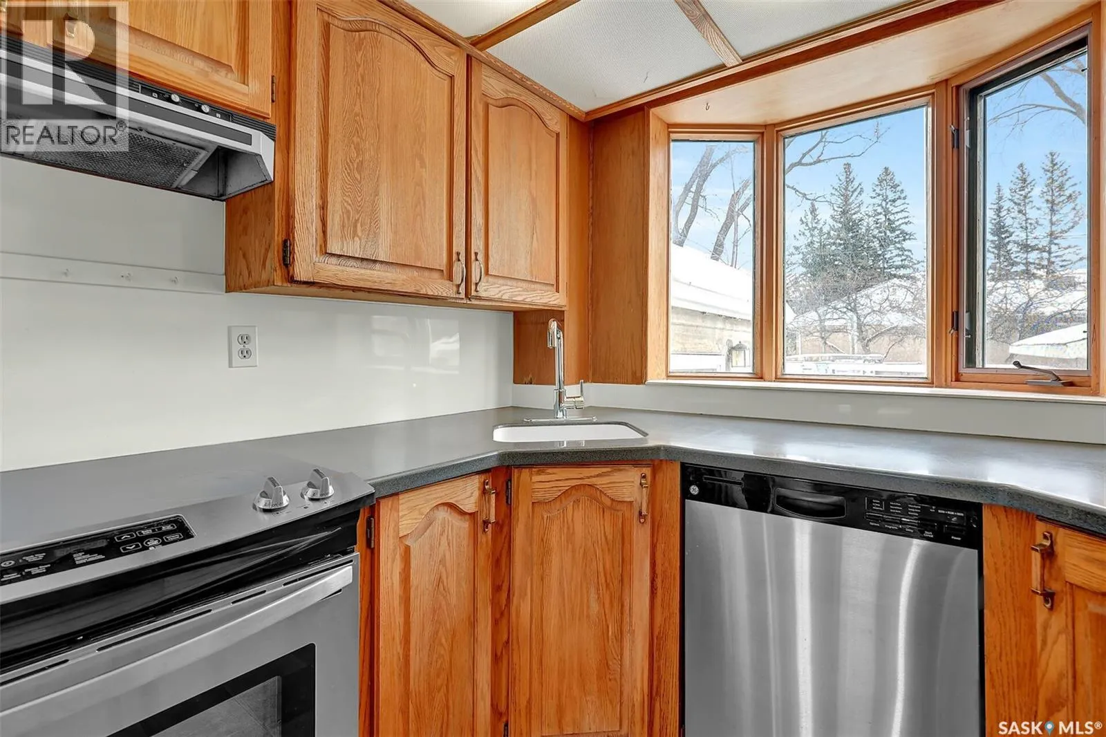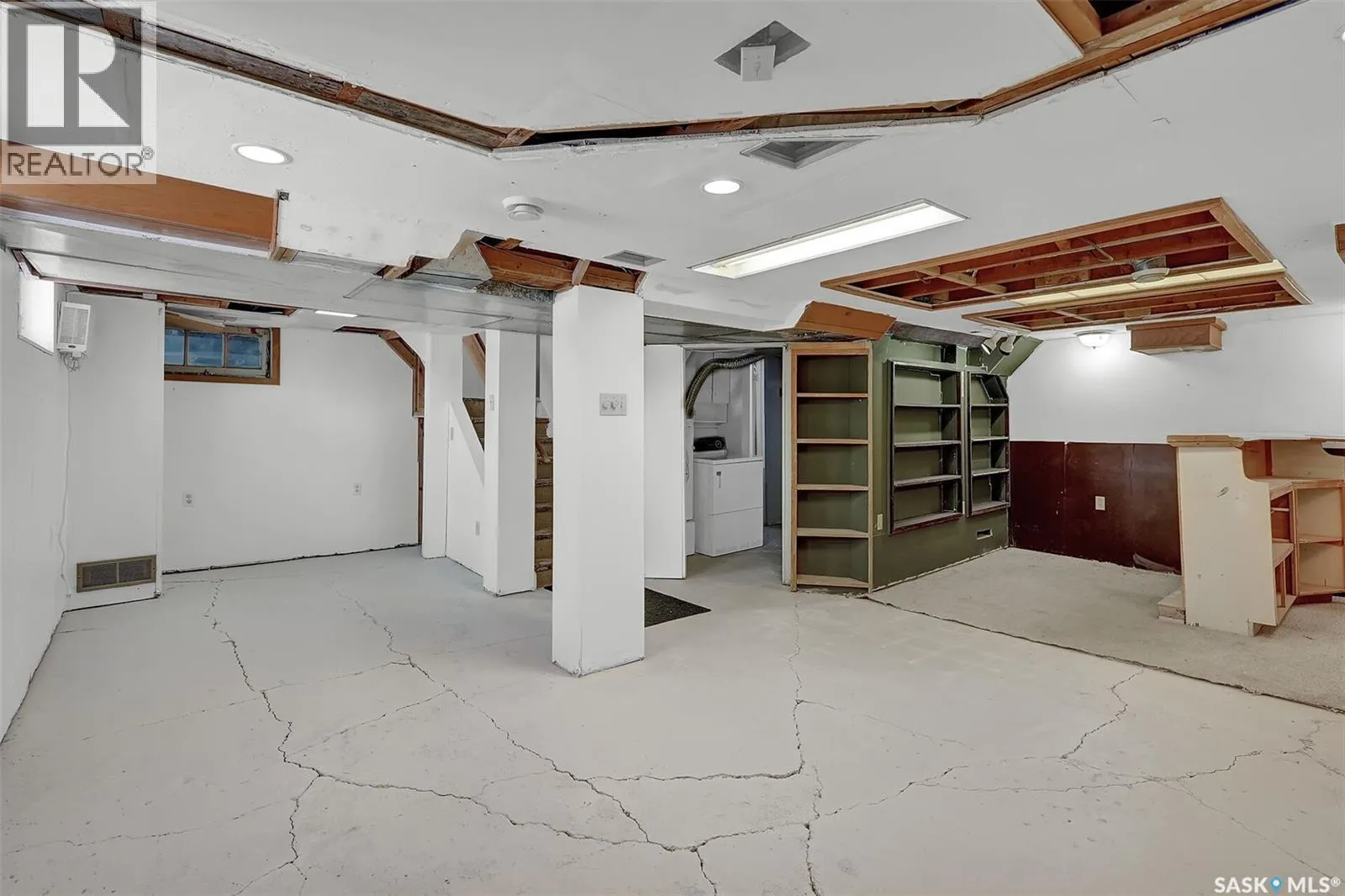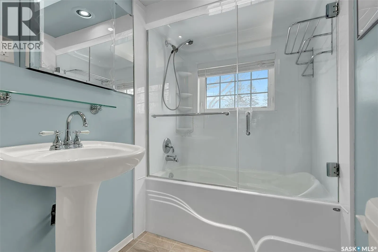 Welcome to this charming one-and-a-half-storey home set on a double-sized corner lot with access from both Broad Street & 6th Avenue North. This 1945 classic blends character, light & versatilityâoffering a layout that can adapt to many lifestyles. The exterior has been base-coated & ready to personalize. Inside you are greeted by a spacious front entry that opens into the bright living room & lovely sightline toward the kitchen. Natural light pours into this home from every direction thanks to updated windows throughout (excluding the kitchen). The living room features a picture window & flows seamlessly to the L-shaped dining area, where garden doors lead outside. Hardwood under carpet. The U-shaped kitchen provides excellent cabinet & counter space, along with a garden window overlooking the backyardâperfect for plants or simply enjoying the view. A cozy nook off the kitchen serves perfectly as a small eating area or workspace. Upstairs, a generous landing window brightens the staircase. The crisp renovated main bathroom includes a glass tub door & convenient access to a walk-in cedar closet with built-in shelving and storage space. The two upstairs bedrooms are both very good sizes, each featuring two windows, built-in desks tucked into the dormer spaces, ample closet storage & access to additional attic storageâclassic character. A French door leads to the back entry and the enclosed back porch with drywalled walls and electrical plug.. The basement stairs are wide and comfortable leading to bright open space ready for your personal touch. There is a functional 3-piece bath & laundry area. The yard is expansive with a deck, walking path, decorative dividers with glass inserts, mature trees, fire-pit area, single garage & plenty of parking. Sidewalk on 6th Ave N was made accessible to back yard. Located close to public transit, schools, shopping, and everyday amenities, this is a home that welcomes you âand invites you to make it your own. As per the Sellerâs direction, all offers will be presented on 03/03/2026 12:01AM. (id:27476)