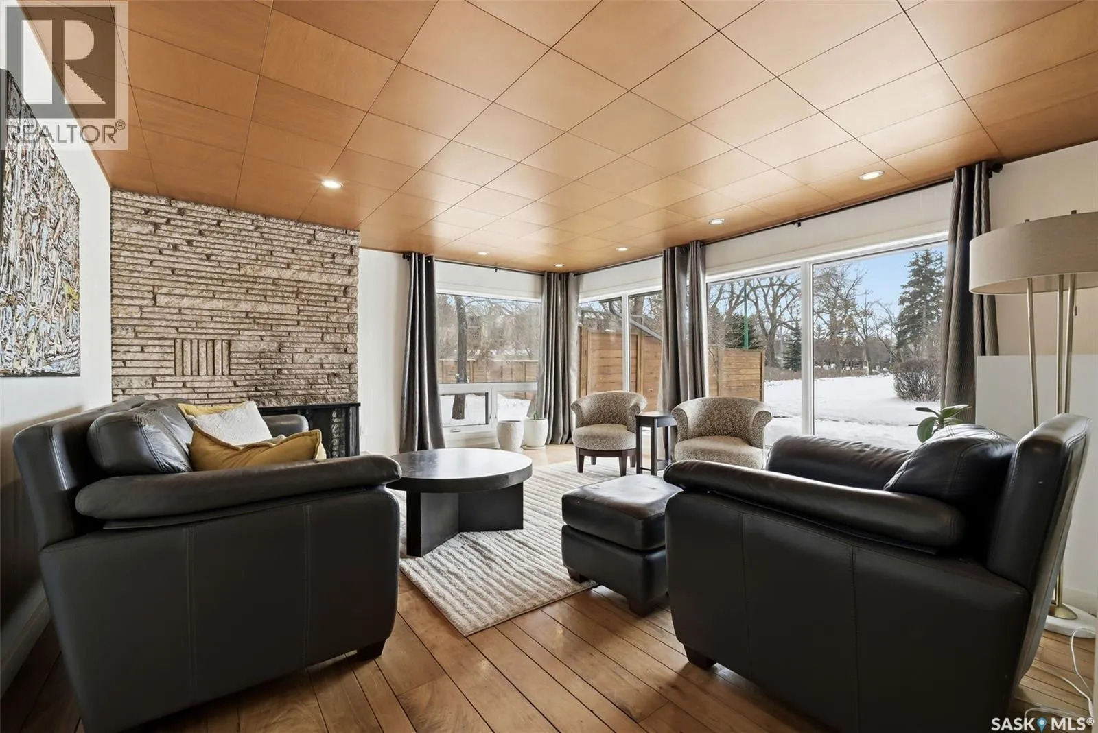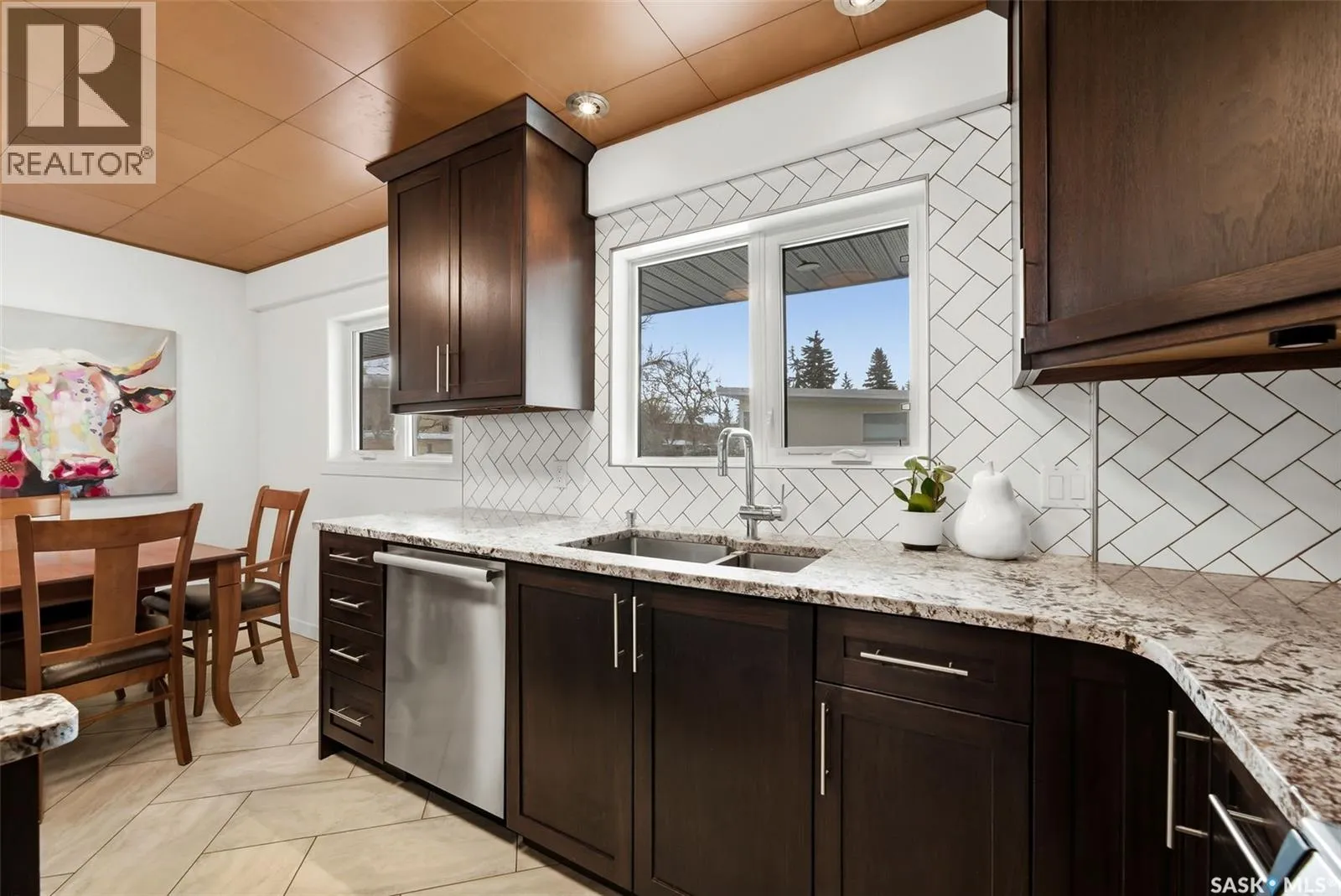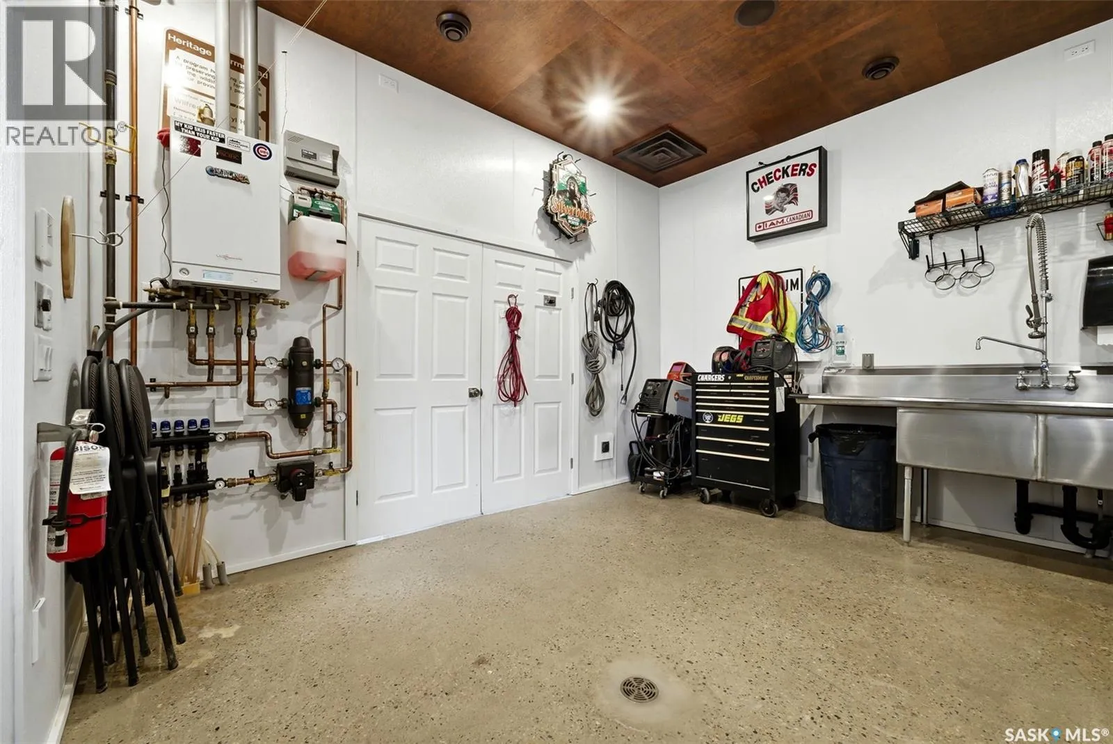 This beautifully maintained 1,690 sq ft Lakeview mid-century modern bungalow sits on a 6,759 sq ft corner lot facing Thornton Avenue. It features an incredible 1,600 sq ft addition completed in 2019, including the garage, work space, mudroom, ½ bath and laundry. Built on grade beam with piles, the addition is spray foam insulated with in-floor heat throughout for exceptional comfort and efficiency. The showstopping oversized double âGarage-Mahalâ offers 8â x 12â doors, built-in speakers, air compressor lines, HRV system, A/C, plumbed drains, water lines for washing vehicles, and a stunning wood ceiling. Durable FRP wall panels make it easy to maintain. A separate workspace includes sink, cabinetry and counter space, plus extensive built-in storage. The addition also features a mudroom with main floor laundry and 2-piece bath connecting the home and garage. Inside, youâll find timeless character with a bright living room showcasing floor-to-ceiling windows, a Tyndall stone wood-burning fireplace, and original teak hardwood flooring. The kitchen offers walnut cabinetry, granite countertops, tile backsplash, centre island, stainless steel appliances, wood ceiling detail, and dining area. Three bedrooms are located on the main floor, including the primary suite, along with an updated 4-piece bathroom. The finished basement includes a large rec room, office, gym area, 4th bedroom with egress window, 3-piece bathroom, and storage room with second laundry hookups. Upgrades include PVC windows, high-efficiency furnace, RO system, shingles (2019), fresh paint, 200 amp service in the garage plus 100 amp in the house, added exterior insulation, and a new sewer line with backflow valve. Outside features landscaped front yard with underground sprinklers and garden boxes with drip irrigation, new concrete sidewalks and driveway, fenced side yard, and a covered patio off the addition ready for a hot tub with stamped concrete pad, gas BBQ hookup and outdoor speakers. As per the Sellerâs direction, all offers will be presented on 03/02/2026 3:00PM. (id:27476)