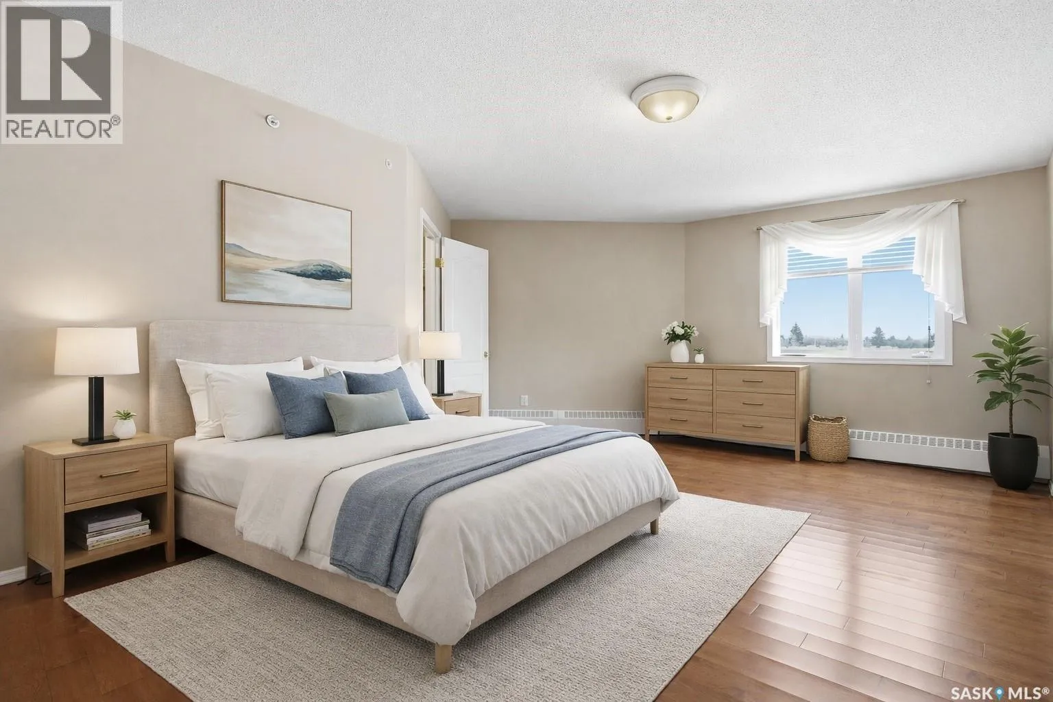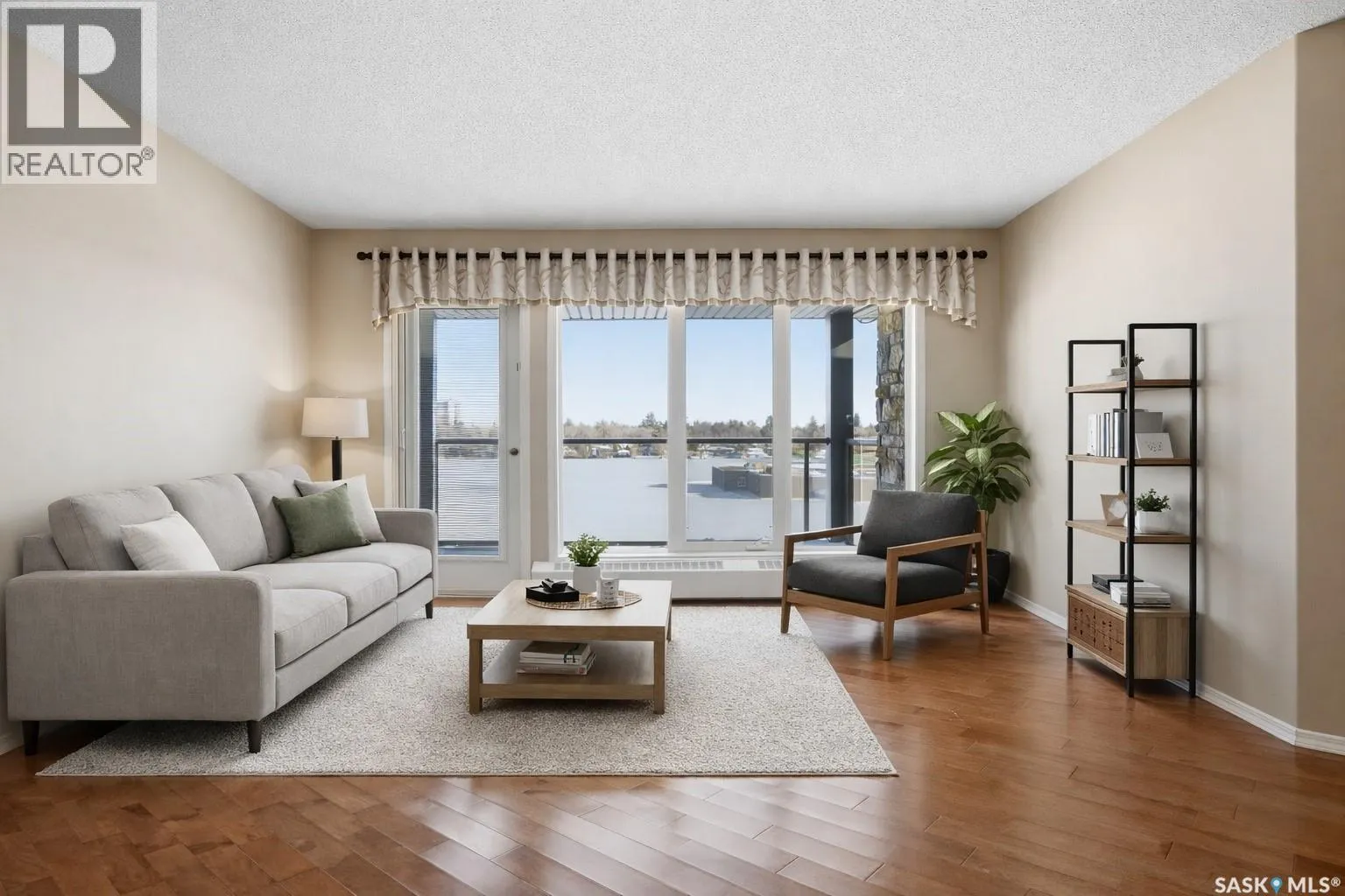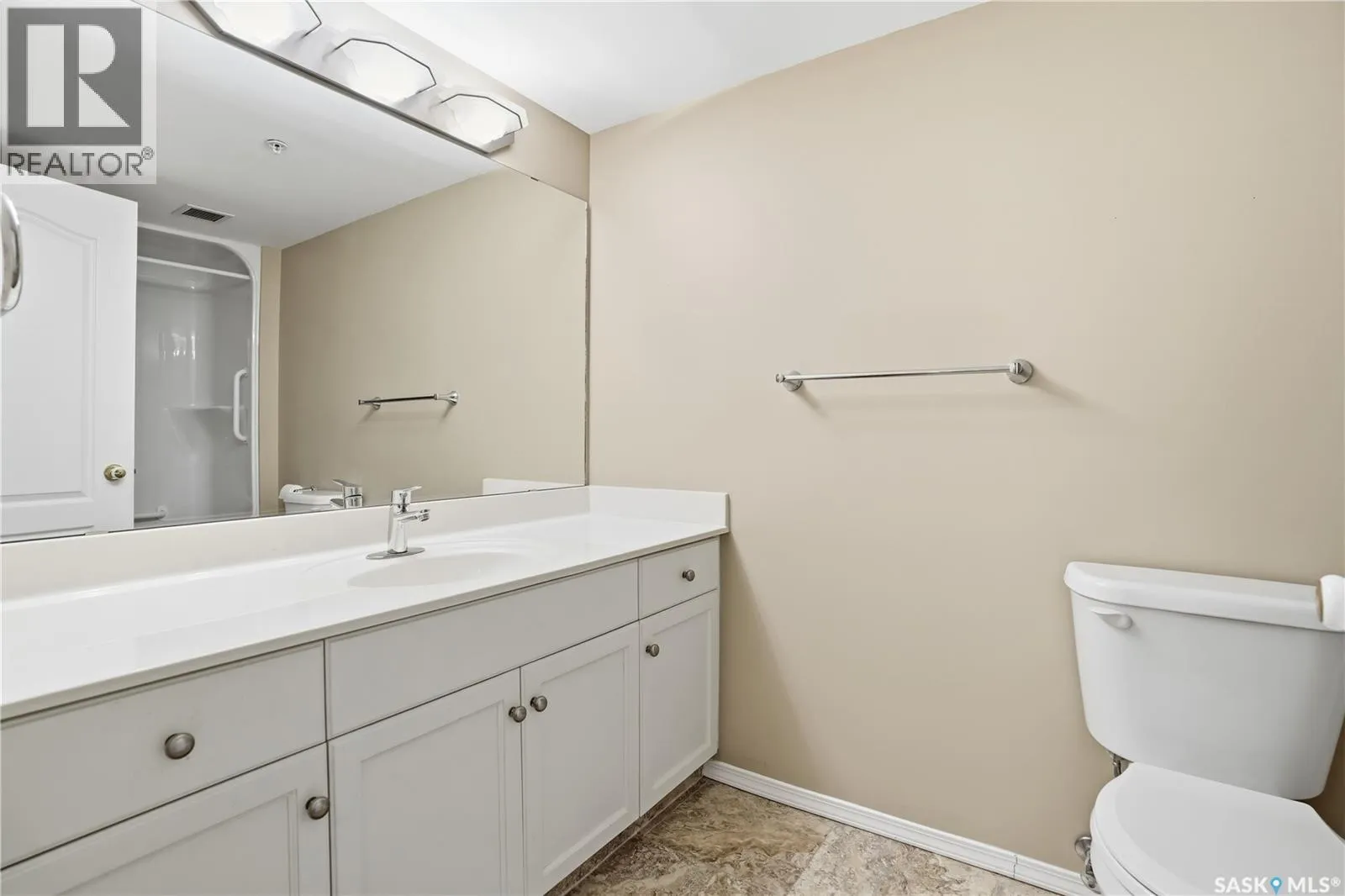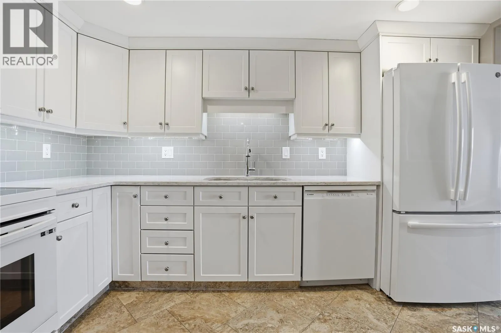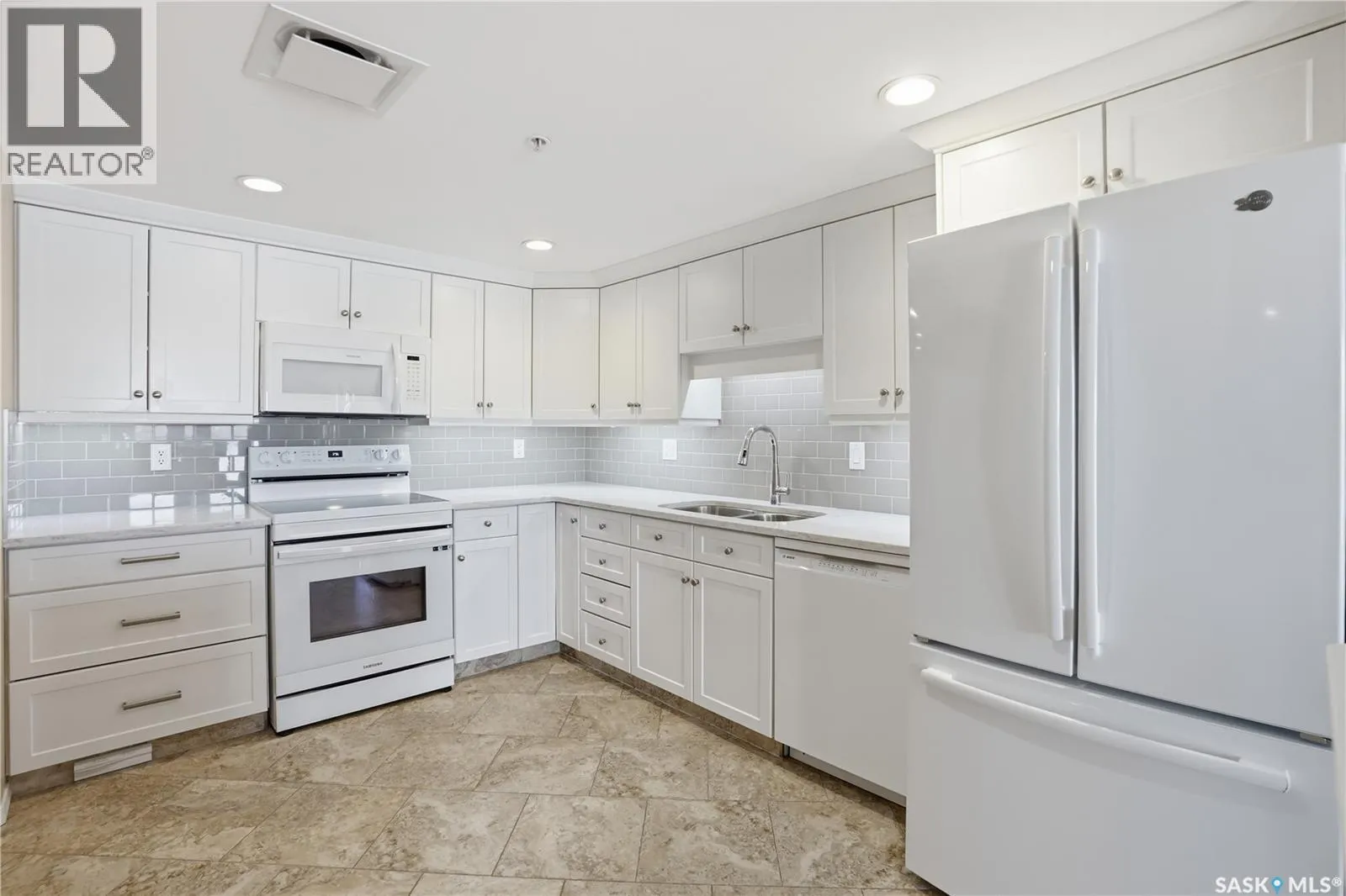 Pristine top floor condo in Marian Park is a show stopper. One of the larger floor plans in the complex at 1326 sq/ft, this 2 bedroom and 2 bathroom condo is move-in ready. Spacious entrance with Duraceramic tiled flooring flows through to the kitchen. Loads of natural light with the east facing balcony overlooking the open space. Bright white kitchen with upgraded appliances including microwave hood fan and Bosch dishwasher, quartz countertops, under cabinet lighting and pot lights. Gleaming engineered hardwood flooring throughout the living room, dining area and two generous bedrooms. The primary bedroom features an oversized walk-in closet and full 3 piece ensuite with tiled flooring. In-suite laundry is conveniently located on the opposite side of the bedrooms and near the main full bathroom. Enjoy your morning sunrise on the large east facing balcony which has natural gas bbq hook up. One underground heated parking stall with additional 60 sq/ft storage locker. Exceptional building with amenities room, exercise area and workshop for those who love to work on smaller projects! Exceptional south Regina location is close to bus stops, grocery stores, shopping, restaurants and a short commute to the airport. Condo fees include heat, water/sewer, reserve fund, common area maintenance and insurance, snow removal, garbage. Don't miss out on this great opportunity before it's too late. (id:27476)
