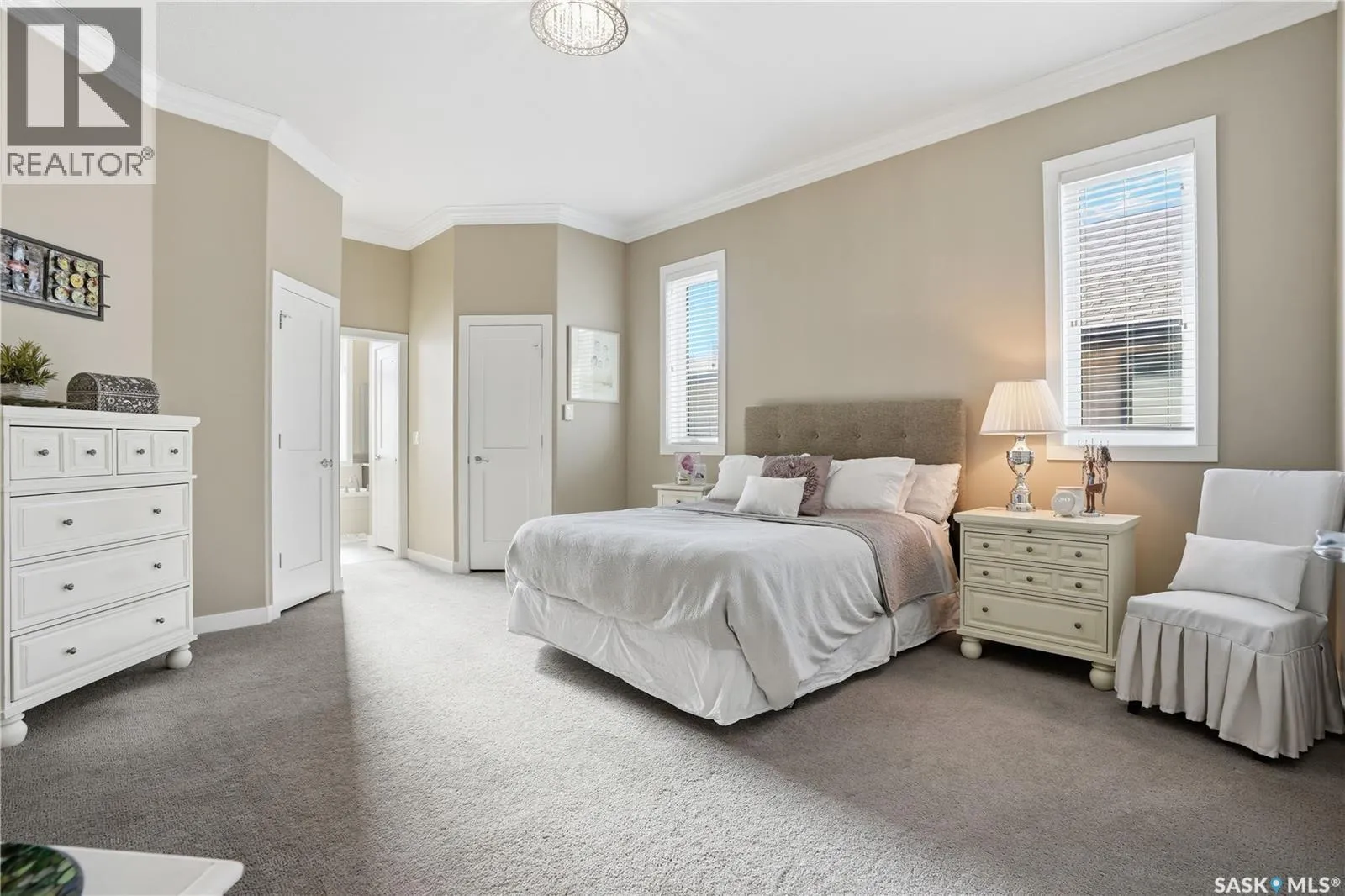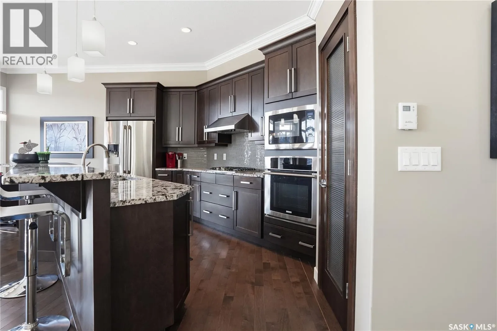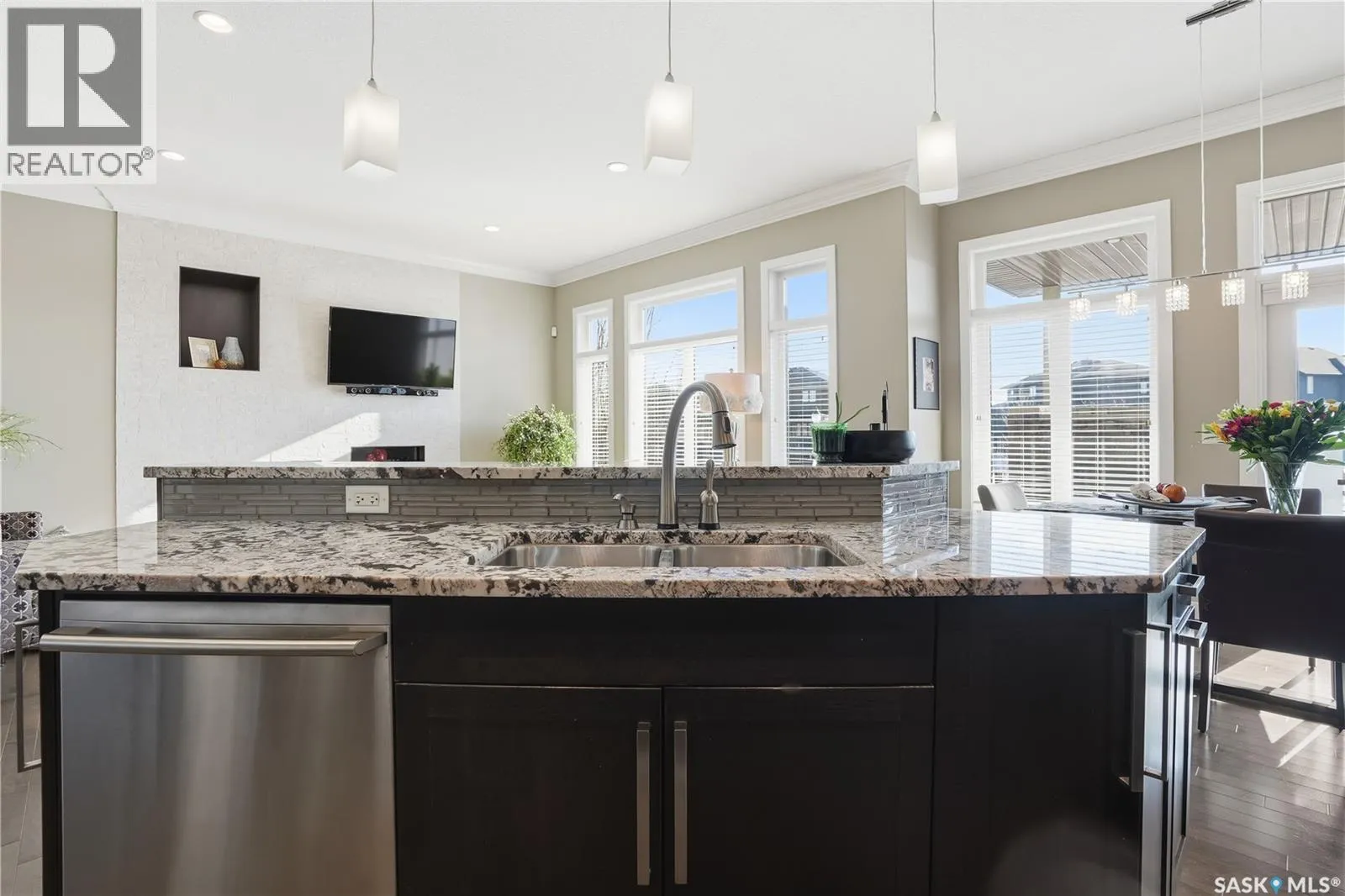 Welcome to 4506 Sandpiper Cr. E. This impeccably maintained bungalow is located on a quiet crescent in The Creeks, backing a walking path that leads directly to a nearby park. Built in 2012 by Varsity Homes, the quality of construction is evident throughout. The home sits on a generous 7,610 sq ft lot & showcases 5 bedrooms, 3 bathrooms, main floor den, main floor laundry, triple heated garage, outstanding curb appeal & so much more. A tile foyer welcomes you into 10' ceilings with elegant crown molding, creating a bright, warm, & truly beautiful home. An open concept layout offers a granite & maple kitchen w' hardwood floors, built in appliances w' gas range, pantry, & plenty of cabinets/drawers. Seamlessly weaving into the dining area where entry to the 2-tiered composite deck is perfect. The living rm displays a beautiful feature wall with 1 of 4 gas fireplaces in this extraordinary & bright home. An office with french doors paired with regal wainscotting, a full bath, mudroom w' access to garage, main floor laundry, a large bedroom, & finally the primary bedroom... here, elegance is felt with a feature wall & gas fireplace, dbl closets, & a generous sized spa-like luxurious ensuite w' jet tub, dbl vanities, & glass shower. A fully developed basement with its 9' ceilings provides an expansive rec room - stacking stone feature wall w' gas fireplace, BI system (HDMI wiring), a large bar with mini fridge & plenty of storage. Three additional bedrooms with large closets, a full bath, huge utility rm & storage areas complete the equally impressive basement. This area offers great flexibility for a family & guests. A 32x36 heated triple att garage is also immaculate, w' epoxy-coated floor, a floor drain, side entry to yard, & hot/cold taps. A beautifully landscaped outdoor area offers 2 decks, gas FP, garden, trees, grass & UG sprinklers, & is fully fenced backing a walking path that leads to a park. This 1695 sq ft pristine bungalow is simply stunning & a must see. As per the Sellerâs direction, all offers will be presented on 03/03/2026 9:30AM. (id:27476)