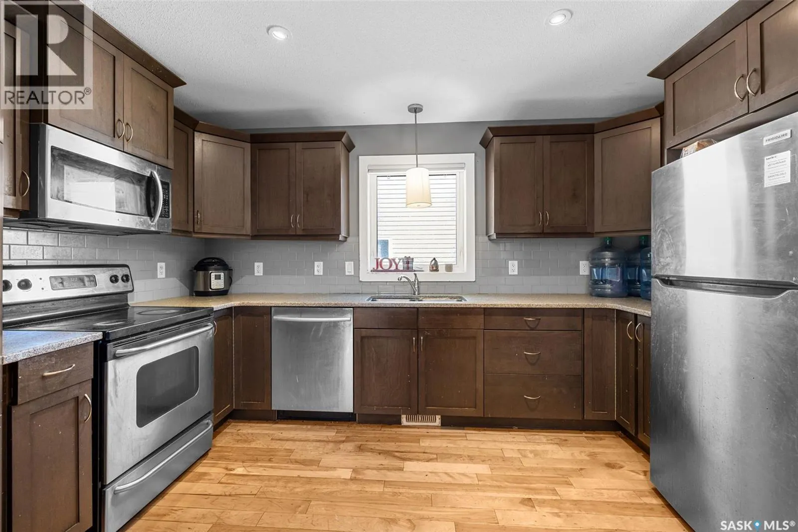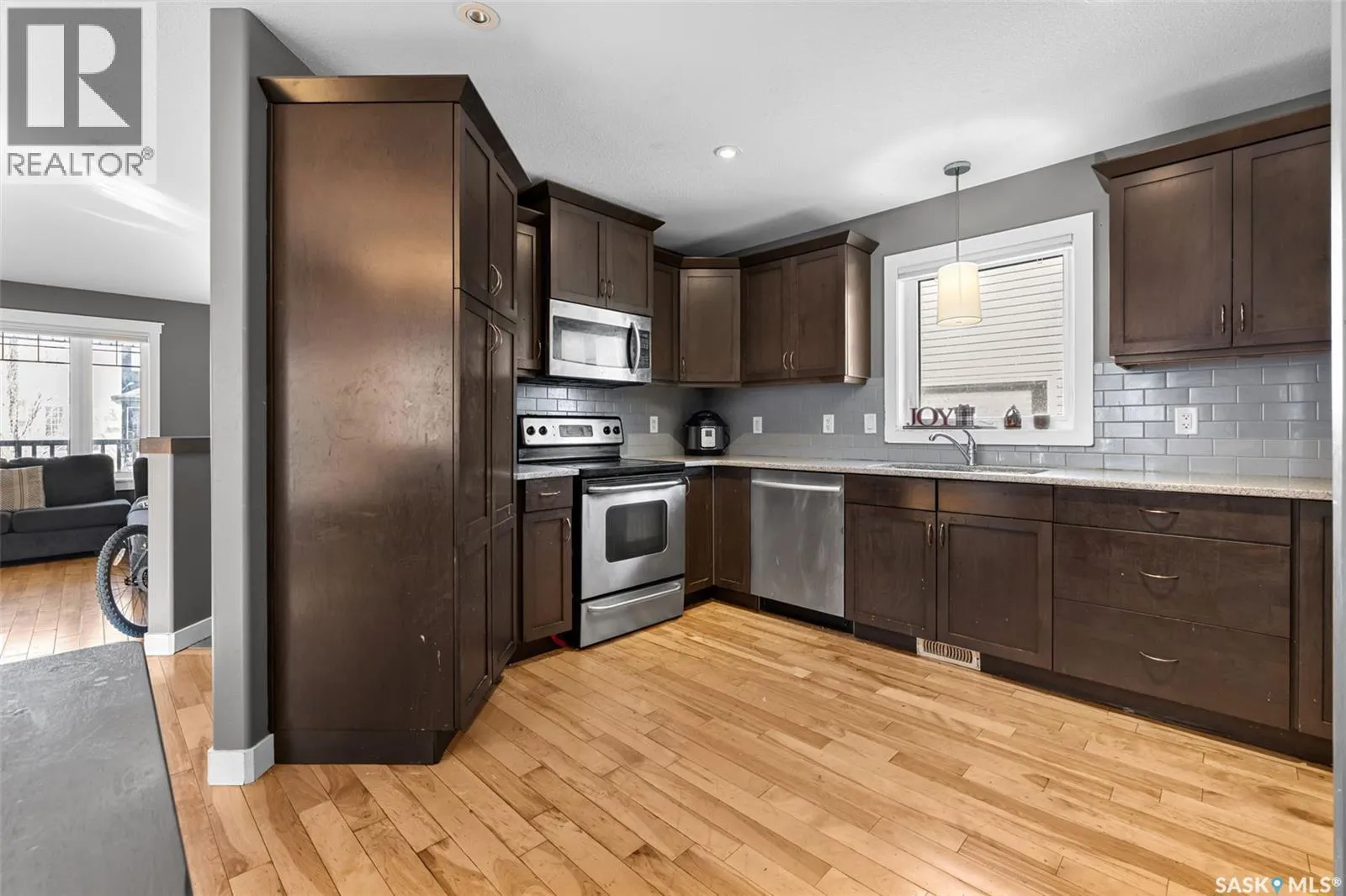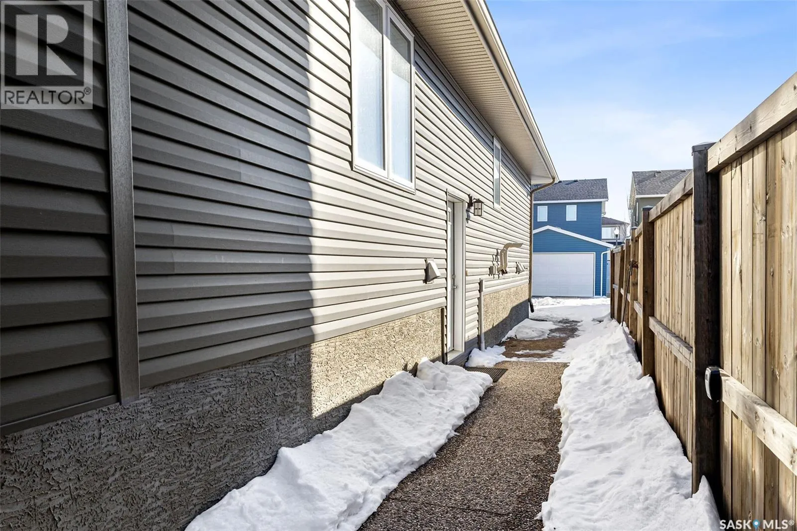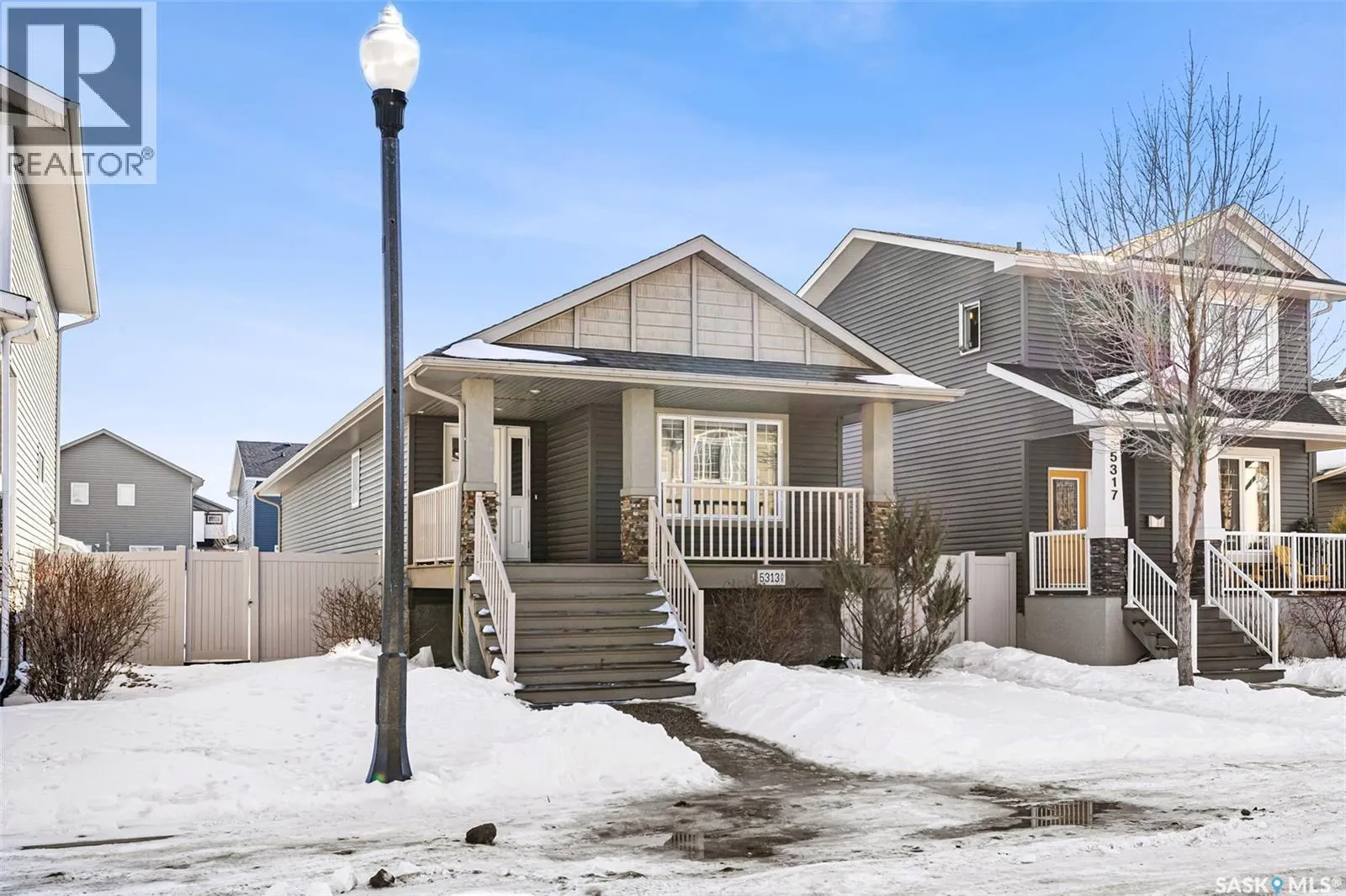 Front porch mornings. Fireplace evenings. Income potential below. Welcome to 5313 Mitchinson Way â a former Trademark Homes show home located in Regina's desirable Harbour Landing. This large 1,227 sq ft raised bungalow immediately impresses with the expansive front porch stretching across the home â the perfect place to enjoy your morning coffee or unwind in the evening. Inside, the open-concept main floor showcases hardwood and tile flooring, quartz countertops, a spacious kitchen with ample cabinetry and pantry space, and a bright dining area ideal for everyday living and entertaining. The living room features a beautiful fireplace with a stained maple mantle, adding warmth and character. The main floor offers three bedrooms, including a primary suite with a walk-in closet, a full bathroom, and the convenience of main-floor laundry. What truly sets this home apart is the fully finished basement. Designed with large windows and thoughtful attention to detail, the lower level feels bright and welcoming â nothing like a typical basement. The suite features a spacious kitchen, open living and dining area, two bedrooms, one with a walk-in closet, a full bathroom, in-floor heating, and its own laundry. Both units have separate utilities and there is a private side entrance, making this an outstanding opportunity for mortgage support or investment income in a market where rental properties are in high demand. Whether you are looking for a family home with added income potential, a first-time buyer opportunity to offset your mortgage, or a turnkey investment property, this home offers exceptional versatility in one of Reginaâs most popular neighbourhoods. Opportunities like this donât come along often â book your private showing today. All information is deemed reliable but not guaranteed and should be independently verified by the buyer. As per the Sellerâs direction, all offers will be presented on 03/06/2026 3:00PM. (id:27476)