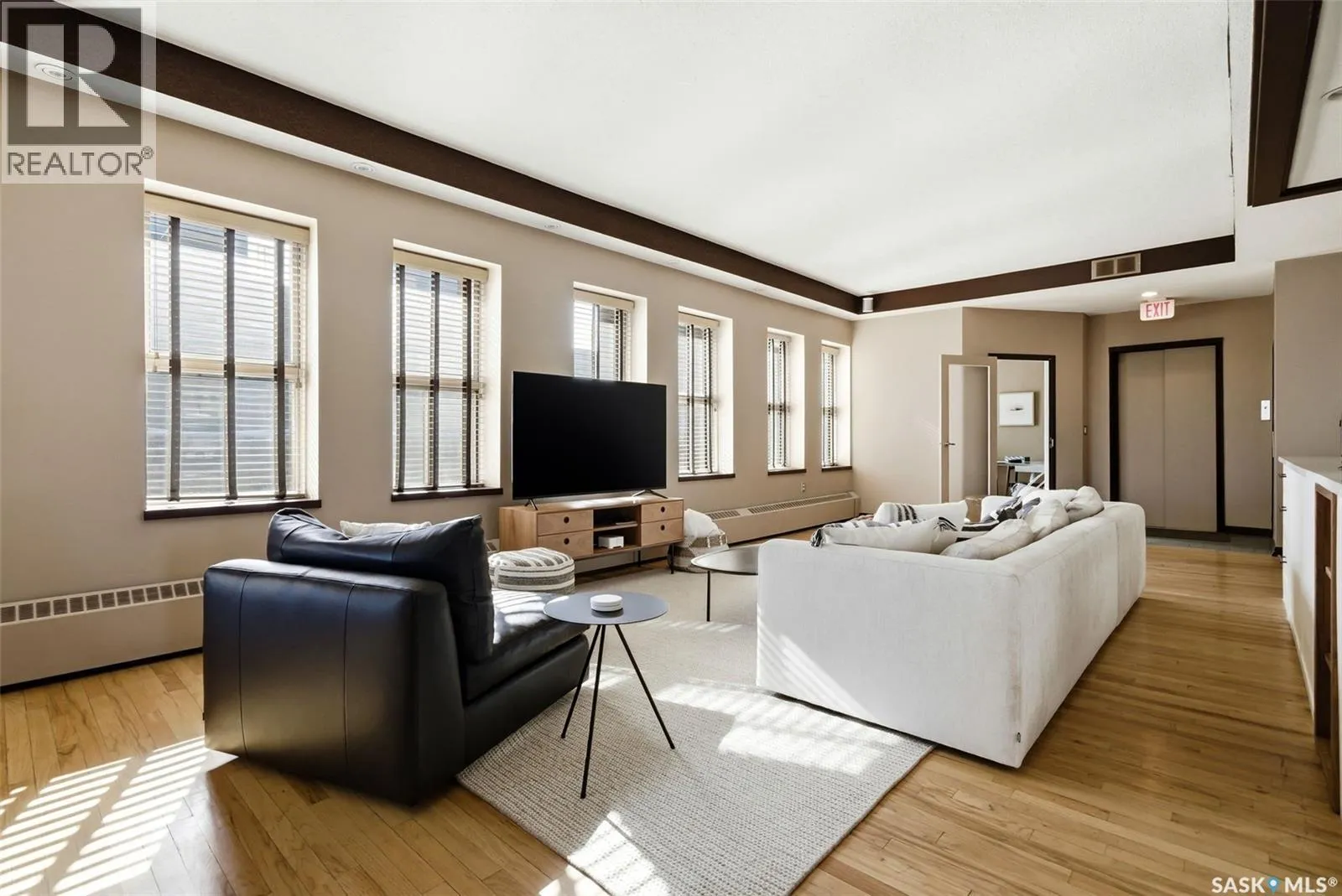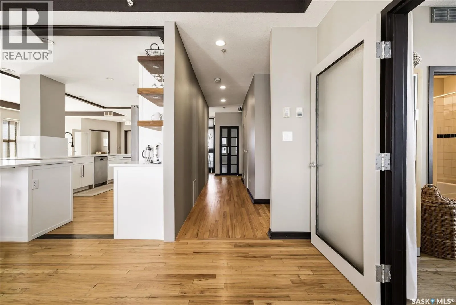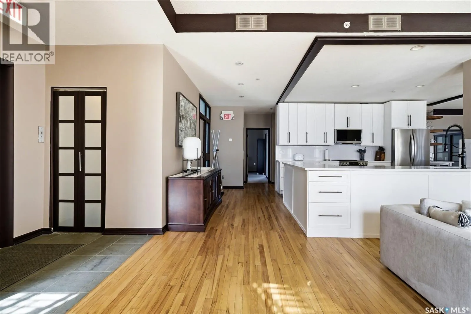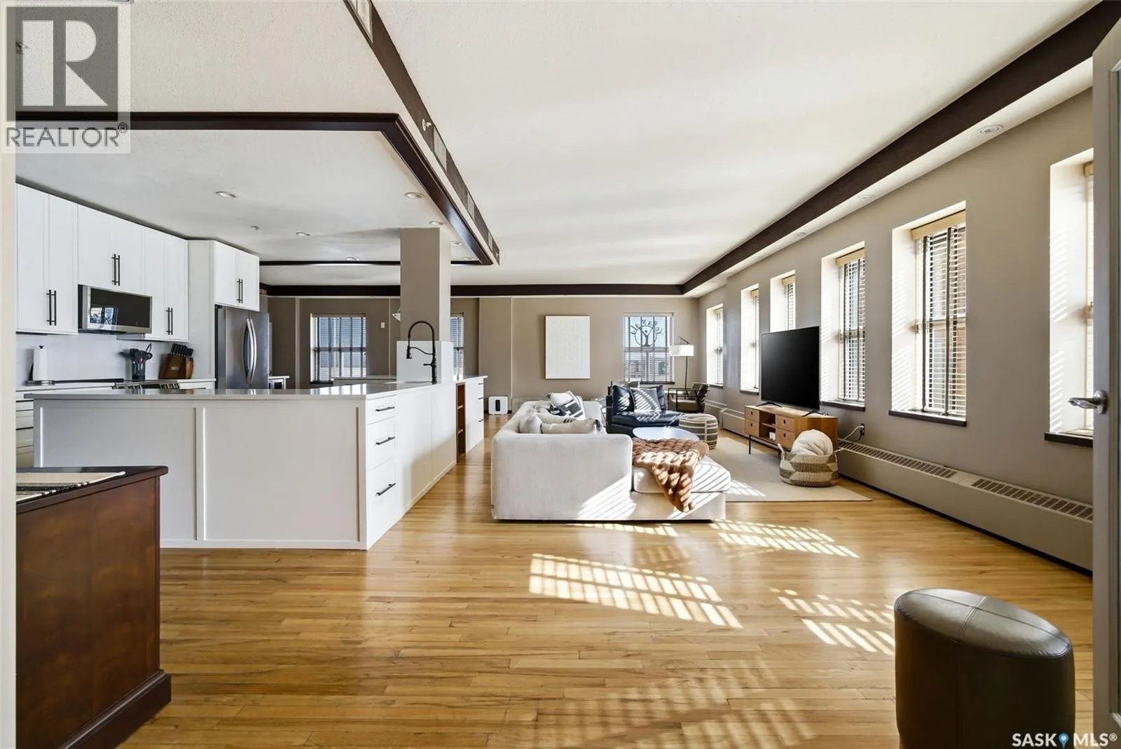 Penthouse Living in the Historic Western Trust Building! Welcome to the coveted fifth-floor penthouse offering over 1,900 square feet of refined downtown living. This exceptional home blends heritage architecture with thoughtful modern updates. Natural light pours through oversized windows, highlighting rich hardwood floors and soaring ceilings that enhance the open-concept design and create an airy, sophisticated atmosphere ideal for both everyday living and entertaining. The showpiece kitchen, completed in January 2024, features ceiling-height white cabinetry, quartz countertops, a dramatic full-height backsplash, and a massive island perfect for gatherings. A dedicated coffee station with beverage fridge and floating walnut shelves adds both function and warmth, while abundant storage ensures everything has its place. Positioned before the primary suite, a bright, sunny office enclosed with a stylish glass door provides the perfect work-from-home space while maintaining privacy without sacrificing natural light. The primary suite offers plush carpet flooring, double closets, and a private ensuite with a new white vanity, concrete countertops, separate shower, and corner jetted tub â a relaxing retreat at the end of the day. French doors lead to a spacious second bedroom with its own four-piece bath, which also has hall access for added flexibility and guest convenience. Additional highlights include a generous laundry room with new stackable washer and dryer, in-suite air conditioning with rooftop unit placement for quiet efficiency, private elevator access directly into the suite, secure building entry, and convenient stairwell access. Storage unit located in the building. One heated underground parking stall is included, located beneath the Globe Theatre. Bonus! A rare opportunity to own a distinguished penthouse residence offering space, character, and modern luxury in the heart of Regina â steps from dining, shopping, and vibrant downtown amenities. (id:27476)