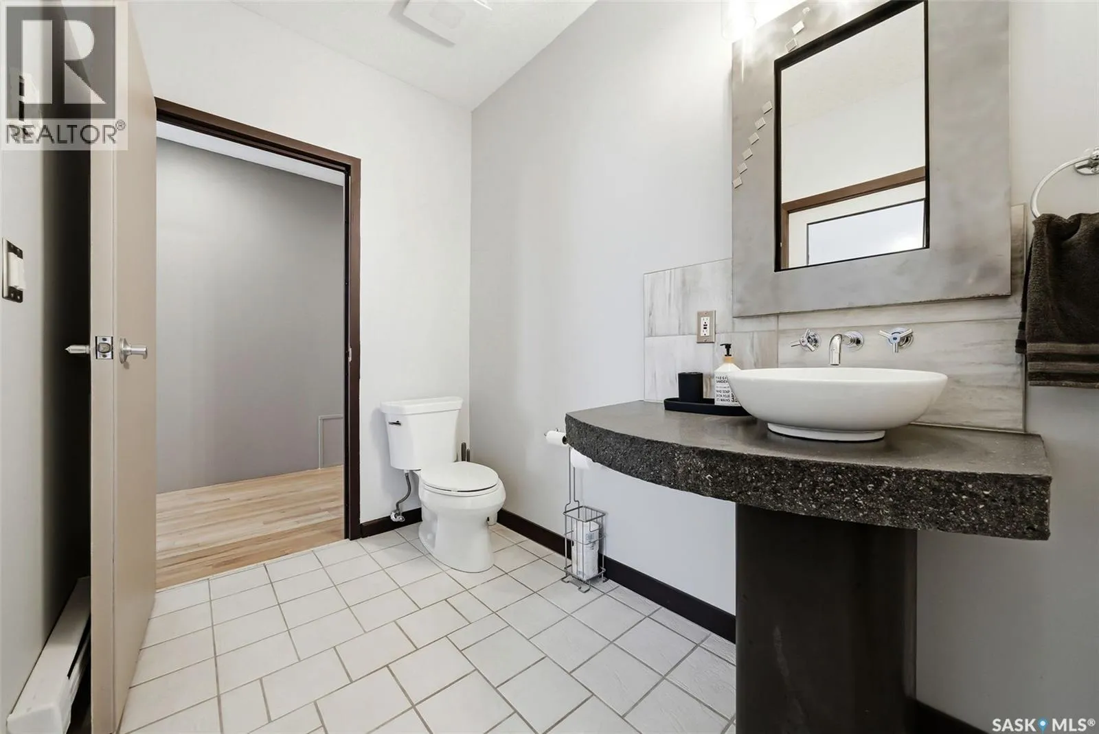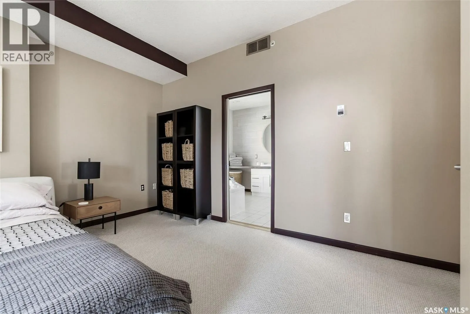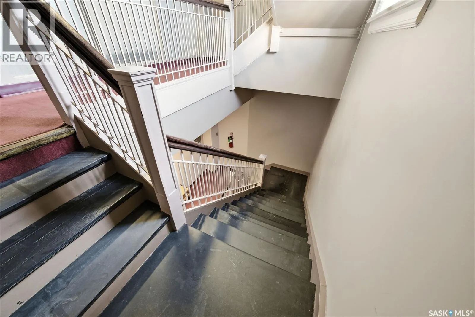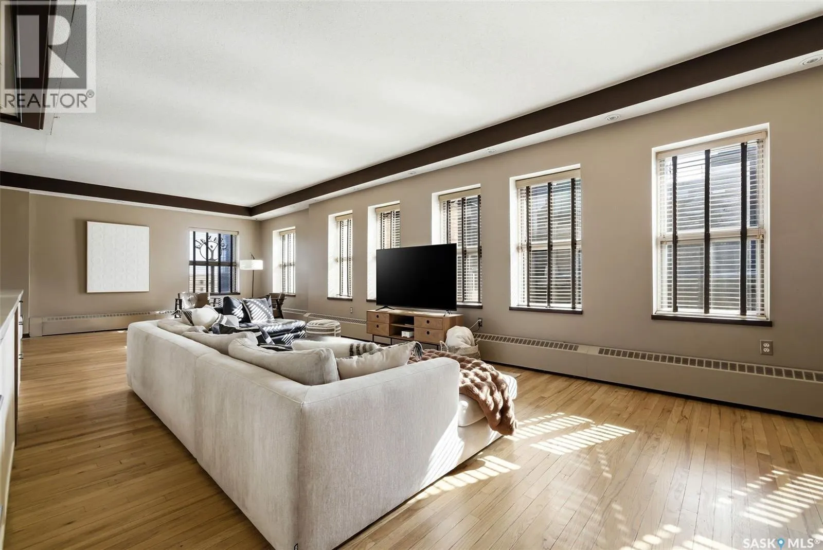 Penthouse Living in the Historic Western Trust Building! Welcome to the coveted fifth-floor penthouse offering over 1,900 square feet of refined downtown living. This exceptional home blends heritage architecture with thoughtful modern updates. Natural light pours through oversized windows, highlighting rich hardwood floors and soaring ceilings that enhance the open-concept design and create an airy, sophisticated atmosphere ideal for both everyday living and entertaining. The showpiece kitchen, completed in January 2024, features ceiling-height white cabinetry, quartz countertops, a dramatic full-height backsplash, and a massive island perfect for gatherings. A dedicated coffee station with beverage fridge and floating walnut shelves adds both function and warmth, while abundant storage ensures everything has its place. Positioned before the primary suite, a bright, sunny office enclosed with a stylish glass door provides the perfect work-from-home space while maintaining privacy without sacrificing natural light. The primary suite offers plush carpet flooring, double closets, and a private ensuite with a new white vanity, concrete countertops, separate shower, and corner jetted tub â a relaxing retreat at the end of the day. French doors lead to a spacious second bedroom with its own four-piece bath, which also has hall access for added flexibility and guest convenience. Additional highlights include a generous laundry room with new stackable washer and dryer, in-suite air conditioning with rooftop unit placement for quiet efficiency, private elevator access directly into the suite, secure building entry, and convenient stairwell access. Storage unit located in the building. One heated underground parking stall is included, located beneath the Globe Theatre. Bonus! A rare opportunity to own a distinguished penthouse residence offering space, character, and modern luxury in the heart of Regina â steps from dining, shopping, and vibrant downtown amenities. (id:27476)