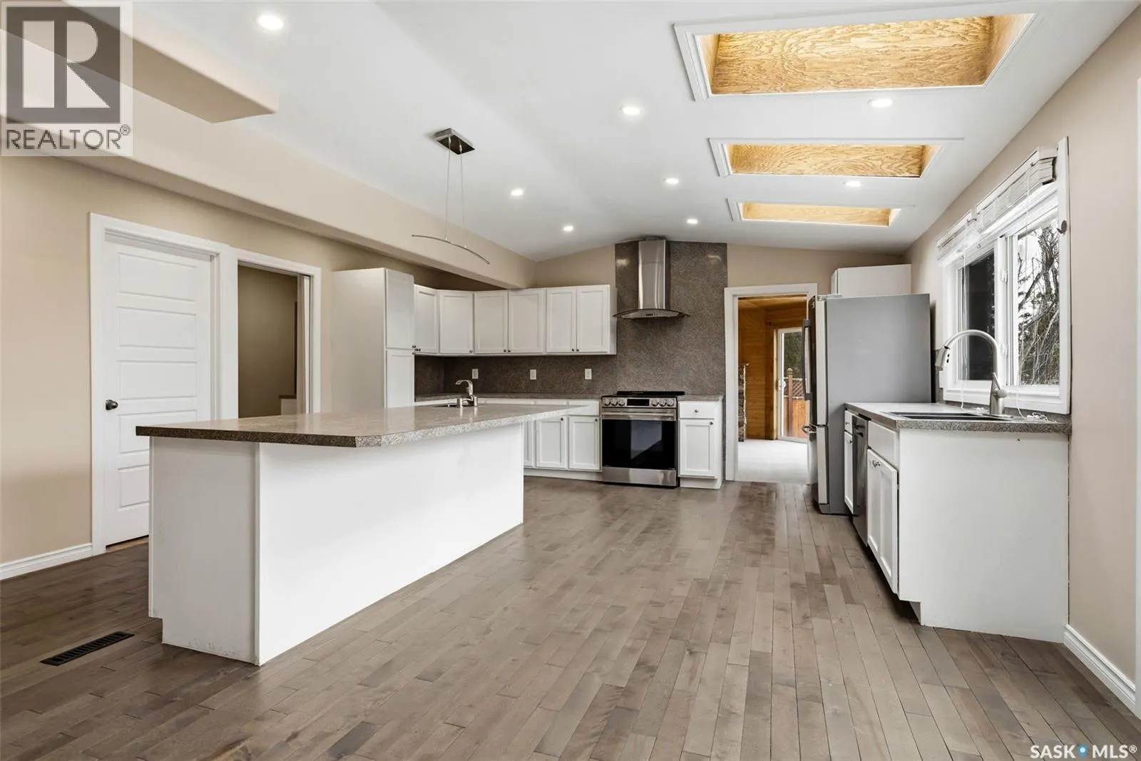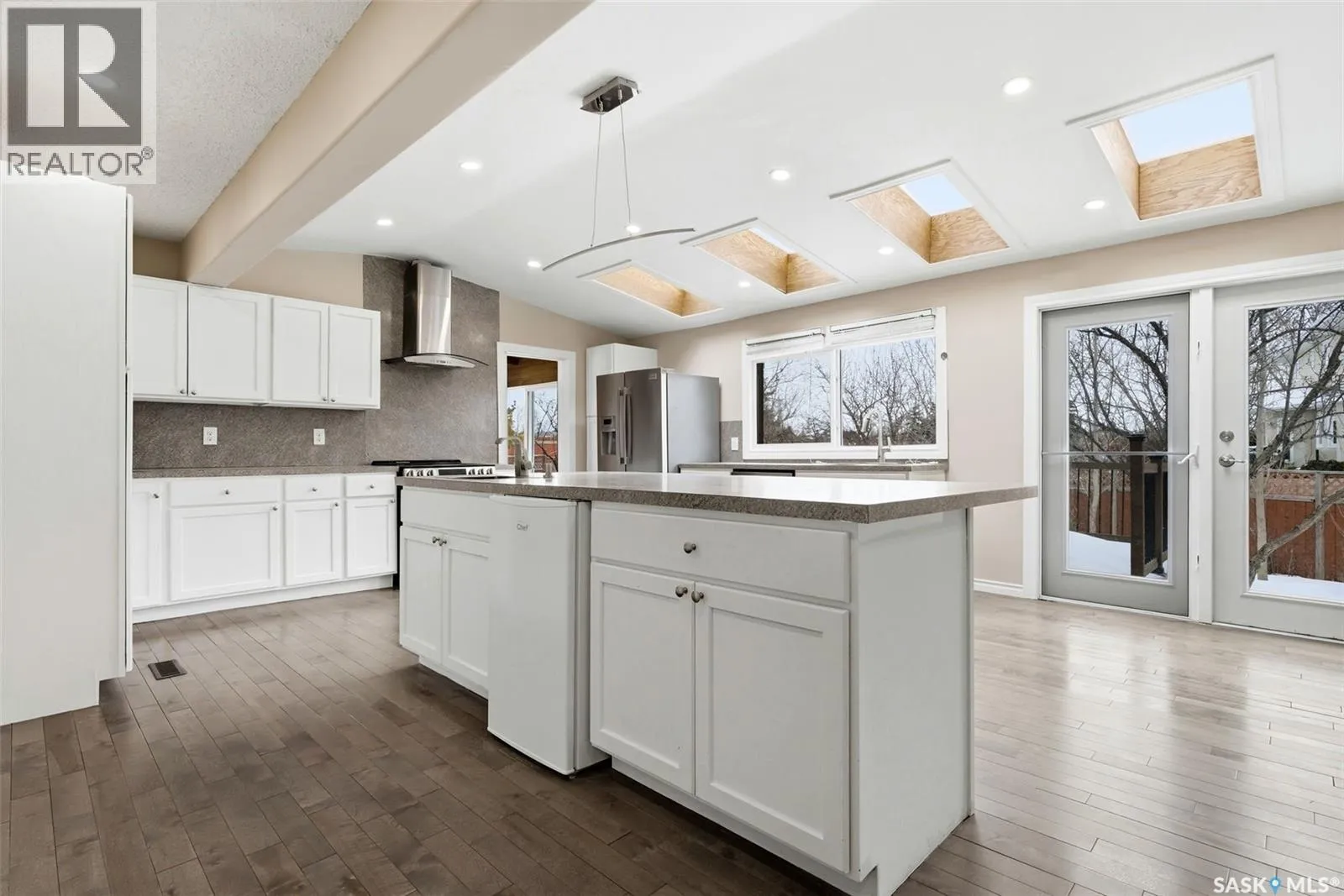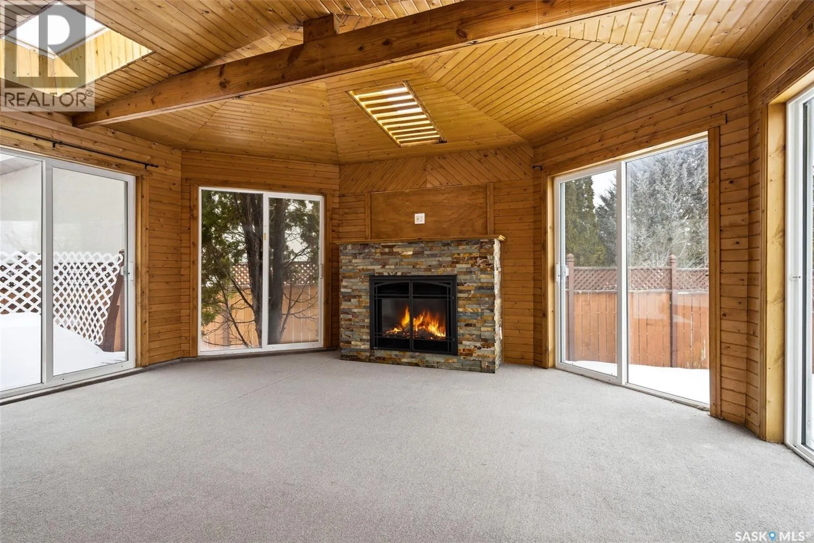 Welcome to 3234 Wascana Glen, a spacious two-storey split located in the highly desirable Wascana View neighbourhood of Regina. Offering 2,496 sq ft above grade, this well-designed home features generous living spaces, timeless oak finishes, and a layout perfect for family living and entertaining. The grand front foyer welcomes you with vaulted ceilings, a striking staircase, and mirrored closet doors, creating an impressive first impression. The main floor offers a bright living room filled with natural light and a formal dining area ideal for hosting gatherings. The kitchen provides ample cabinetry, stainless steel appliances, a large island with seating, and unique skylights above that bring additional natural light into the space. Just off the kitchen is a comfortable family room with hardwood flooring and a cozy wood-burning fireplace. A standout feature of the home is the beautiful cedar sunroom with stone fireplace, offering a warm and inviting space to relax year-round while overlooking the backyard. The main level also includes a convenient laundry room with exterior access and a 2-piece bathroom. Upstairs youâll find three bedrooms, including a very spacious primary suite featuring laminate flooring, a walk-in closet, and a 3-piece ensuite with shower. Two additional bedrooms and a full 4-piece bathroom complete the upper level. The fully developed basement adds additional living space with a recreation room, games room, an extra bedroom, a den, and a 3-piece bathroomâperfect for guests, hobbies, or a growing family. Situated on a 9,235 sq ft lot, the backyard offers lawn space, mature trees, deck and patio areas for outdoor enjoyment. A double attached garage and double driveway provide plenty of parking. Located close to parks, schools, and east Regina amenities, this home offers space, comfort, and an excellent location in one of Reginaâs most sought-after neighbourhoods. (id:27476)