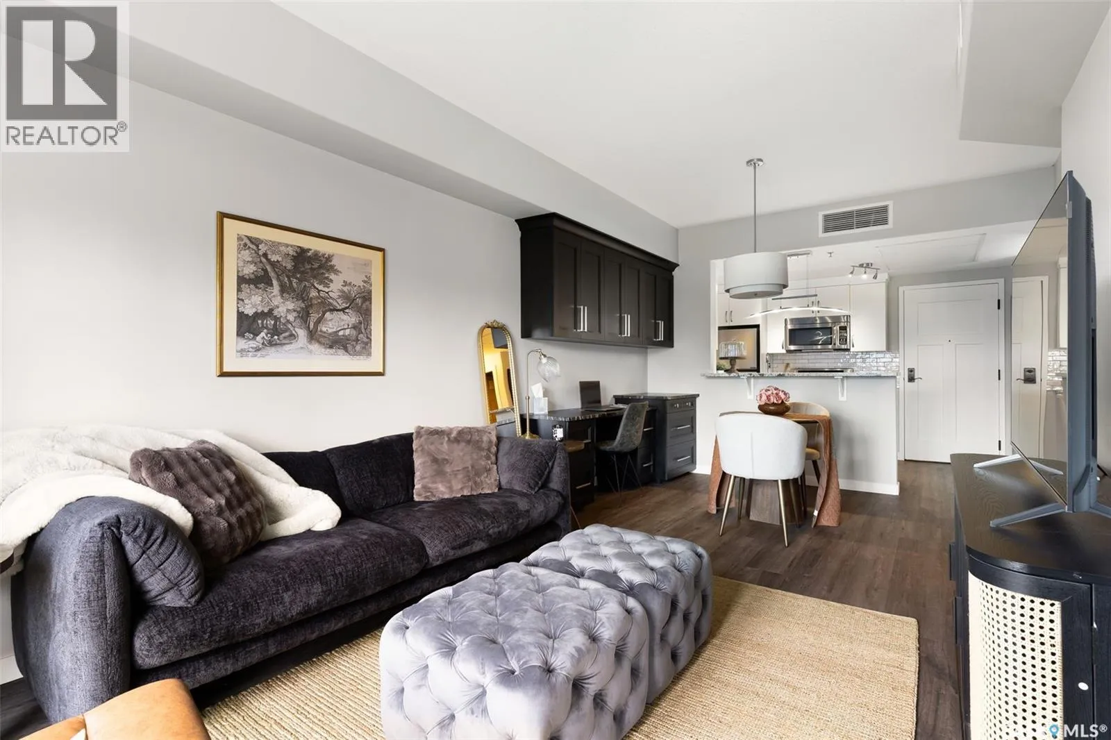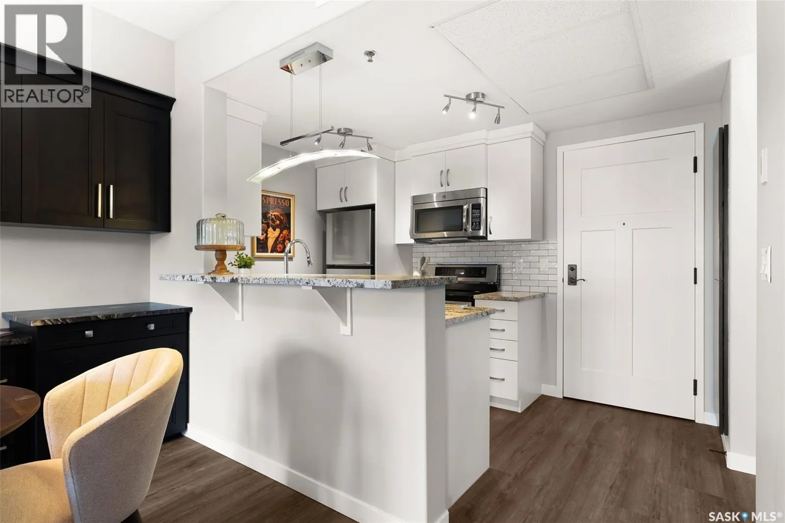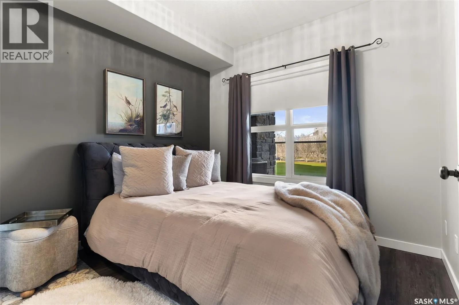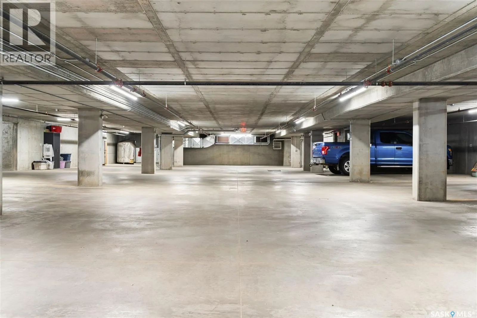 Located in the south end of Regina, across from Wascana Lake, and with convenient access to the U of R, Downtown and all of Regina's South amenities is this modern, upscale one bedroom condo in the Bellagio. Enjoy the sunlit mornings and view from the comfy living room that overlooks the manicured landscaping surrounding the Bellagio. The open concept floor plan is ideal for entertaining or kicking back and relaxing. The dining area features quality built in cabinetry with quartz counter tops plus a built in multipurpose desk. The dining room design maximizes space with functionality. There is also a custom designed wine rack with extra cabinet space. The inviting white kitchen will inspire your culinary skills offering pull out drawers, subway tiled backsplash, quartz counter tops, stainless steel appliances and an eating bar for extra seating. The primary bedroom has large east facing windows, vinyl plank flooring that seamlessly runs through the custom designed walk-through closet and into the 4-piece bath. The condo unit is complete with an in suite laundry area & storage space. Capping it all off, the unit comes with a secured underground parking stall with storage cabinets, plus the Bellagio offers an amenities room and a gym. (id:27476)