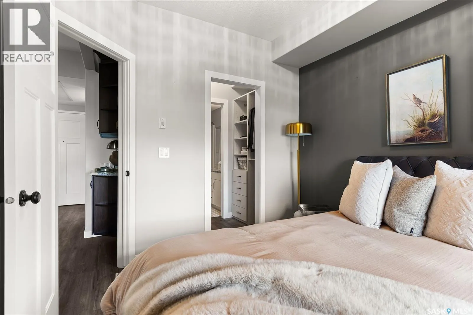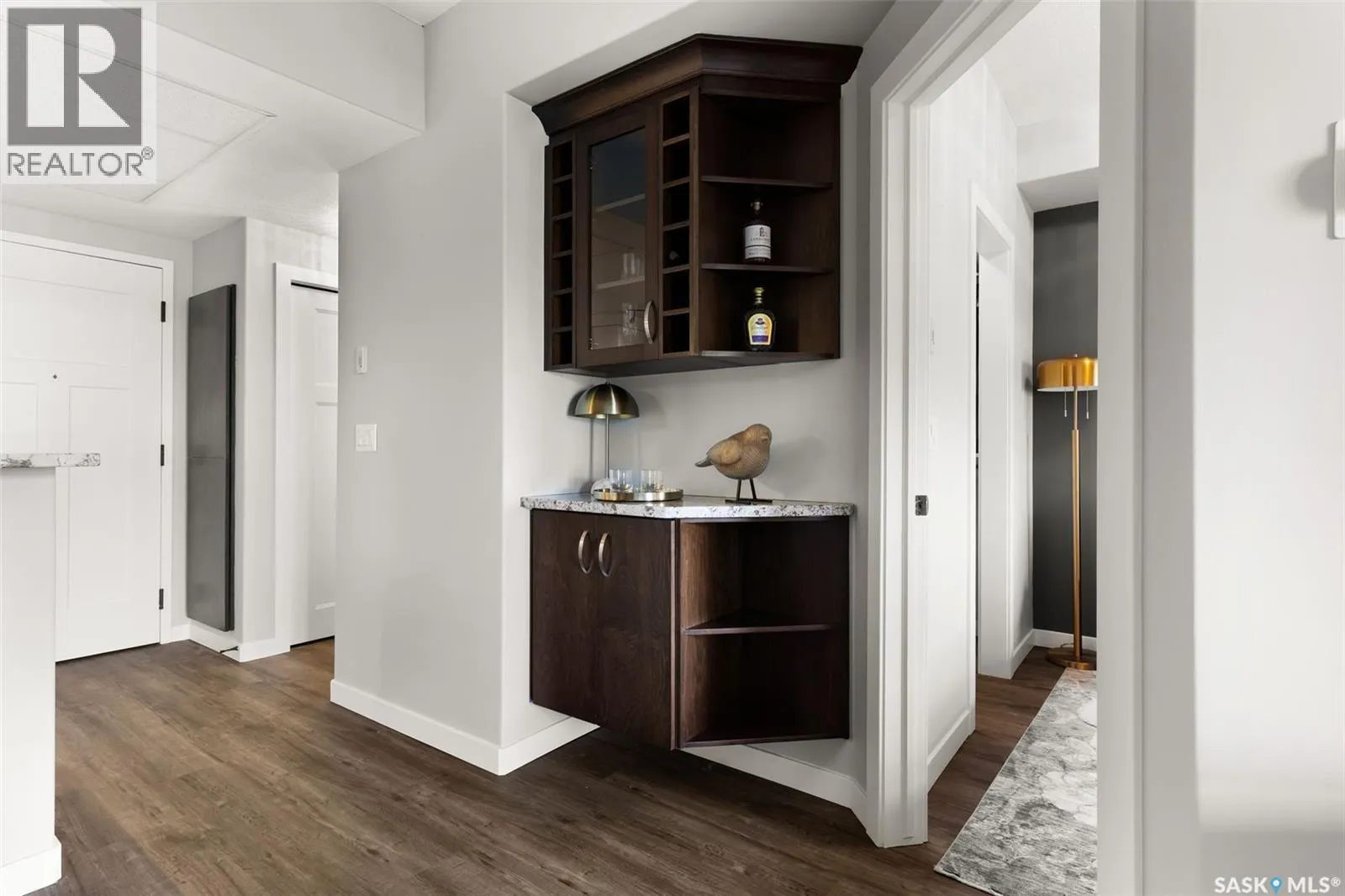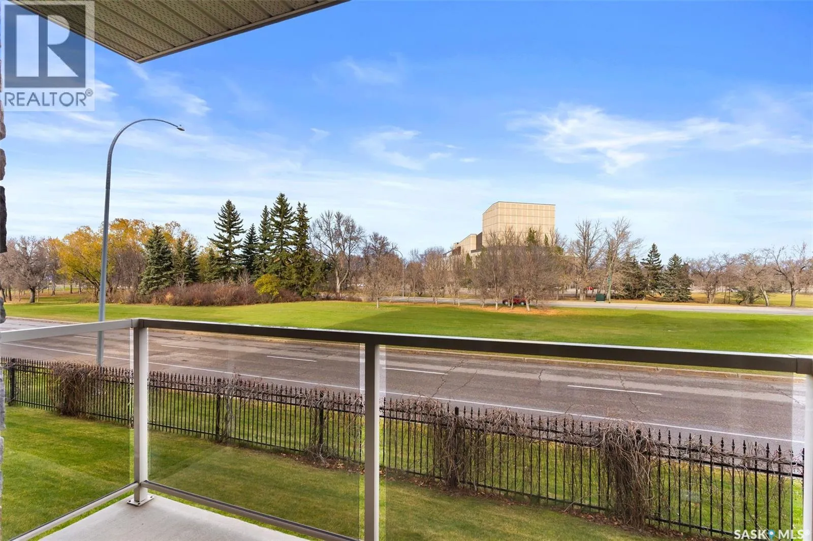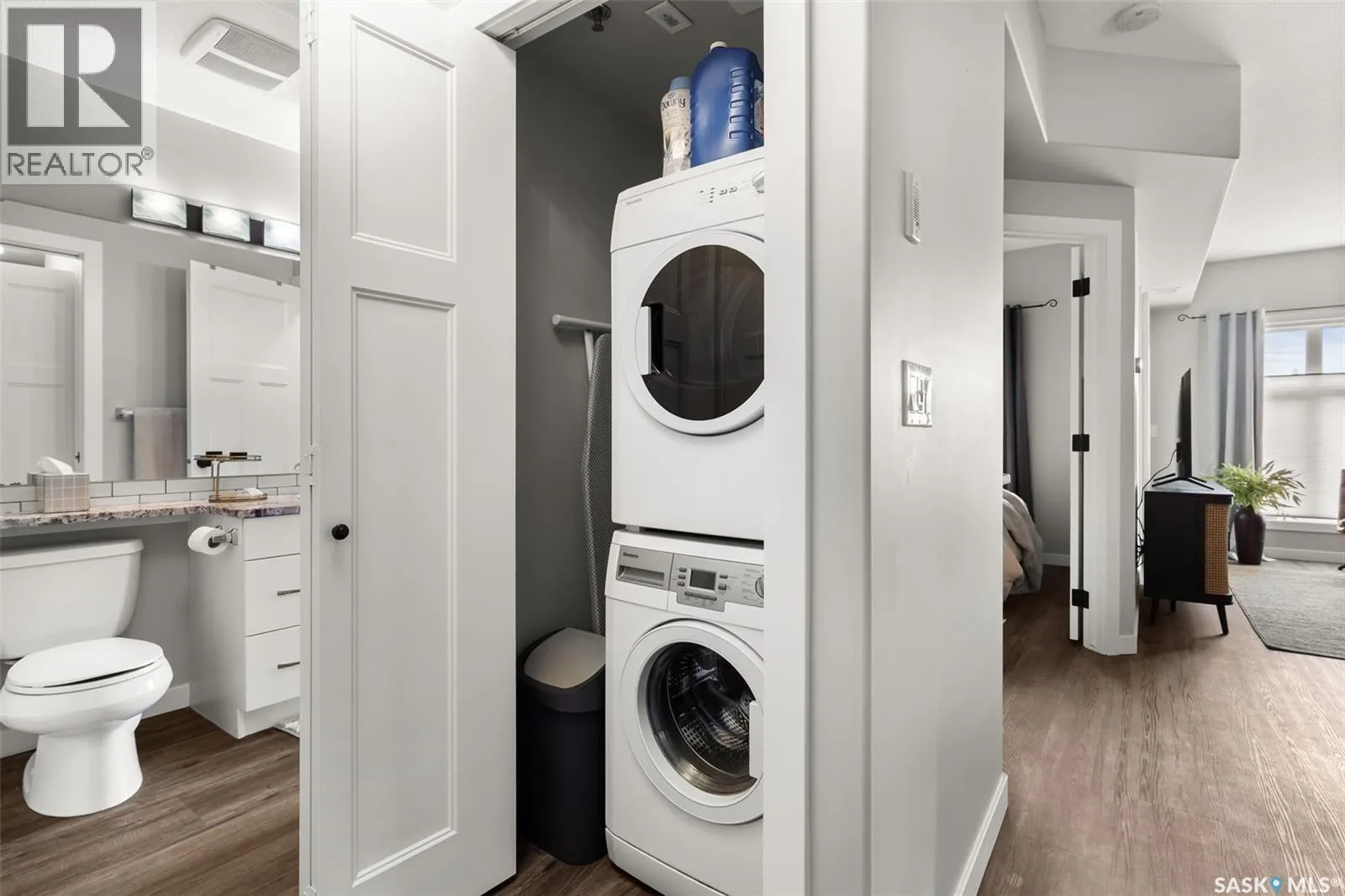 Located in the south end of Regina, across from Wascana Lake, and with convenient access to the U of R, Downtown and all of Regina's South amenities is this modern, upscale one bedroom condo in the Bellagio. Enjoy the sunlit mornings and view from the comfy living room that overlooks the manicured landscaping surrounding the Bellagio. The open concept floor plan is ideal for entertaining or kicking back and relaxing. The dining area features quality built in cabinetry with quartz counter tops plus a built in multipurpose desk. The dining room design maximizes space with functionality. There is also a custom designed wine rack with extra cabinet space. The inviting white kitchen will inspire your culinary skills offering pull out drawers, subway tiled backsplash, quartz counter tops, stainless steel appliances and an eating bar for extra seating. The primary bedroom has large east facing windows, vinyl plank flooring that seamlessly runs through the custom designed walk-through closet and into the 4-piece bath. The condo unit is complete with an in suite laundry area & storage space. Capping it all off, the unit comes with a secured underground parking stall with storage cabinets, plus the Bellagio offers an amenities room and a gym. (id:27476)