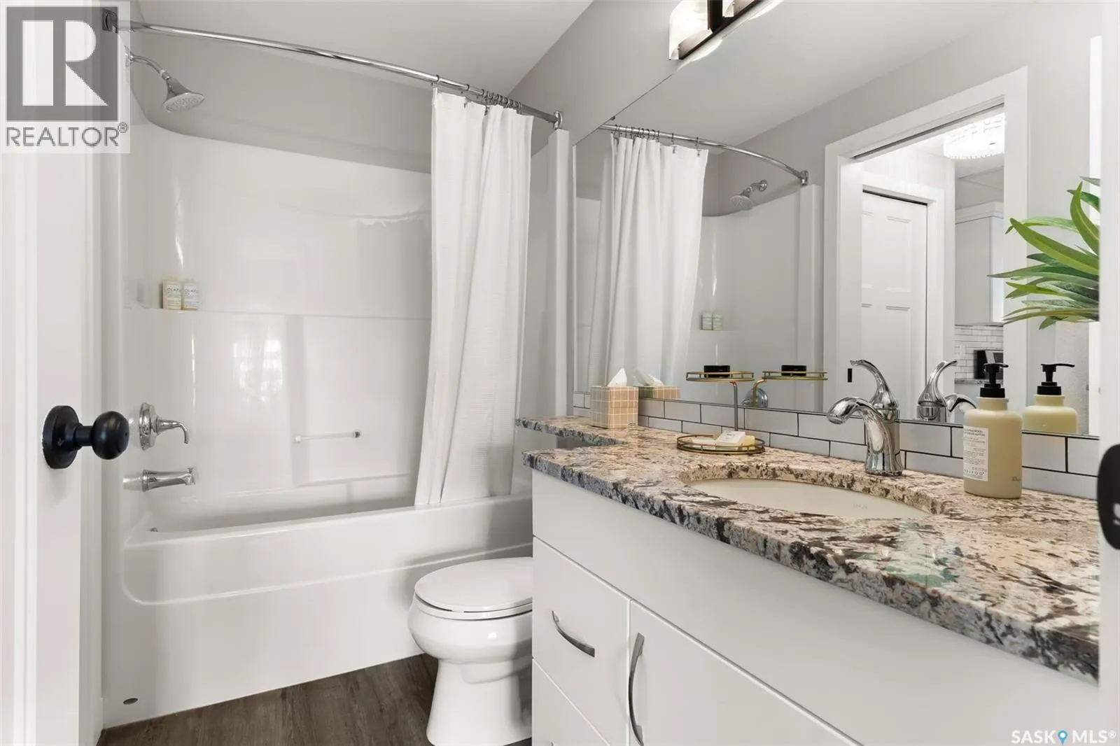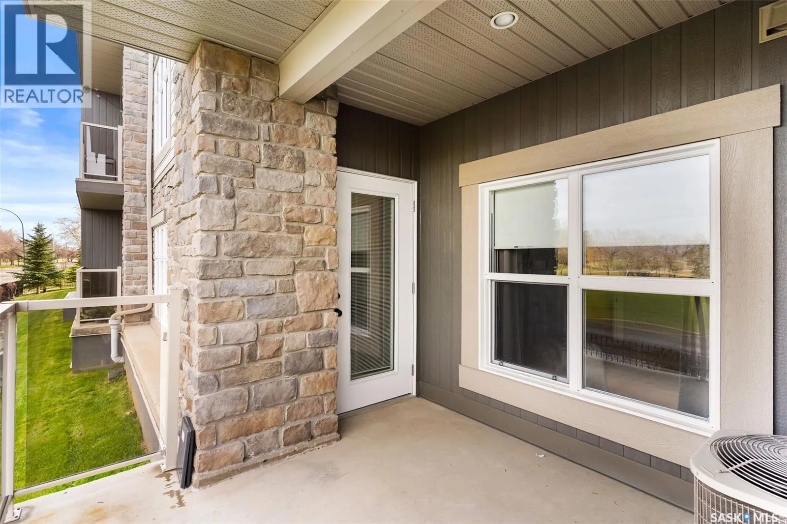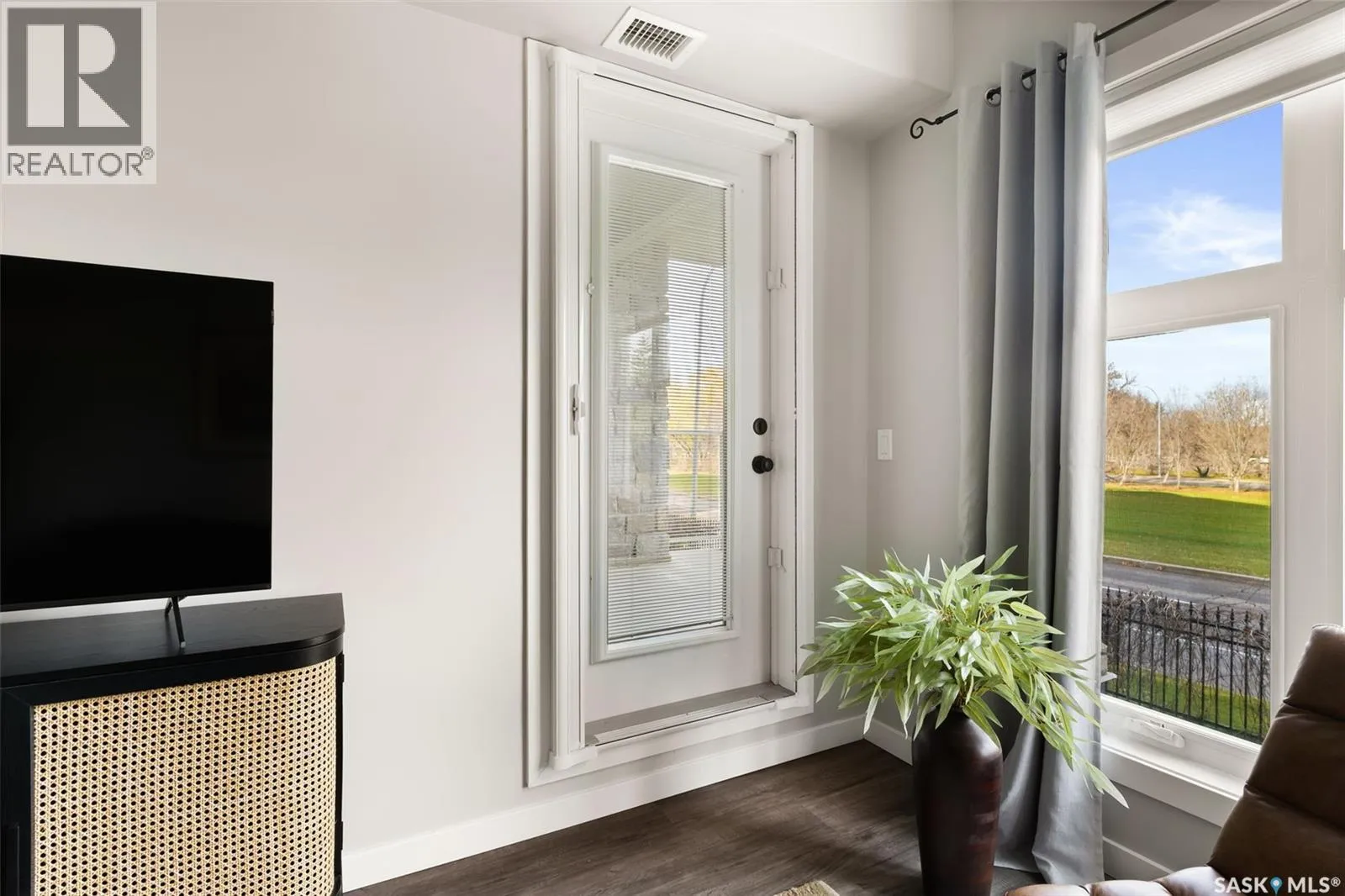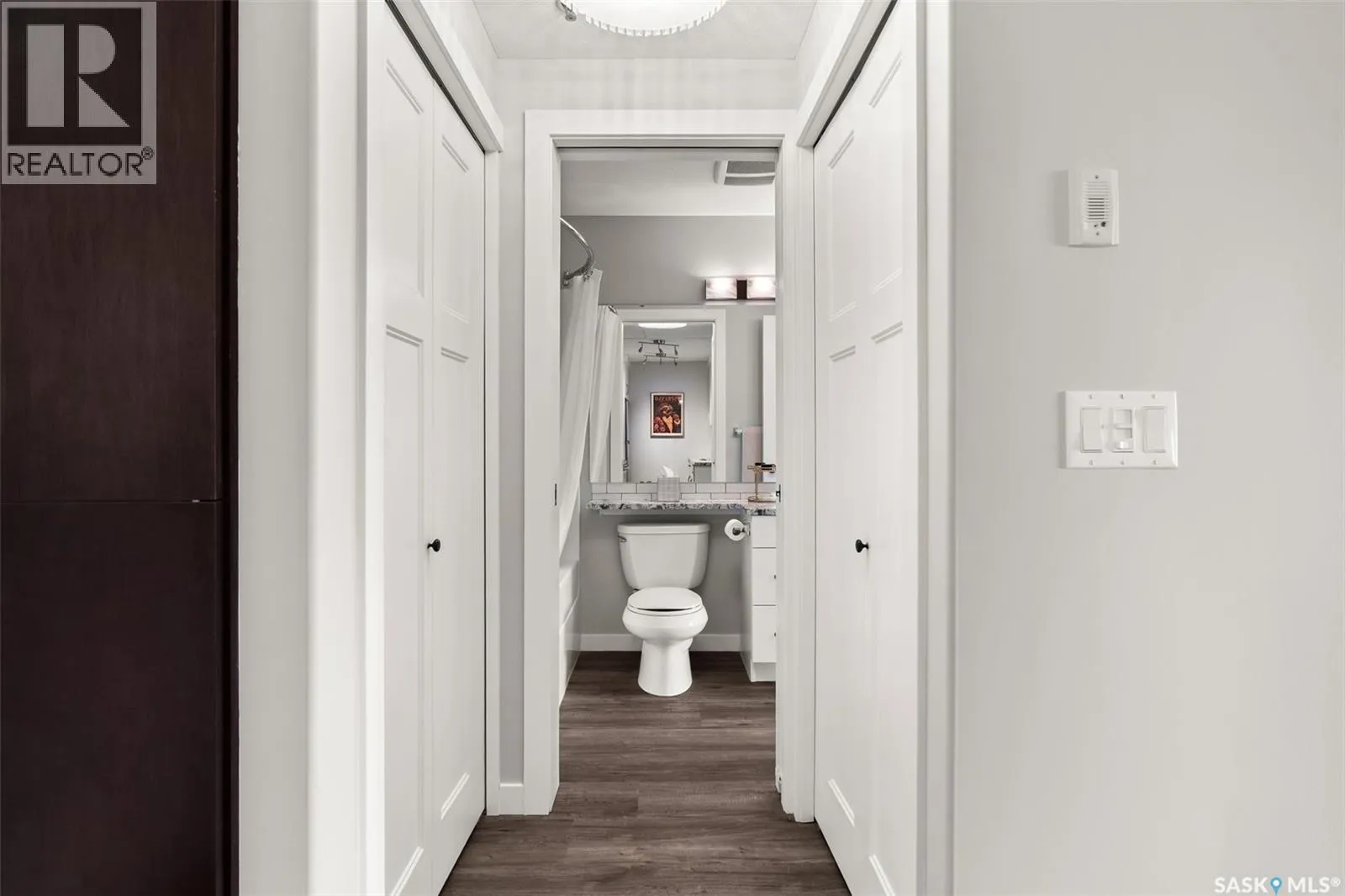 Located in the south end of Regina, across from Wascana Lake, and with convenient access to the U of R, Downtown and all of Regina's South amenities is this modern, upscale one bedroom condo in the Bellagio. Enjoy the sunlit mornings and view from the comfy living room that overlooks the manicured landscaping surrounding the Bellagio. The open concept floor plan is ideal for entertaining or kicking back and relaxing. The dining area features quality built in cabinetry with quartz counter tops plus a built in multipurpose desk. The dining room design maximizes space with functionality. There is also a custom designed wine rack with extra cabinet space. The inviting white kitchen will inspire your culinary skills offering pull out drawers, subway tiled backsplash, quartz counter tops, stainless steel appliances and an eating bar for extra seating. The primary bedroom has large east facing windows, vinyl plank flooring that seamlessly runs through the custom designed walk-through closet and into the 4-piece bath. The condo unit is complete with an in suite laundry area & storage space. Capping it all off, the unit comes with a secured underground parking stall with storage cabinets, plus the Bellagio offers an amenities room and a gym. (id:27476)