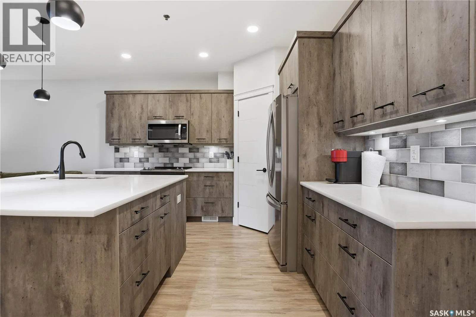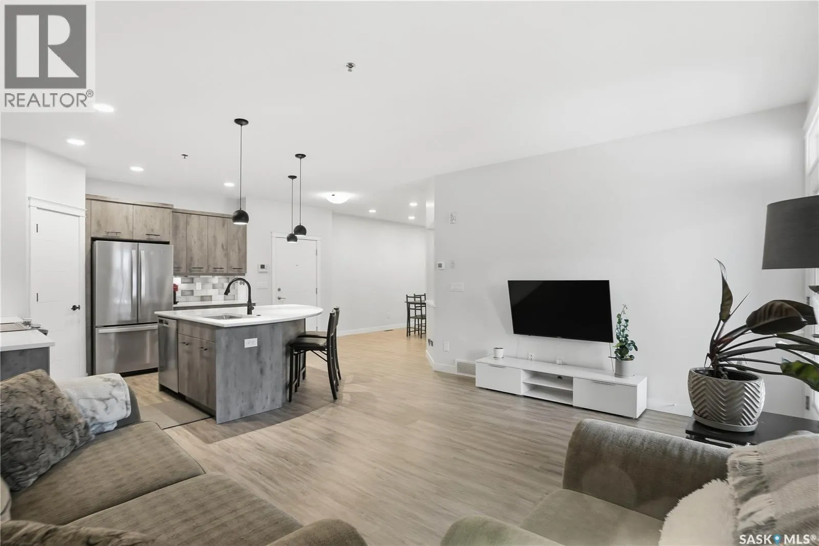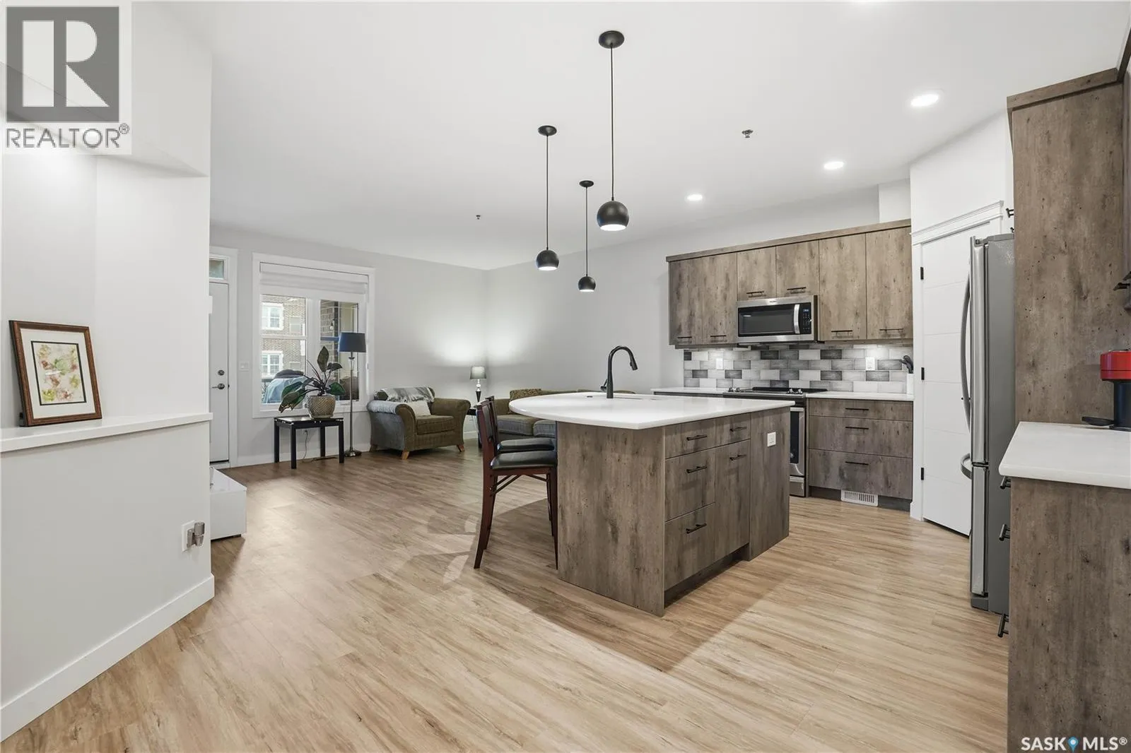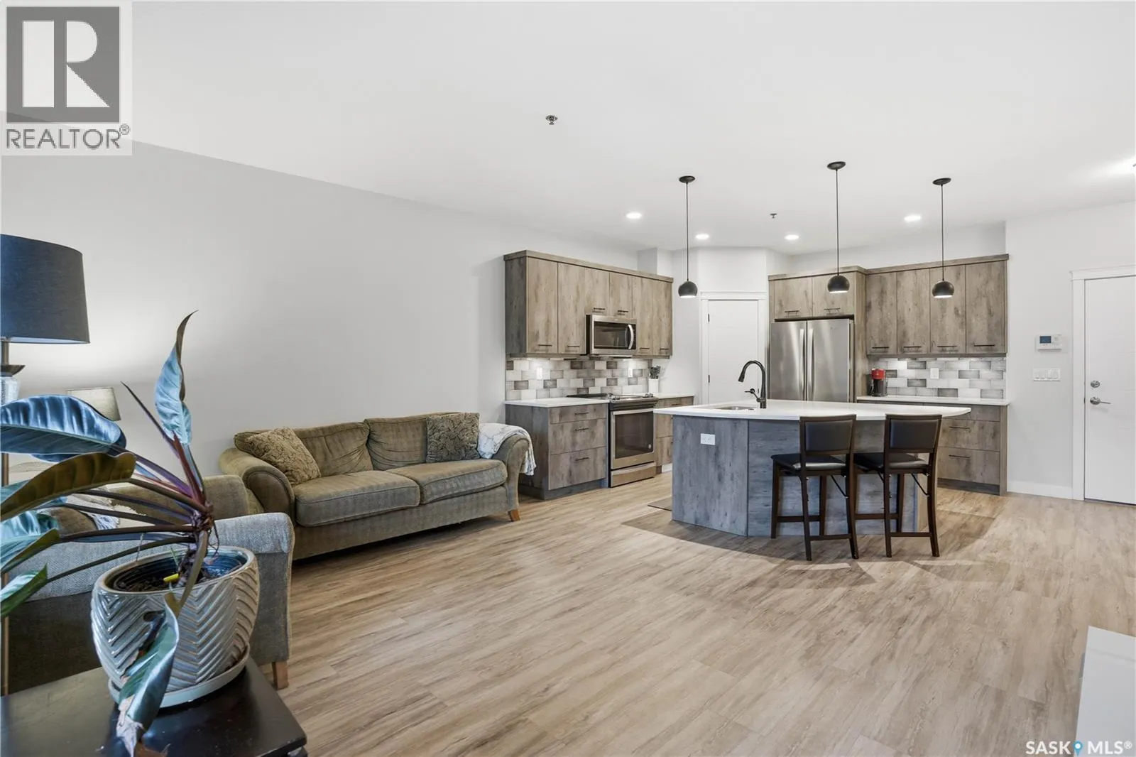 Welcome to this beautifully finished 1,130 sq ft condo offering 2 bedrooms and 2 bathrooms with a bright, open-concept layout. Wide plank vinyl flooring runs throughout the majority of the unit, creating a modern and cohesive feel. The stylish kitchen features white granite countertops, a large island with seating, stainless steel appliances, corner pantry, tiled backsplash, and striking black pendant lighting above the island. The living room offers a patio door leading to your private balcony, while the dining area near the front entrance easily accommodates a large tableâperfect for entertaining. The spacious primary bedroom features plush carpeting, a large walk-in closet (5 x 8), and an impressive ensuite with double sinks, granite countertops, and a walk-in shower. A second bedroom provides flexible space for guests or a home office. The unit also includes a 4-piece main bathroom and a convenient laundry area with tiled flooring. Additional highlights include a heated underground parking stall and private storage. The secure building offers an elevator, amenities room, and a shared rooftop patio for residents to enjoy. Ideally located close to downtown, Wascana Park, and with easy access to the University of Regina. (id:27476)