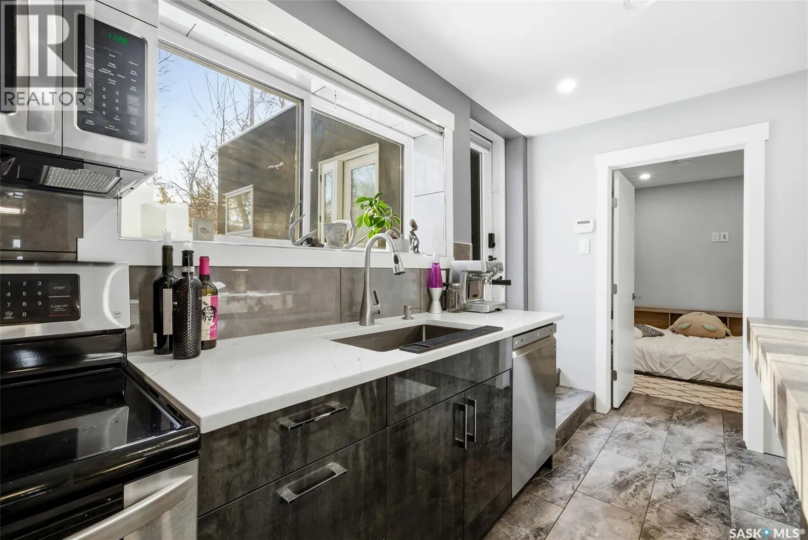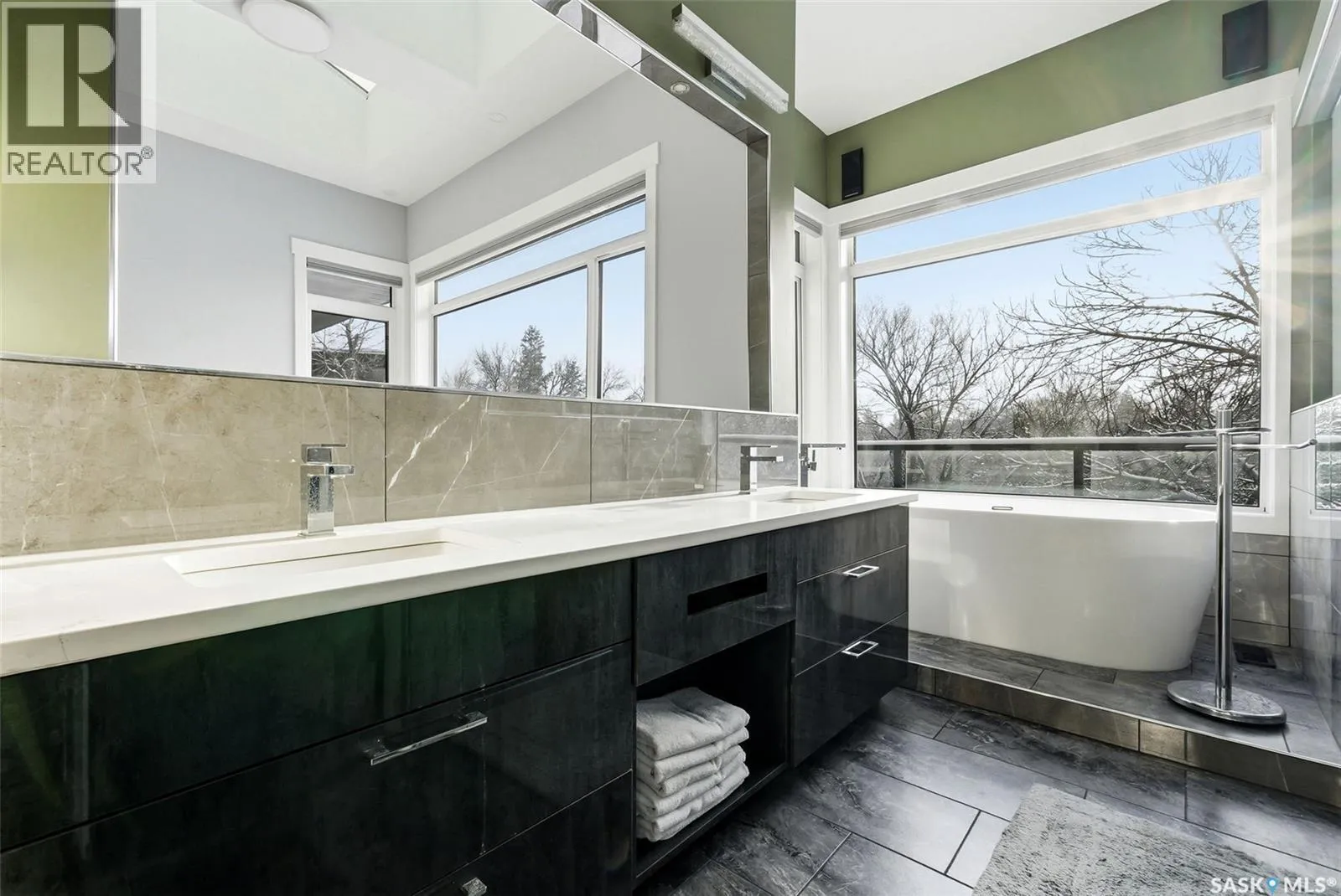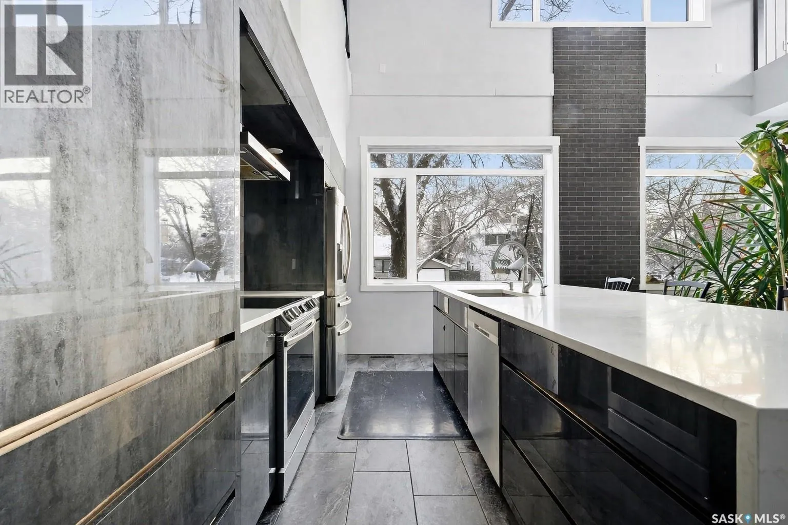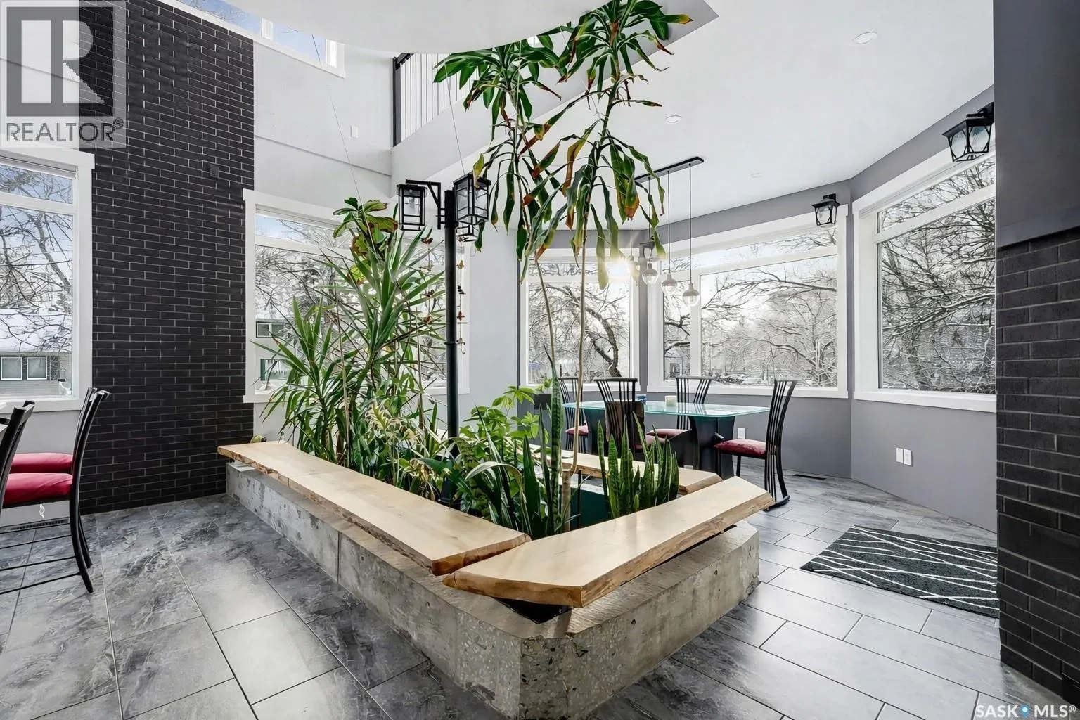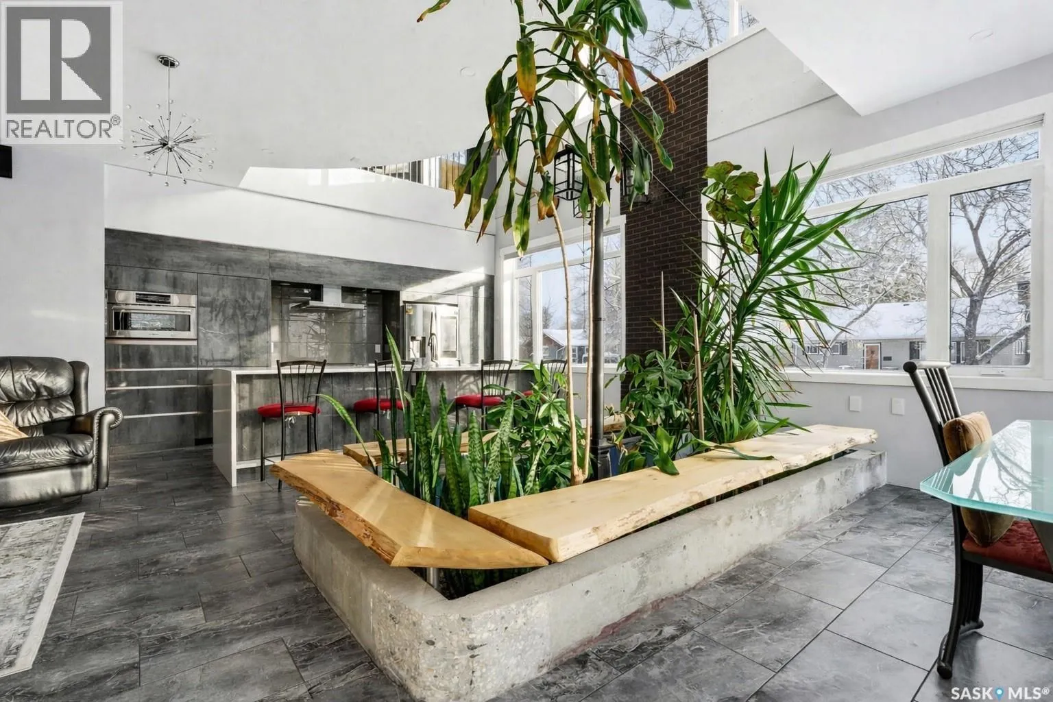 Welcome to an extraordinary architectural statement in the heart of Lakeview. This one of a kind home is a private sanctuary surrounded by mature trees and natural beauty rarely found in the city. Thoughtfully designed to bring the outdoors in, the home offers a sense of calm, space, privacy, and quiet luxury from the moment you arrive. Inside, a dramatic custom curved staircase rises through the centre of the home, creating a striking visual connection between levels. At its heart lies a breathtaking indoor garden sanctuary flooded with sunlight and visible from multiple living spaces, offering a daily connection to nature in every season. Expansive windows frame the surrounding greenery, filling the home with warmth and natural light. The chefâs kitchen is both refined and functional, featuring custom cabinetry, quartz countertops, stainless steel appliances, and a concealed walk-in pantry. Designed for effortless entertaining, the main living areas flow seamlessly into a screened sunroom overlooking the serene backyard. The upper level is a retreat of its own, offering a theatre room overlooking the indoor garden, an office loft, bonus room, an additional bedroom and bathroom, laundry room, and an exceptional primary suite. The primary retreat features abundant natural sunlight, a sitting area, built-in closet, and a spa-inspired ensuite with a custom steam shower and standalone tub. The lower level provides three independent living areas, offering flexibility for multi-generational living or income opportunities. An oversized heated double garage with epoxy flooring and floor drain adds everyday convenience, while a backup generator ensures uninterrupted comfort year round. Outside, the south facing yard unfolds as a secluded urban oasis with a central courtyard, tiered landscaping, retaining walls, and mature greenery creating total privacy. Built on an extensive pile foundation, this home is a rare blend of architectural distinction and lifestyle value. (id:27476)