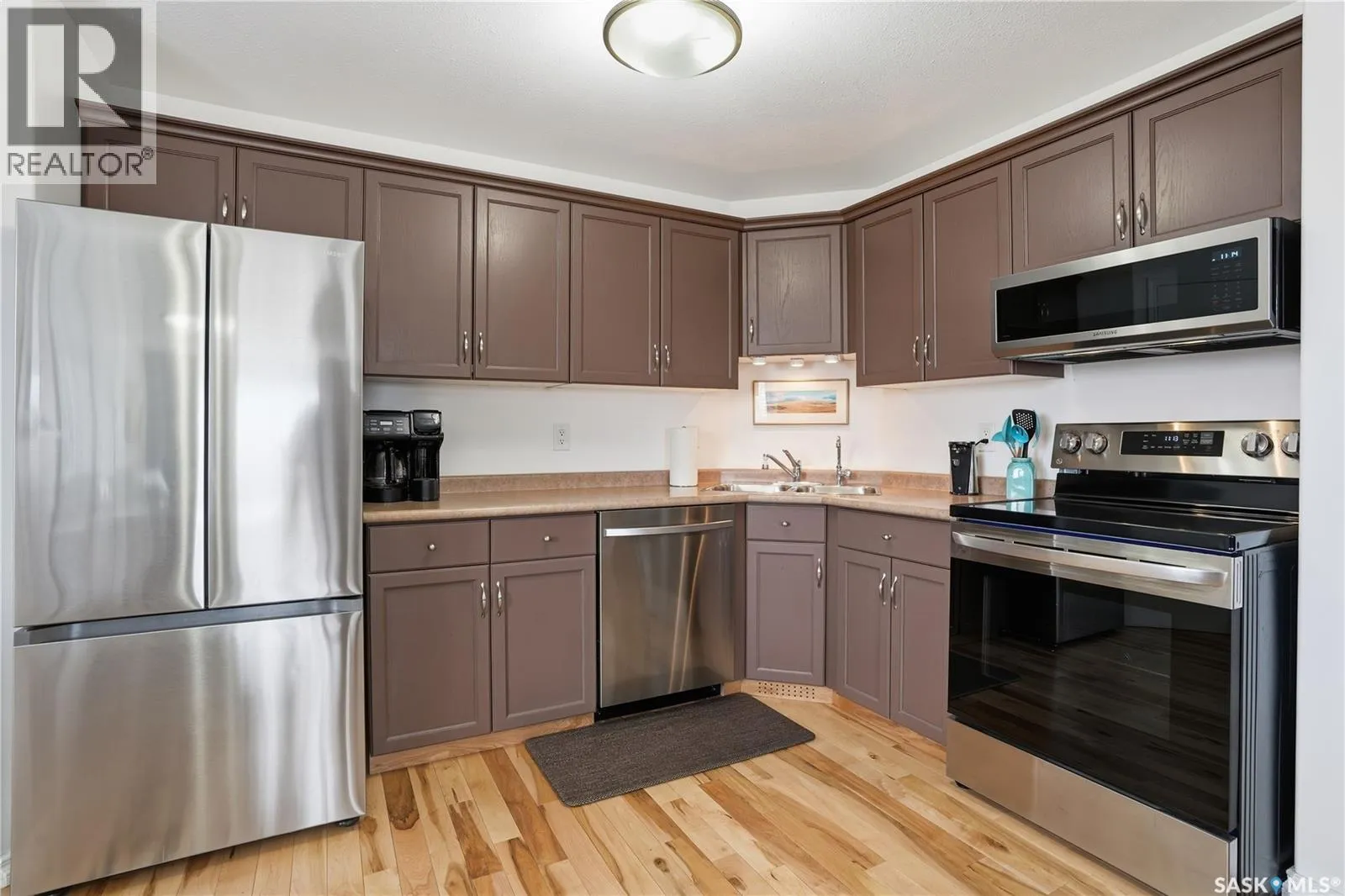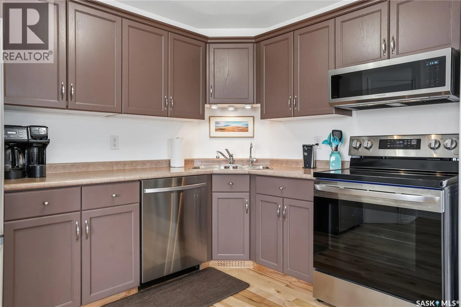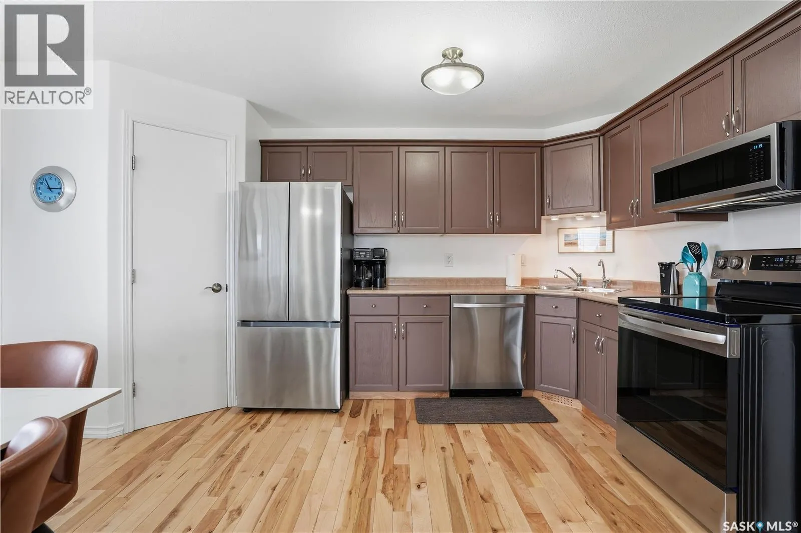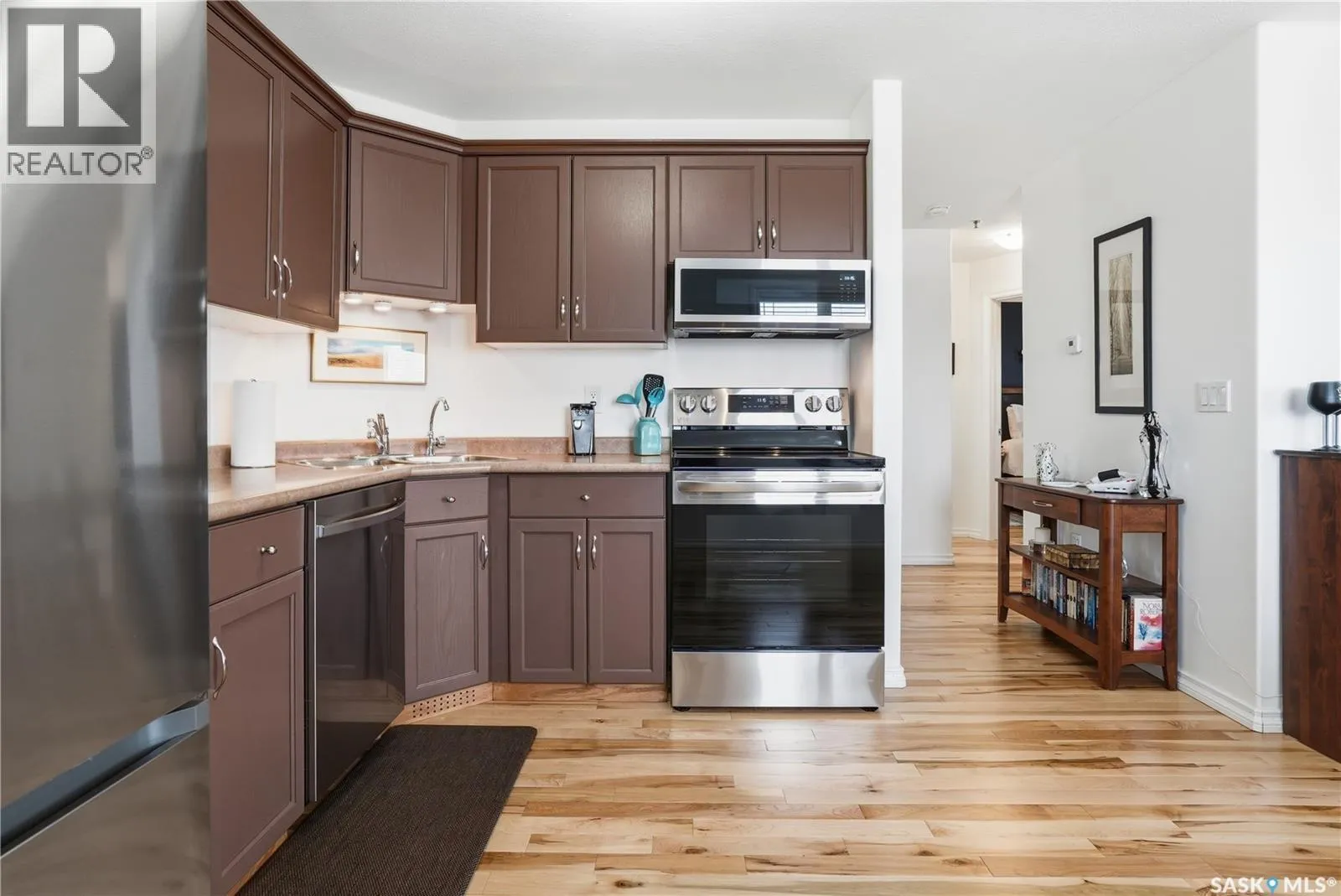 Well maintained two bedroom corner unit with South facing windows and Balcony and West facing windows with view of the city skyline. Open floor plan with bright living room and kitchen, recently installed Maple hardwood with cork underlay throughout the suite with the exception of the bathroom and laundry areas . Kitchen features painted oak cabinetry with corner pantry, recently purchased Stainless steel appliances including built-in dishwasher & microwave hood fan. Two bedrooms plus full bathroom. In suite laundry room plus storage area. Central air conditioning. One underground heated parking space included. Located close to all the east end shopping, restaurants, bus stop and park. (id:27476)