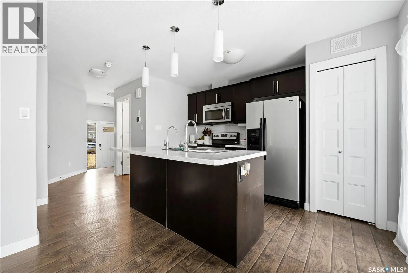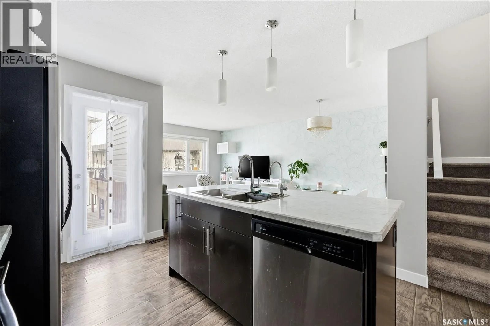 This beautiful townhome is located just steps away from Norseman Park in the desirable Harbour Landing Neighbourhood! This home offers easy access to green space, walking paths and is a quick drive to all the Grassland amenities. Inside, youâll find a neutral colour palette that gives the home a clean and modern feel. The main floor has an open-concept layout with a bright living room featuring large windows and a designated dining area for family dinners or entertaining. The kitchen features rich dark cabinetry, a tile backsplash, stainless steel appliances and a central island with an eat-up bar. A two-piece bathroom and direct entry to the attached garage complete the main floor. Heading up the stairs you'll find the primary bedroom which includes a large walk-in closet and a full 4-piece ensuite. Two additional bedrooms, a 4-piece bathroom and a convenient laundry room round out this level. The basement is 80% developed with framing and drywall up for a rec room, den/bedroom and a 4-piece bathroom just awaiting finishing touches. There is a private East facing deck with garden door access from the kitchen to catch the beautiful morning sunrise. The oversized attached garage adds everyday convenience. You do not want to miss out on this opportunity! (id:27476)