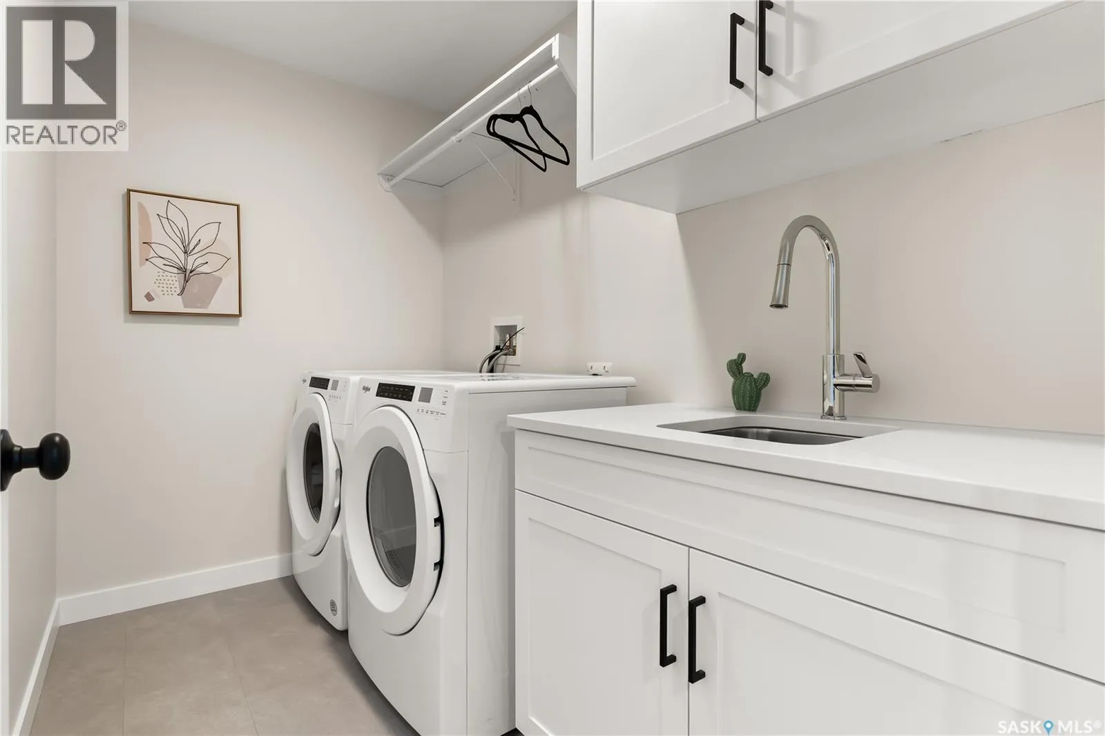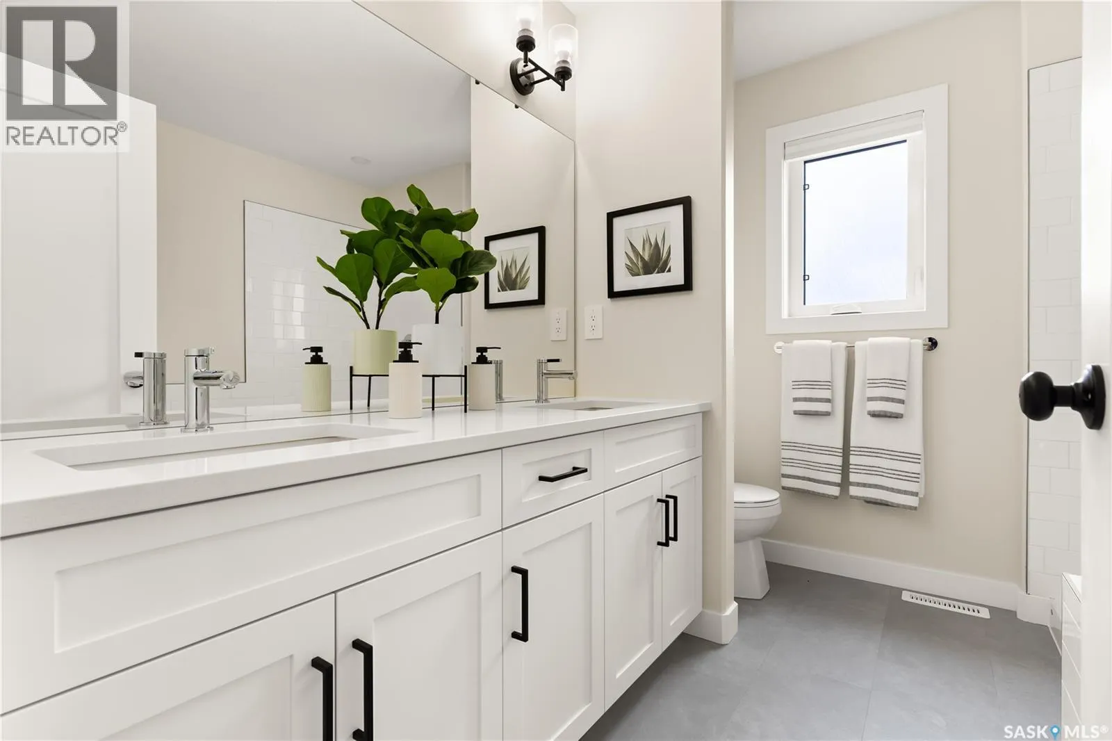 UNDER CONSTRUCTION! Discover this stunning 2,213 sq ft two-story brand-new build in the highly sought-after Harbour Landing neighborhood. This elegant home features a double front-attached garage and a separate side entrance, offering both convenience and curb appeal. As you step inside, youâre welcomed by an open and spacious floor plan, perfect for modern family living. The bright foyer flows effortlessly into the inviting kitchen and living area, creating a perfect space for relaxation and entertaining. The kitchen boasts an abundance of counter space, a functional island with an eat-up bar, and ample storage to satisfy any home chef. Adjacent to the kitchen is the dining room, thoughtfully designed for family meals and gatherings. A versatile main-floor bedroom, which can also serve as a home office or den, completes the first level. Upstairs, the expansive primary suite serves as a serene retreat with a large walk-in closet and a luxurious en-suite bathroom featuring dual sinks. Three additional spacious bedrooms offer flexibility for guests, hobbies, or additional workspace. The convenience of second-floor laundry, a bonus room perfect for family movie nights or a play area, and an additional 5-piece bathroom round out this level. The double-attached garage provides secure parking and additional storage space. Situated in a vibrant community with easy access to parks, schools, and all essential amenities, this home blends comfort, style, and functionality. Donât miss your chance to own this beautiful home in Harbour Landing! (PST/GST are included within purchase price). Note: Interior photos are from a previous build. Same model but some colours may vary. Front photo is a rendering only and may vary. (id:27476)