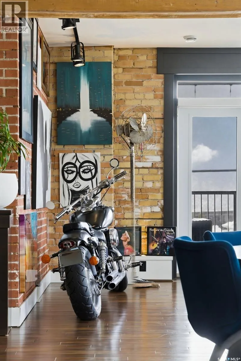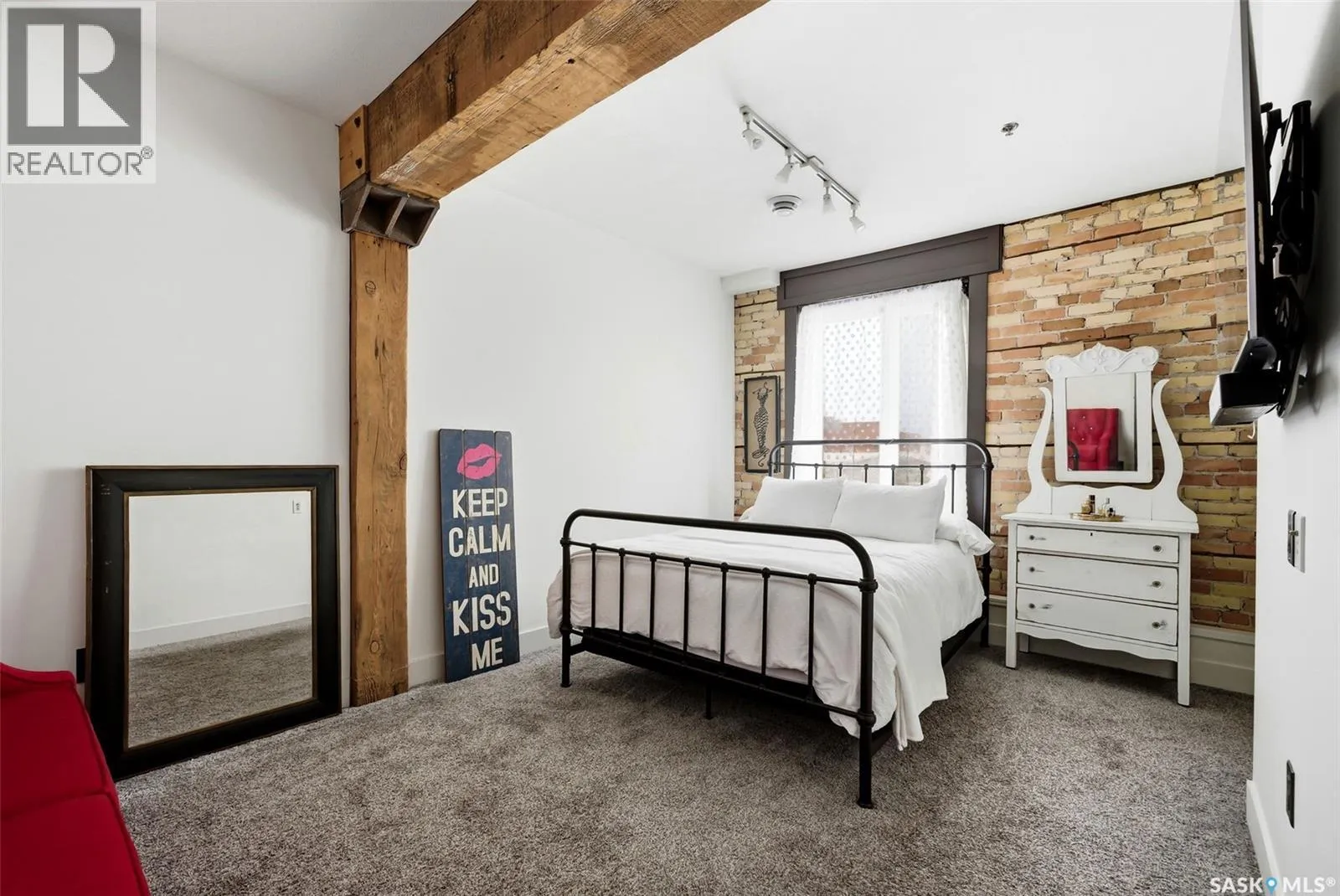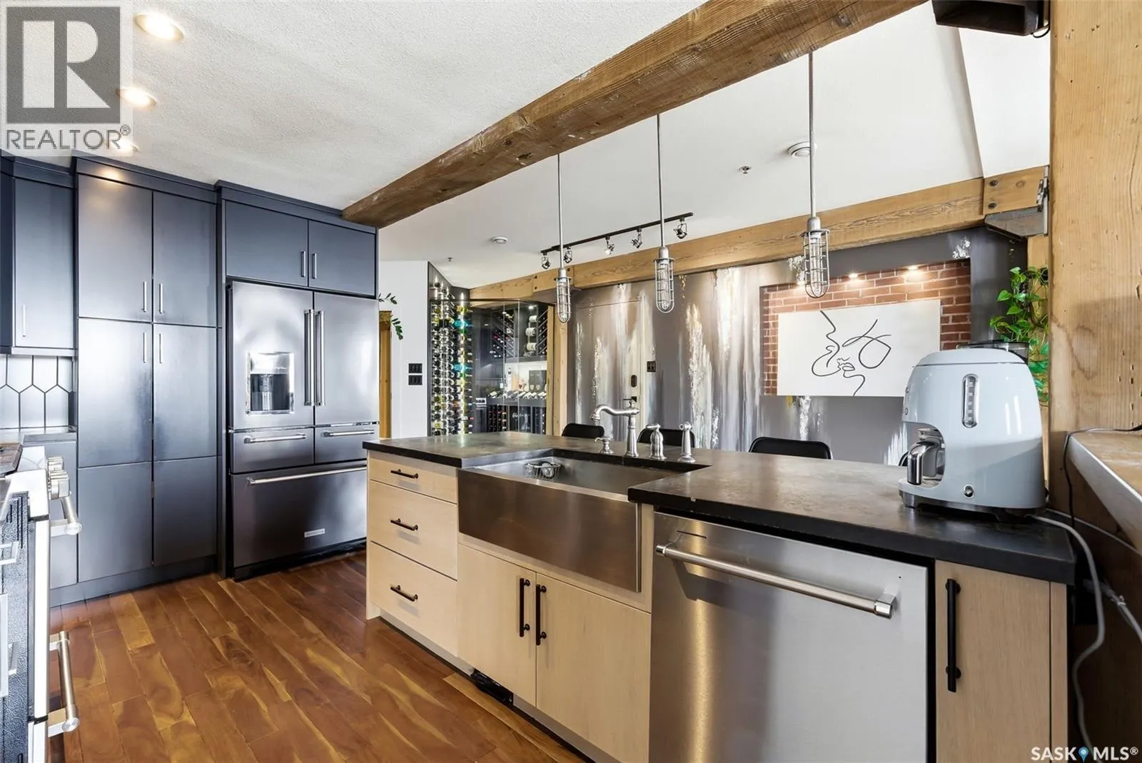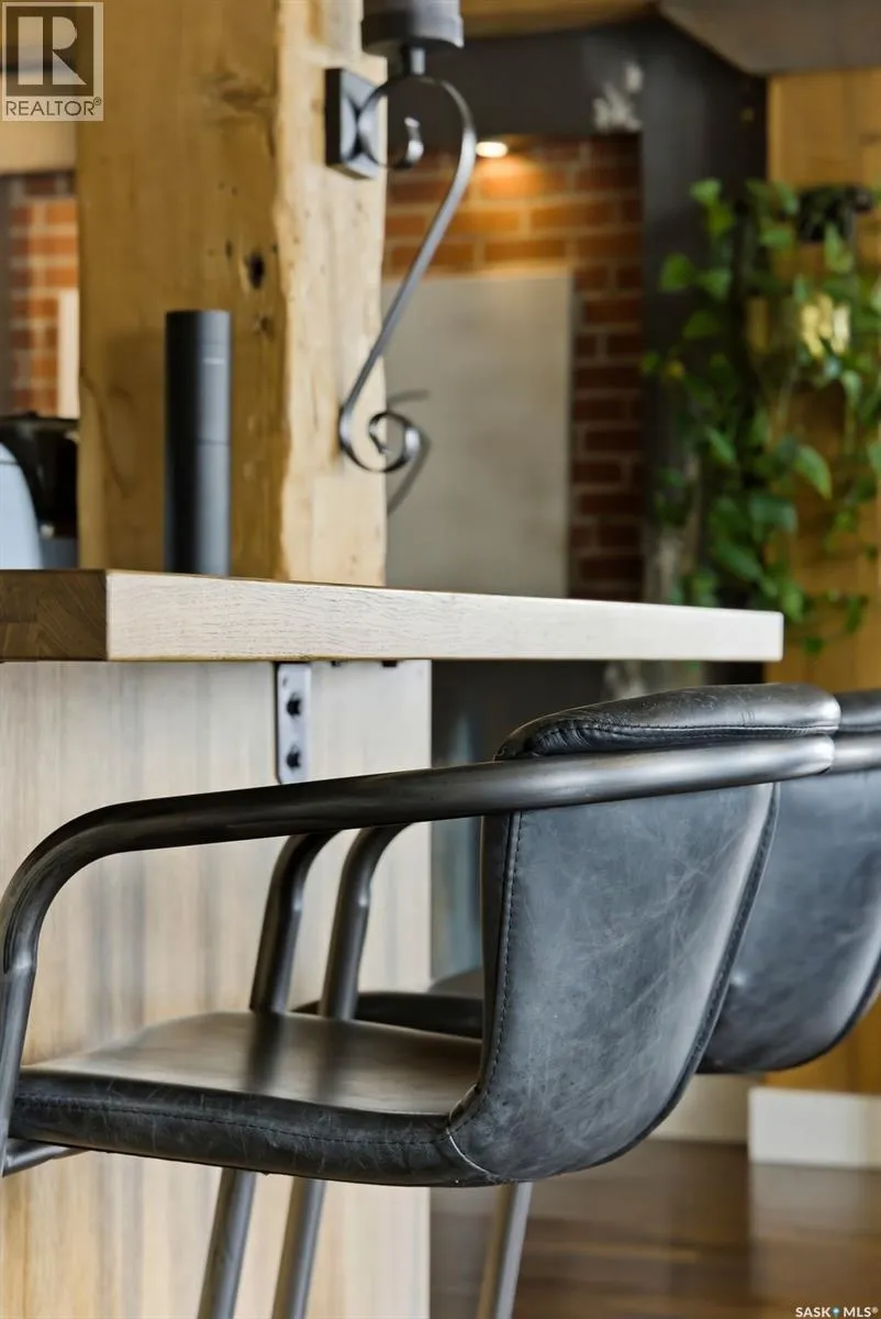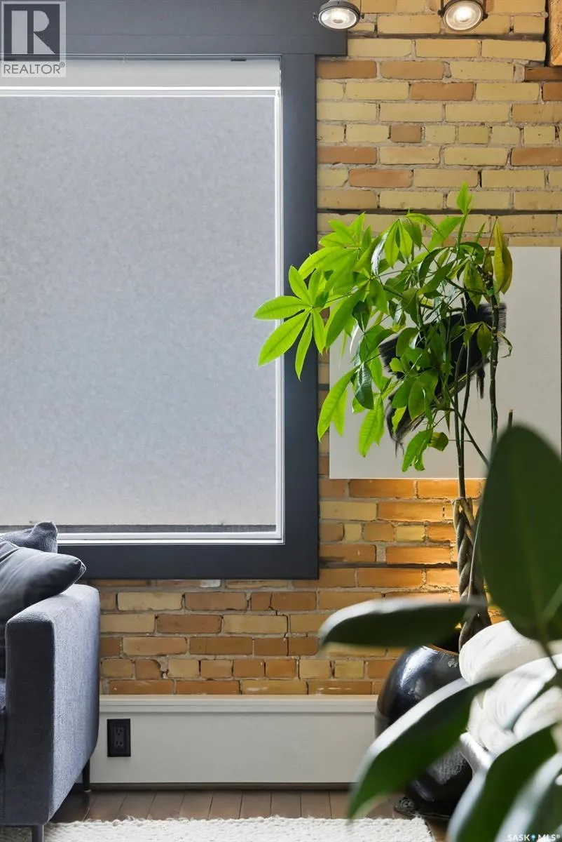 Located in Reginaâs Warehouse District, this stunning one-of-kind loft delivers a rare blend of character, space, and modern updates. The open-concept design features two distinct living areas, formal dining space, and beautifully updated kitchenâall anchored by rich American walnut hardwood and framed by original exposed brick and beam construction. The space feels both effortlessly cool & very functional. South & west-facing exposures flood the space with natural light while offering views of the downtown skyline, and our iconic prairie sunsets. The spacious primary suite features a walk-in closet and an updated ensuite complete with soaker tub, custom tile shower, & double vanity. The 2nd bedroom also includes a walk-in closet w/custom organizers. The main bath has also been updated, elevating everyday comfort with heated floors and a jetted tub/shower combo. The kitchen is both stylish & functional, showcasing updated dark-stained Gun Metal Blue maple cabinetry, concrete countertops, stainless appliances, tiled backsplash & statement feature wall by Justine Marie Studios. The solid wood stand-up eating bar creates the perfect hub for hosting. And we canât forget about the newly added sleek glass-front wine cellarâan elegant focal point for entertaining and display. A versatile laundry/bonus room offers flexibility for a home office, den, guest space, or gym. Step outside to your impressive 19â x 23â private deck complete with a natural gas BBQ hookup, water line for plants, low-maintenance decking, and electronic sunshades. This outdoor space overlooks the landscaped courtyard & pool shared by only nine owners. Highlights include: Double detached garage + parking stall inside the gated compound; large basement storage unit; Updated appliances (KitchenAid French Door fridge & dishwasher); Owned water heater; Updated lighting, paint & remote blinds throughout. Contact your agent to schedule your private viewing. (id:27476)