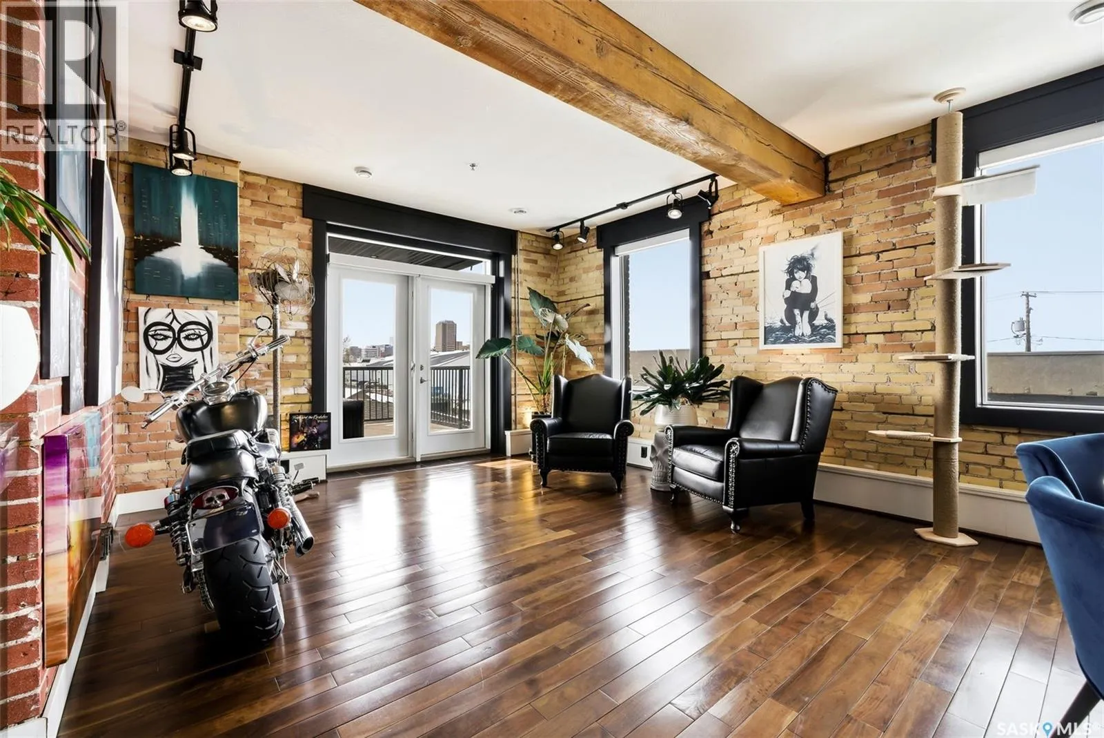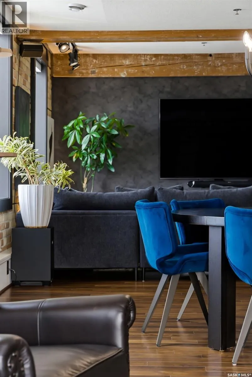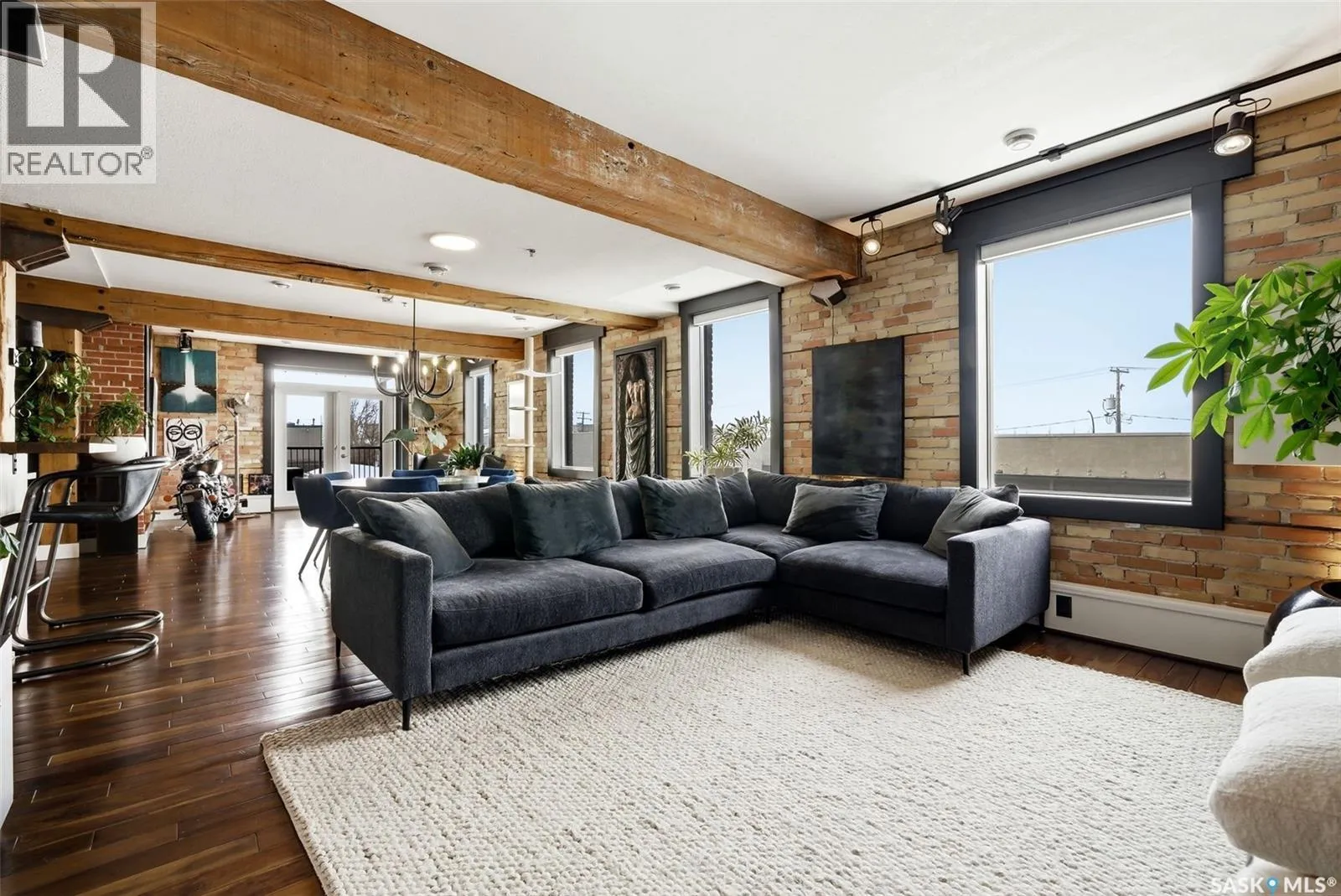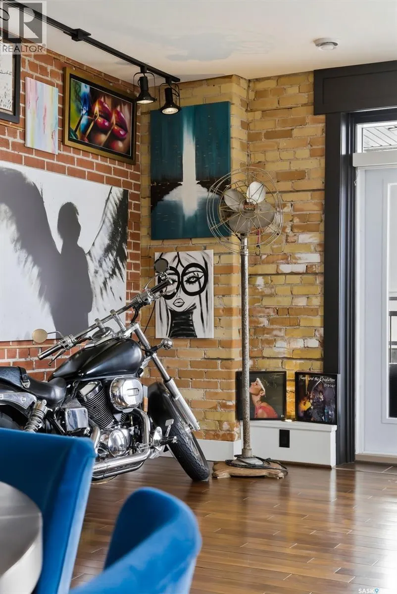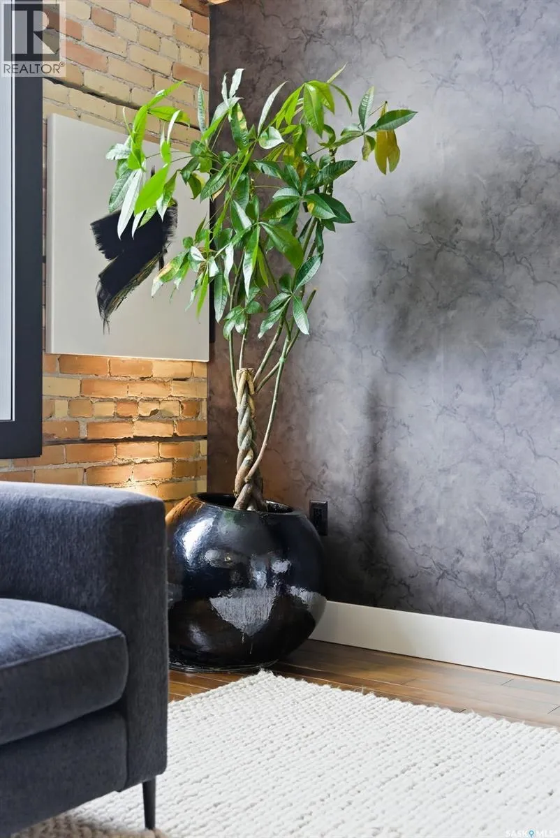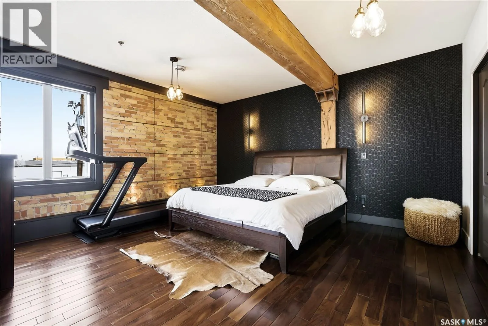 Located in Reginaâs Warehouse District, this stunning one-of-kind loft delivers a rare blend of character, space, and modern updates. The open-concept design features two distinct living areas, formal dining space, and beautifully updated kitchenâall anchored by rich American walnut hardwood and framed by original exposed brick and beam construction. The space feels both effortlessly cool & very functional. South & west-facing exposures flood the space with natural light while offering views of the downtown skyline, and our iconic prairie sunsets. The spacious primary suite features a walk-in closet and an updated ensuite complete with soaker tub, custom tile shower, & double vanity. The 2nd bedroom also includes a walk-in closet w/custom organizers. The main bath has also been updated, elevating everyday comfort with heated floors and a jetted tub/shower combo. The kitchen is both stylish & functional, showcasing updated dark-stained Gun Metal Blue maple cabinetry, concrete countertops, stainless appliances, tiled backsplash & statement feature wall by Justine Marie Studios. The solid wood stand-up eating bar creates the perfect hub for hosting. And we canât forget about the newly added sleek glass-front wine cellarâan elegant focal point for entertaining and display. A versatile laundry/bonus room offers flexibility for a home office, den, guest space, or gym. Step outside to your impressive 19â x 23â private deck complete with a natural gas BBQ hookup, water line for plants, low-maintenance decking, and electronic sunshades. This outdoor space overlooks the landscaped courtyard & pool shared by only nine owners. Highlights include: Double detached garage + parking stall inside the gated compound; large basement storage unit; Updated appliances (KitchenAid French Door fridge & dishwasher); Owned water heater; Updated lighting, paint & remote blinds throughout. Contact your agent to schedule your private viewing. (id:27476)
