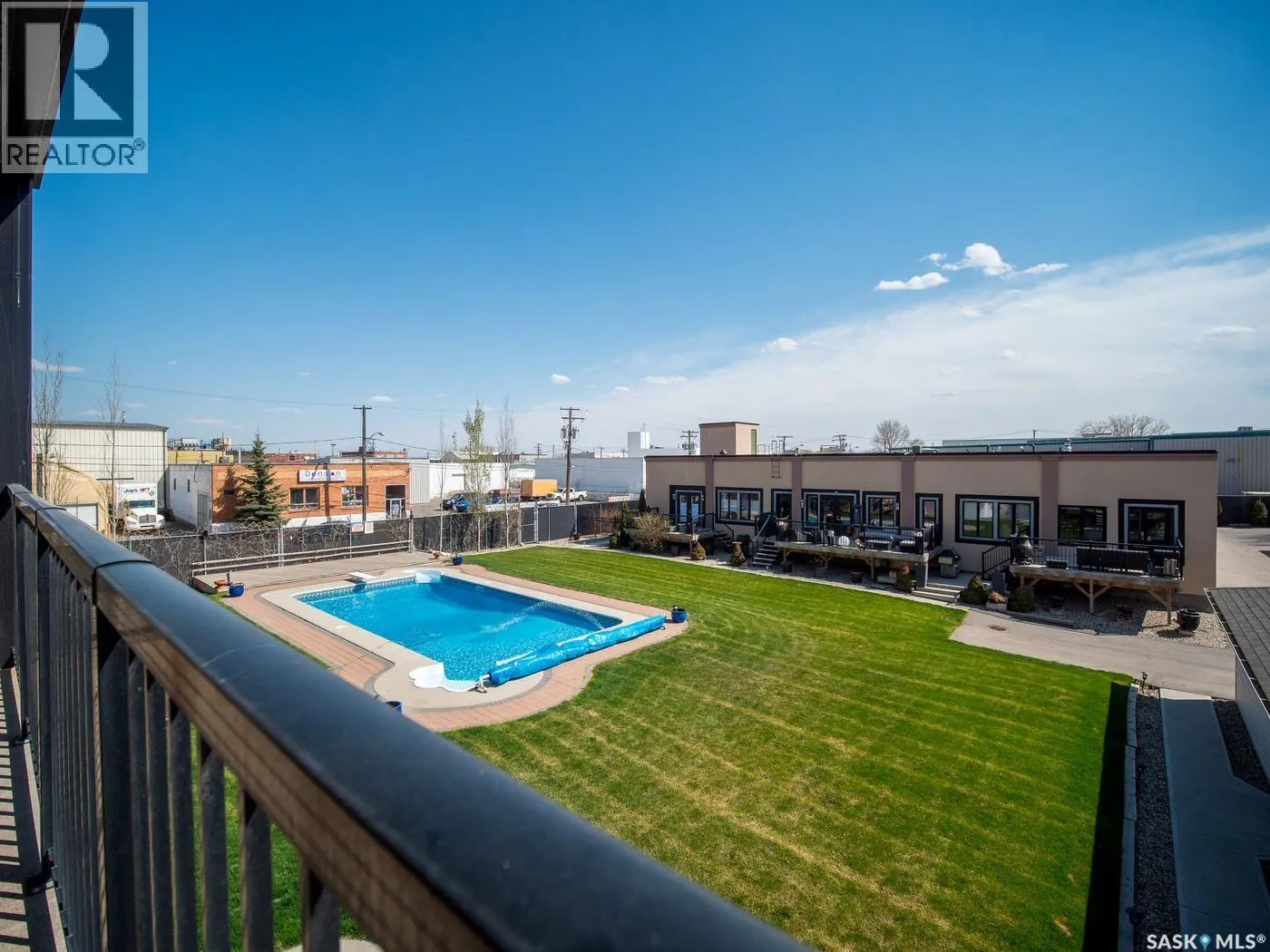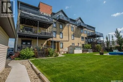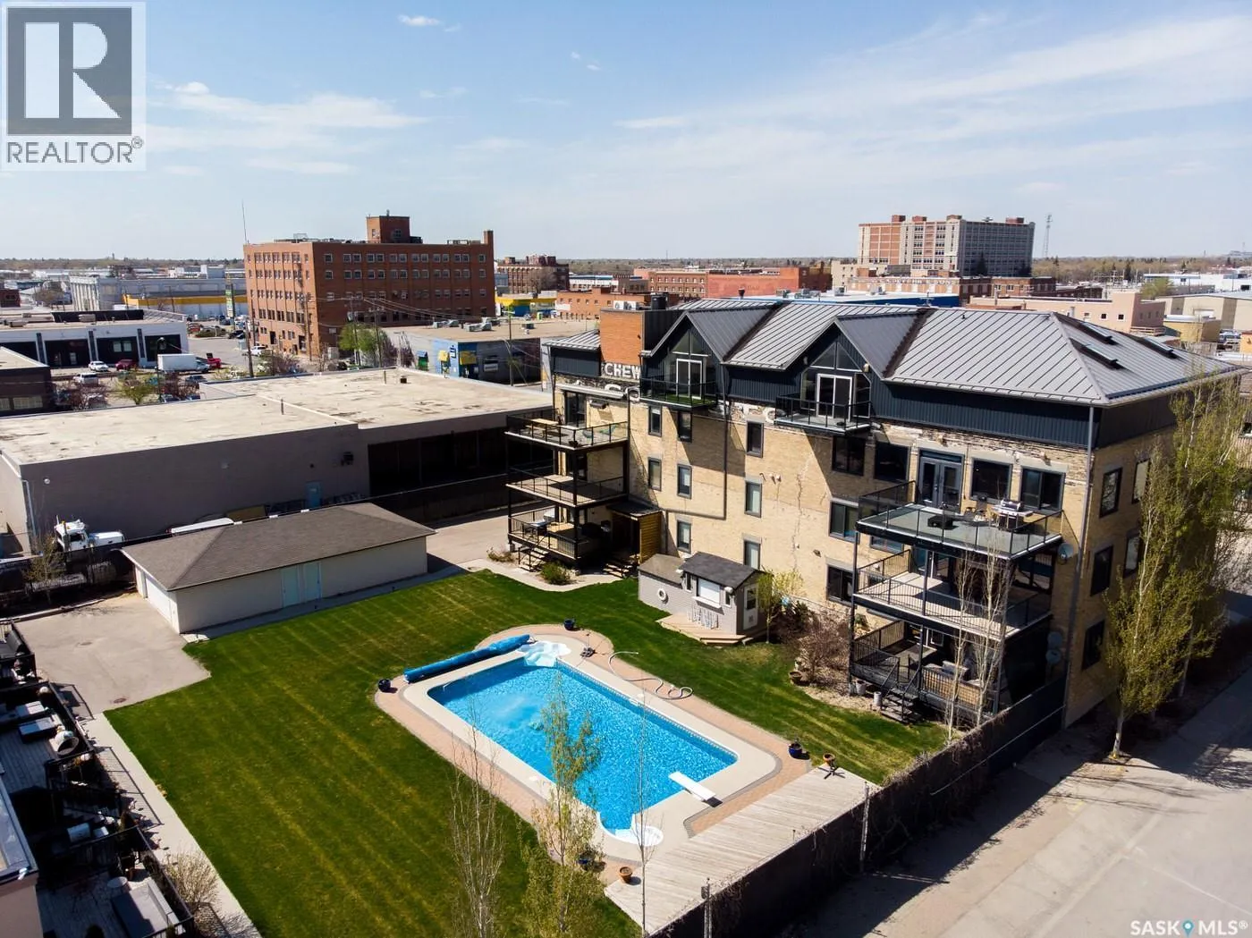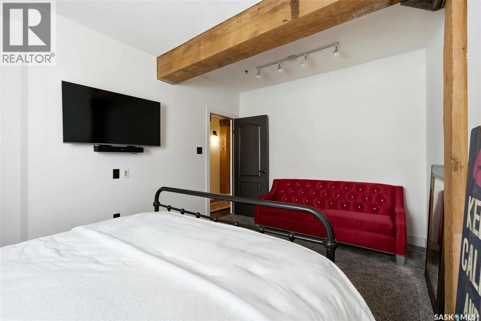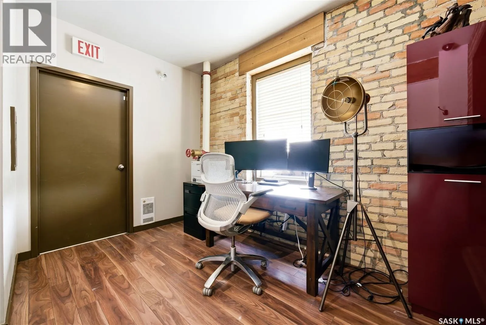 Located in Reginaâs Warehouse District, this stunning one-of-kind loft delivers a rare blend of character, space, and modern updates. The open-concept design features two distinct living areas, formal dining space, and beautifully updated kitchenâall anchored by rich American walnut hardwood and framed by original exposed brick and beam construction. The space feels both effortlessly cool & very functional. South & west-facing exposures flood the space with natural light while offering views of the downtown skyline, and our iconic prairie sunsets. The spacious primary suite features a walk-in closet and an updated ensuite complete with soaker tub, custom tile shower, & double vanity. The 2nd bedroom also includes a walk-in closet w/custom organizers. The main bath has also been updated, elevating everyday comfort with heated floors and a jetted tub/shower combo. The kitchen is both stylish & functional, showcasing updated dark-stained Gun Metal Blue maple cabinetry, concrete countertops, stainless appliances, tiled backsplash & statement feature wall by Justine Marie Studios. The solid wood stand-up eating bar creates the perfect hub for hosting. And we canât forget about the newly added sleek glass-front wine cellarâan elegant focal point for entertaining and display. A versatile laundry/bonus room offers flexibility for a home office, den, guest space, or gym. Step outside to your impressive 19â x 23â private deck complete with a natural gas BBQ hookup, water line for plants, low-maintenance decking, and electronic sunshades. This outdoor space overlooks the landscaped courtyard & pool shared by only nine owners. Highlights include: Double detached garage + parking stall inside the gated compound; large basement storage unit; Updated appliances (KitchenAid French Door fridge & dishwasher); Owned water heater; Updated lighting, paint & remote blinds throughout. Contact your agent to schedule your private viewing. (id:27476)
