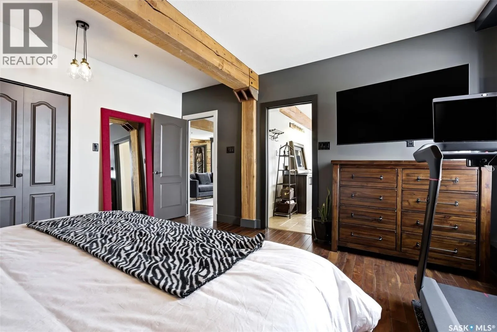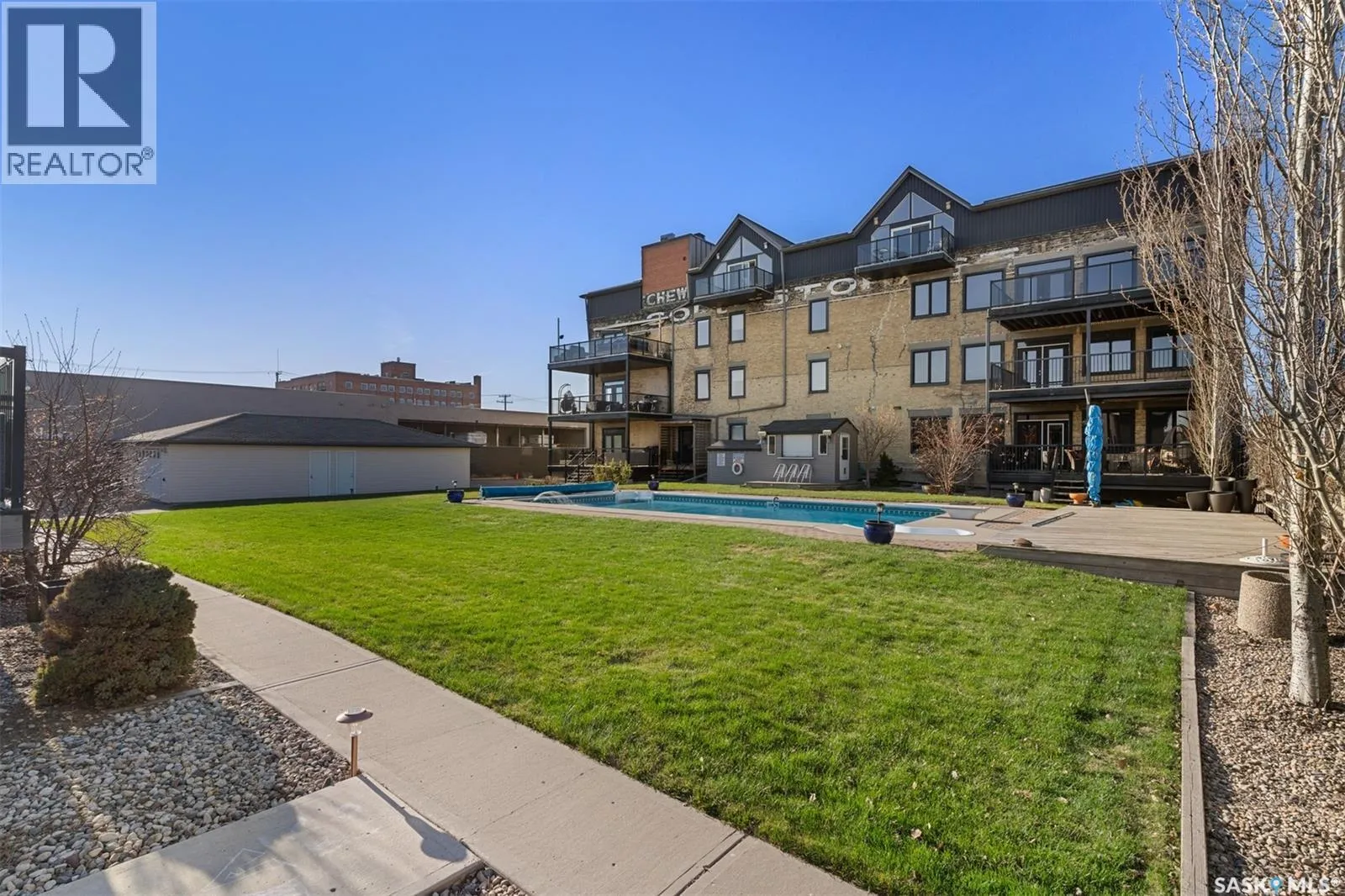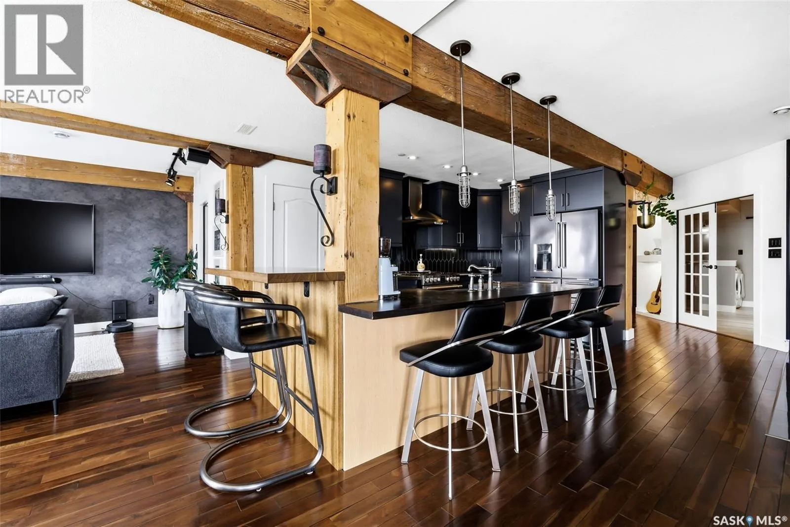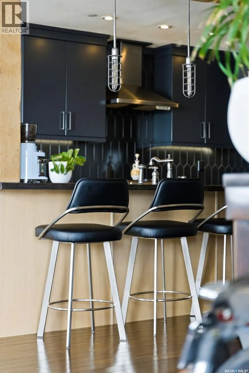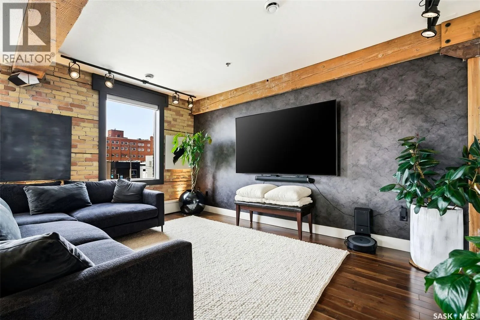 Located in Reginaâs Warehouse District, this stunning one-of-kind loft delivers a rare blend of character, space, and modern updates. The open-concept design features two distinct living areas, formal dining space, and beautifully updated kitchenâall anchored by rich American walnut hardwood and framed by original exposed brick and beam construction. The space feels both effortlessly cool & very functional. South & west-facing exposures flood the space with natural light while offering views of the downtown skyline, and our iconic prairie sunsets. The spacious primary suite features a walk-in closet and an updated ensuite complete with soaker tub, custom tile shower, & double vanity. The 2nd bedroom also includes a walk-in closet w/custom organizers. The main bath has also been updated, elevating everyday comfort with heated floors and a jetted tub/shower combo. The kitchen is both stylish & functional, showcasing updated dark-stained Gun Metal Blue maple cabinetry, concrete countertops, stainless appliances, tiled backsplash & statement feature wall by Justine Marie Studios. The solid wood stand-up eating bar creates the perfect hub for hosting. And we canât forget about the newly added sleek glass-front wine cellarâan elegant focal point for entertaining and display. A versatile laundry/bonus room offers flexibility for a home office, den, guest space, or gym. Step outside to your impressive 19â x 23â private deck complete with a natural gas BBQ hookup, water line for plants, low-maintenance decking, and electronic sunshades. This outdoor space overlooks the landscaped courtyard & pool shared by only nine owners. Highlights include: Double detached garage + parking stall inside the gated compound; large basement storage unit; Updated appliances (KitchenAid French Door fridge & dishwasher); Owned water heater; Updated lighting, paint & remote blinds throughout. Contact your agent to schedule your private viewing. (id:27476)
