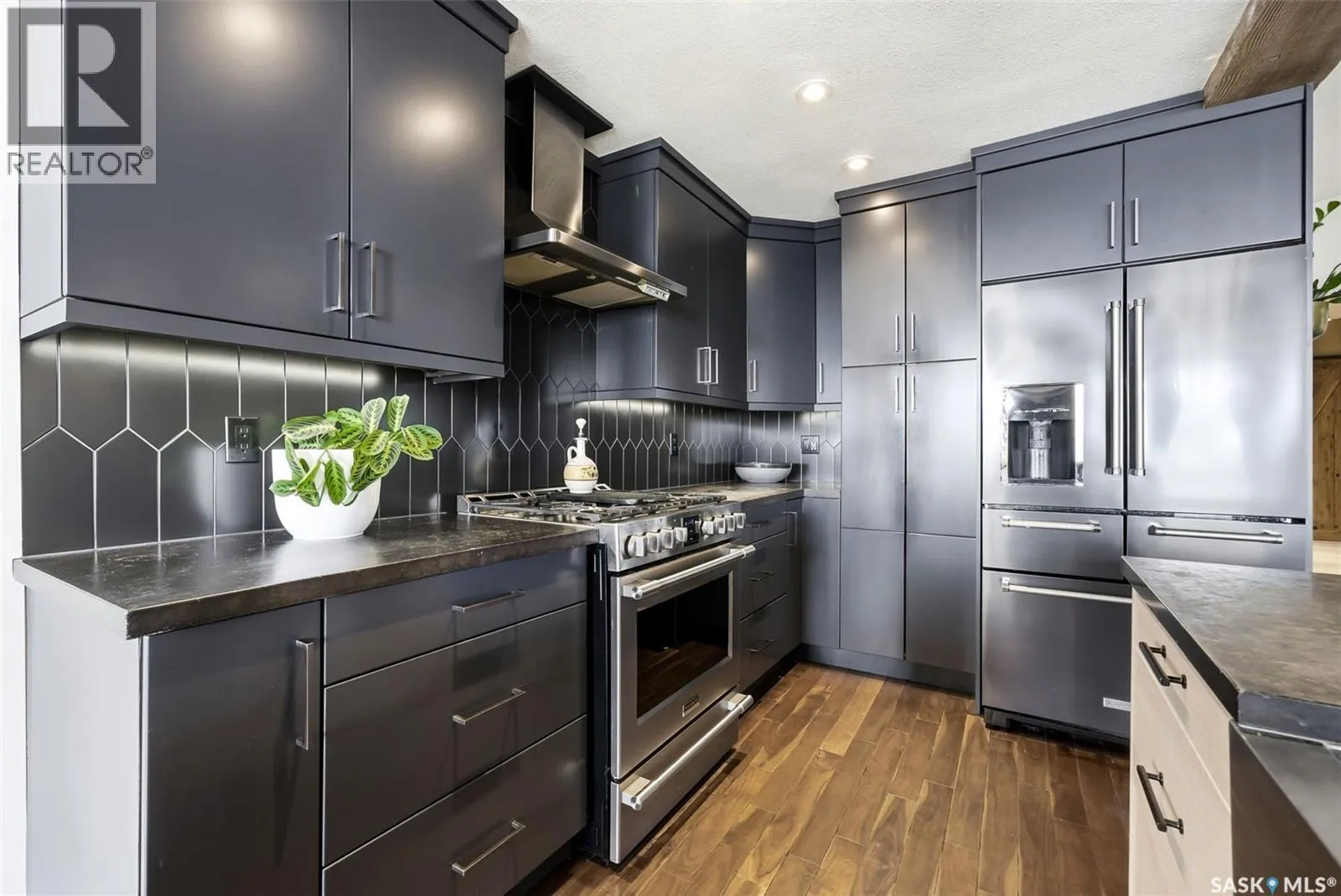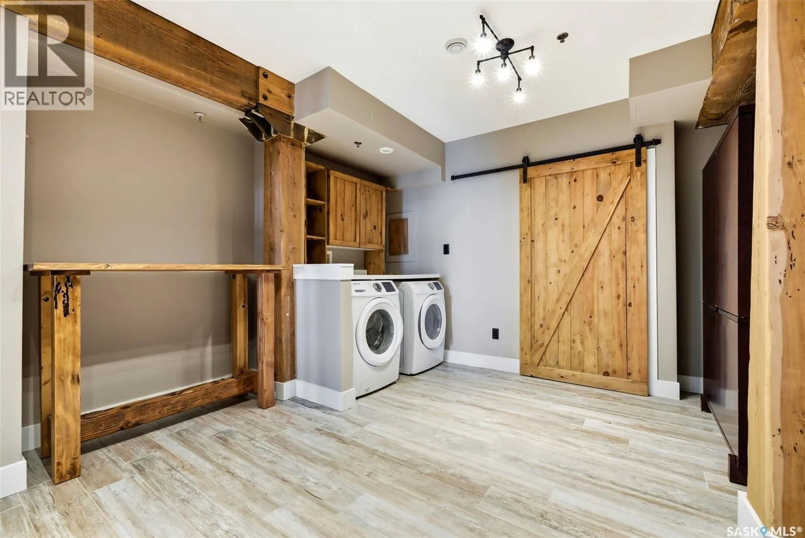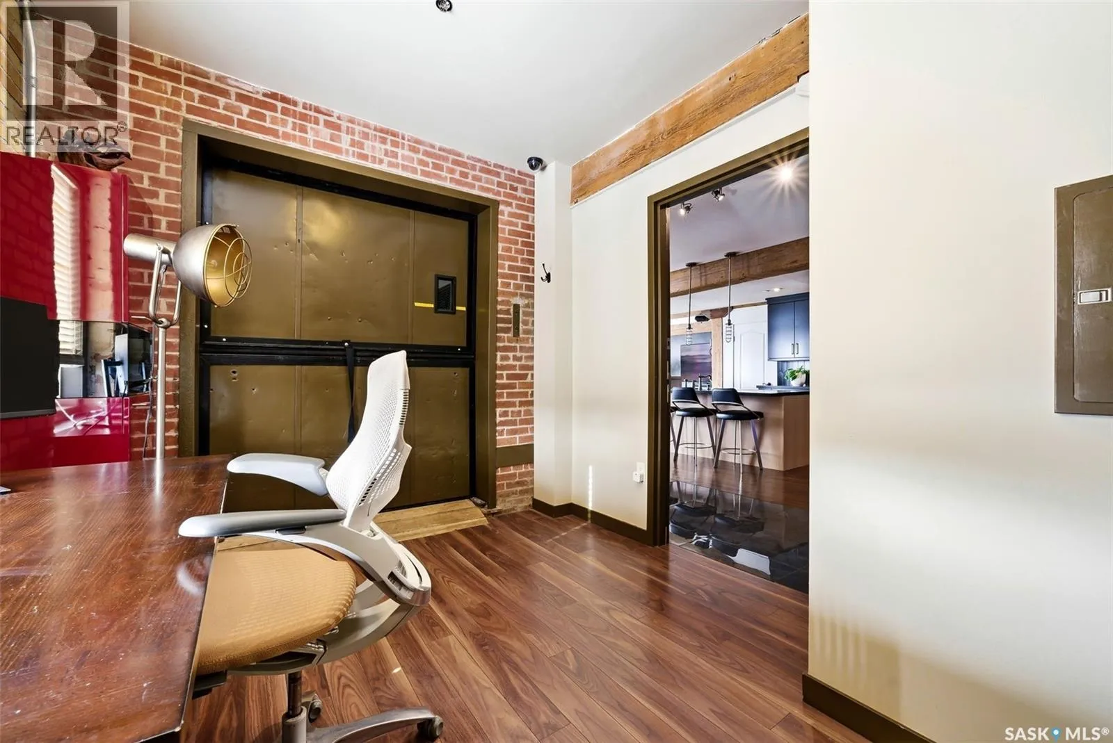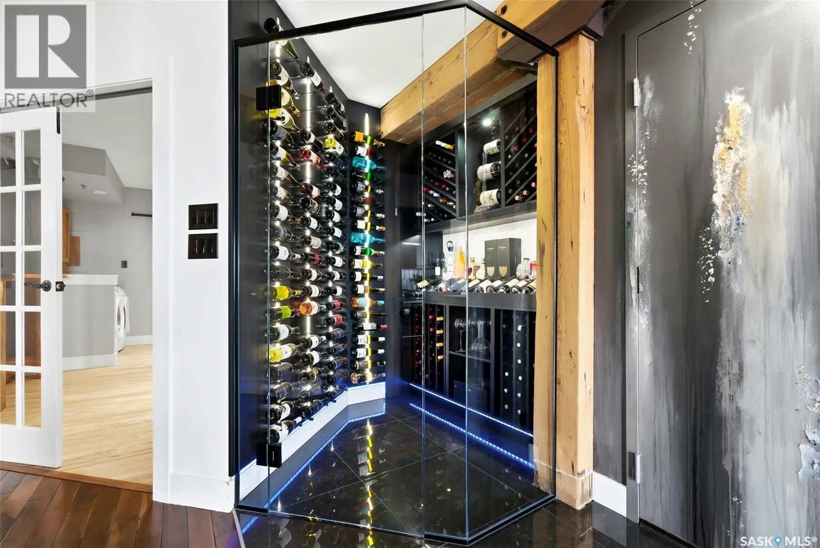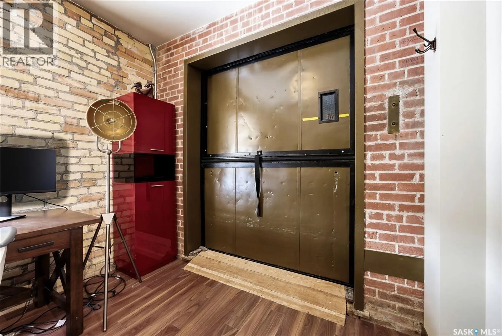 Located in Reginaâs Warehouse District, this stunning one-of-kind loft delivers a rare blend of character, space, and modern updates. The open-concept design features two distinct living areas, formal dining space, and beautifully updated kitchenâall anchored by rich American walnut hardwood and framed by original exposed brick and beam construction. The space feels both effortlessly cool & very functional. South & west-facing exposures flood the space with natural light while offering views of the downtown skyline, and our iconic prairie sunsets. The spacious primary suite features a walk-in closet and an updated ensuite complete with soaker tub, custom tile shower, & double vanity. The 2nd bedroom also includes a walk-in closet w/custom organizers. The main bath has also been updated, elevating everyday comfort with heated floors and a jetted tub/shower combo. The kitchen is both stylish & functional, showcasing updated dark-stained Gun Metal Blue maple cabinetry, concrete countertops, stainless appliances, tiled backsplash & statement feature wall by Justine Marie Studios. The solid wood stand-up eating bar creates the perfect hub for hosting. And we canât forget about the newly added sleek glass-front wine cellarâan elegant focal point for entertaining and display. A versatile laundry/bonus room offers flexibility for a home office, den, guest space, or gym. Step outside to your impressive 19â x 23â private deck complete with a natural gas BBQ hookup, water line for plants, low-maintenance decking, and electronic sunshades. This outdoor space overlooks the landscaped courtyard & pool shared by only nine owners. Highlights include: Double detached garage + parking stall inside the gated compound; large basement storage unit; Updated appliances (KitchenAid French Door fridge & dishwasher); Owned water heater; Updated lighting, paint & remote blinds throughout. Contact your agent to schedule your private viewing. (id:27476)