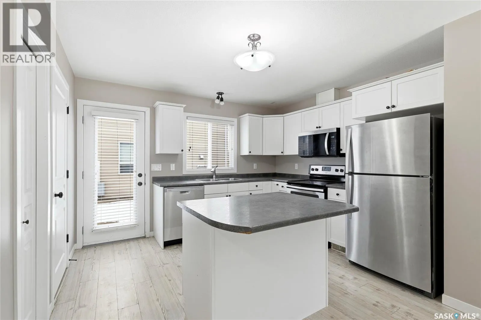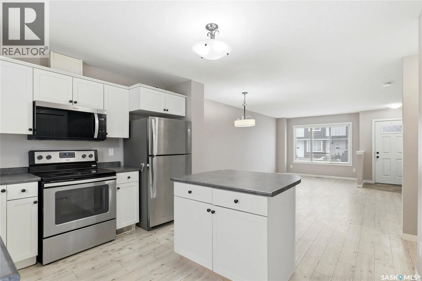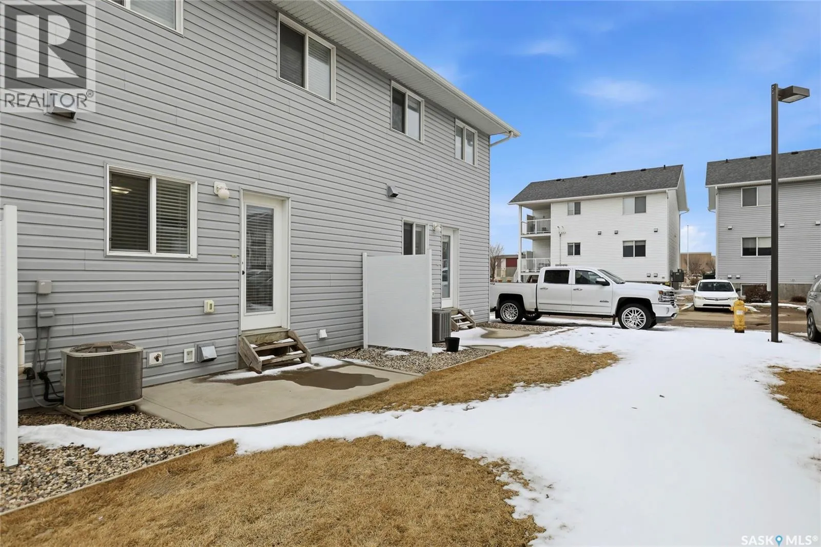Plan: 102163698 Unit: 36 Ex 0 This beautifully and tremendously townhouse condo in amazing Harbour Landing neighbourhood community is less than 9 minutes drive to Regina International Airport, quick access to Ring Road, short walking distance to green space, shopping centres, restaurants, coffee shops, clinics, and other amenities. The main level has an open flow with L-shaped kitchen fitted with stainless steel appliances, closet system pantry, plenty of cabinets, counter space with an eat-up island open to dining and a living room area with large window that illuminate natural lights. 2nd level features sizable primary bedroom with walk-in closet, two decent size bedrooms, and 4pcs bathroom complements this level. Basement level is large, spacious for storage and ready for development. Newly painted and built-in dishwasher replaced April 2026. Condo fee is $256 and include: Common Area Maintenance, External Building Maintenance, Lawncare, Snow Removal, Insurance (Common). Schedule your showings. (id:27476)