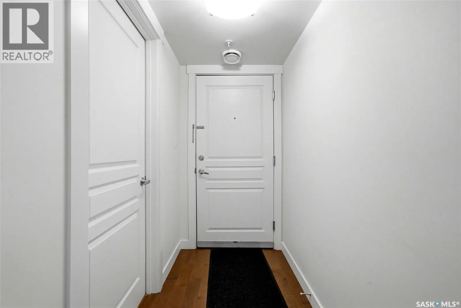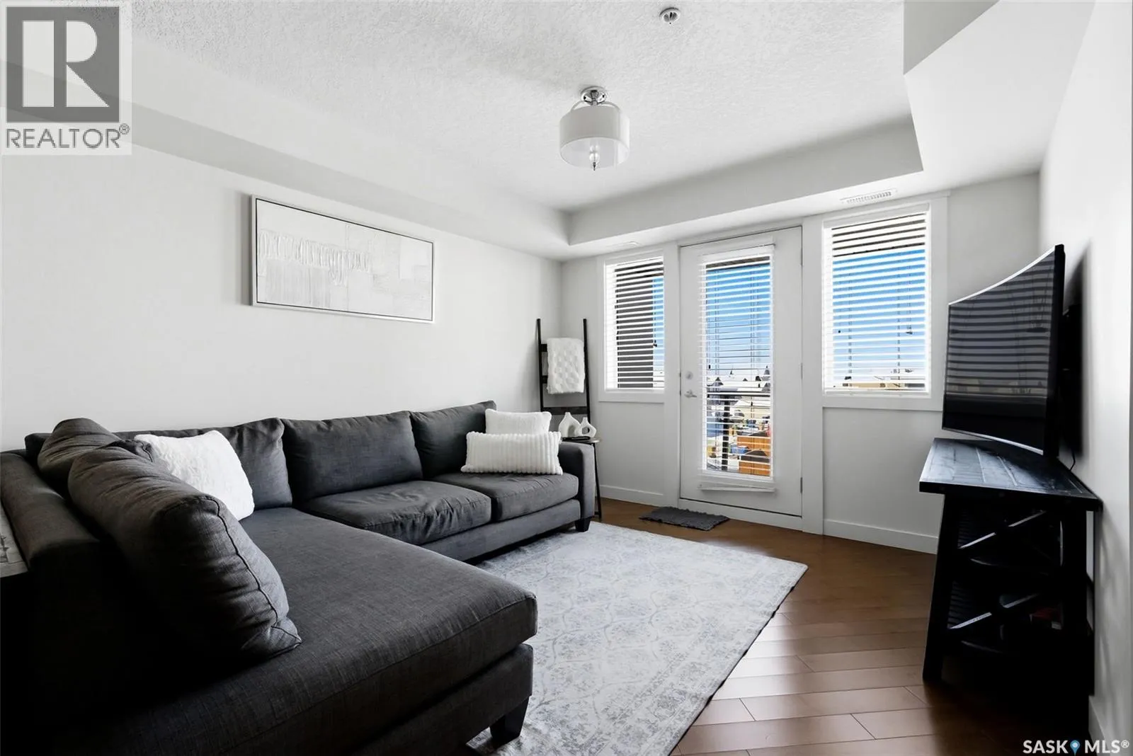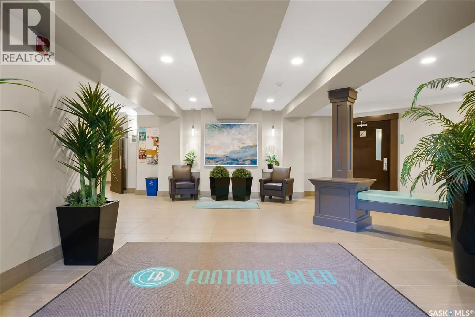 Meticulously maintained and move-in ready, this is one of the more spacious one-bedroom suites Fontaine Bleu has to offer. The open-concept layout flows seamlessly from the kitchen through the dining and living areas, all finished with beautiful hardwood flooring. Complete with high-end finishes the kitchen features maple cabinetry, stone countertops, tile backsplash, matching appliances, and a large island. The bright living room opens onto a generous west-facing balcony with a natural gas BBQ hookup, ideal for enjoying Saskatchewan summers. Down the hall, the comfortable primary bedroom offers ample closet space, complemented by an adjoining four-piece bathroom with tile floor. To top it all off, you'll enjoy the peace of mind of a heated underground parking stall, a dedicated storage locker, and condo fees that cover both heat and water. The building itself offers a fantastic range of amenities including a theatre room, gym, carwash bay, bike storage, and even a dog washing room, everything you need right at home. The perfect option for anyone seeking low-maintenance living in South Regina. (id:27476)
