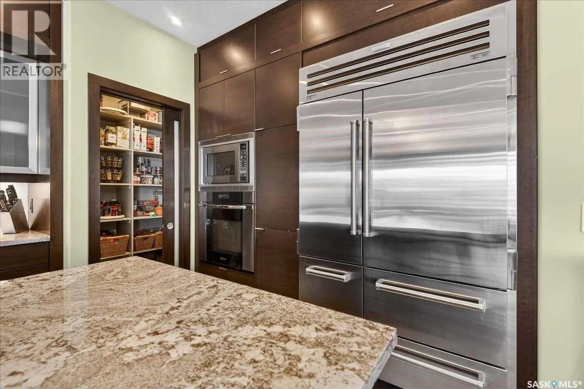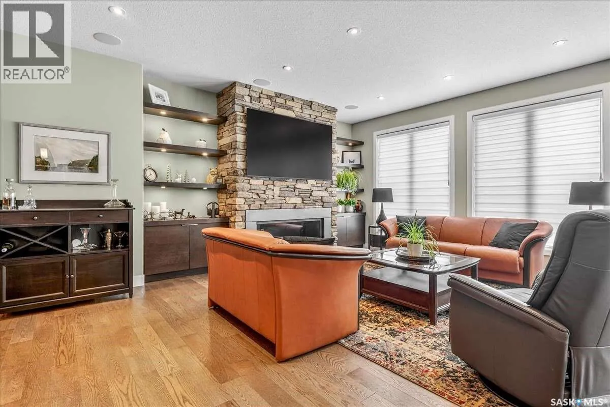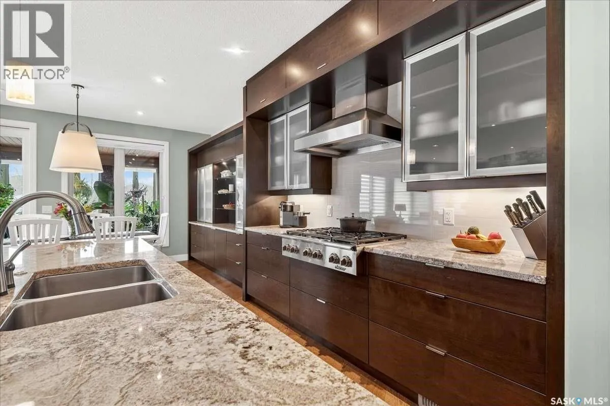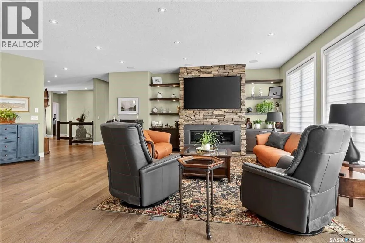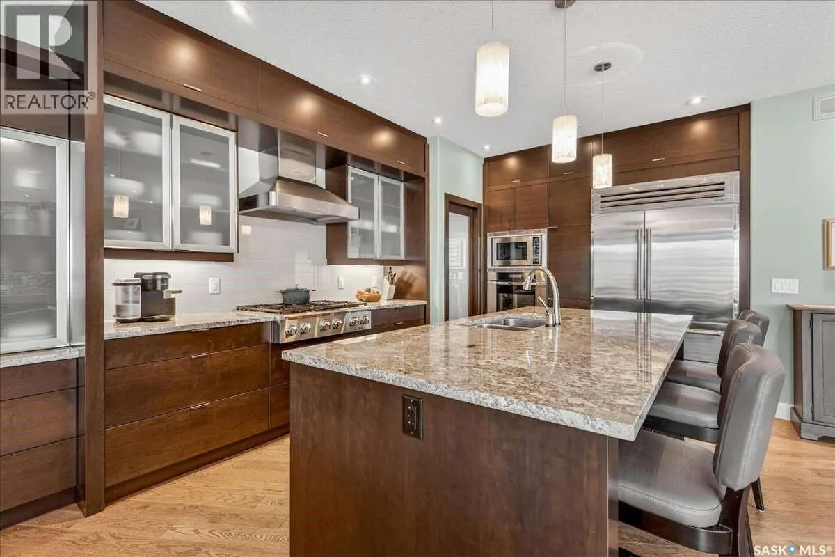 For more information, please click the "More Information" button. 4134 Timber Creek Place, Regina, Saskatchewan S4V 3G7 is a beautifully crafted custom Munro home offering 2,273 sq ft on the main floor, designed with high-end finishes throughout. The home welcomes you with 9-foot ceilings, hardwood flooring, and large windows with electric light-filtering blinds that bring in abundant natural light. The open-concept layout features a spacious living room with a stunning stone gas fireplace, built-in shelving, and cabinetry. The kitchen centers around a large island with granite countertops and includes premium appliances such as a Decro 6-burner gas stove, wall oven, microwave, Sub-Zero fridge/freezer, and a walk-in pantry. The dining area includes matching cabinetry and opens to a four-season sunroom with radiant in-floor heating, along with an adjacent screened and covered space featuring a Hot Springs hot tub. The primary bedroom is generously sized with a large closet and a luxurious ensuite featuring a soaker tub, custom tiled shower, and dual sinks. The main floor also includes an additional bedroom, bathroom, den, and a laundry room with custom cabinetry. The finished basement offers two more bedrooms, a 4-piece bathroom, and a large recreation room with a granite bar and appliances, ideal for entertaining. The mechanical room includes a Control-4 system managing heating, cooling, sound, and TV, plus a Sub-Zero freezer. The garage, basement, and sunroom all feature in-floor heating supported by a Triangle Tube boiler, Navien system, and Bryant furnace. The triple garage includes 15-foot ceilings, epoxy heated floors, and a vehicle lift. Outside features include a patio, planters, mature trees, a Generac generator, gemstone lighting, and a security system, with snow and lawn care handled by the bare-land strata. (id:27476)