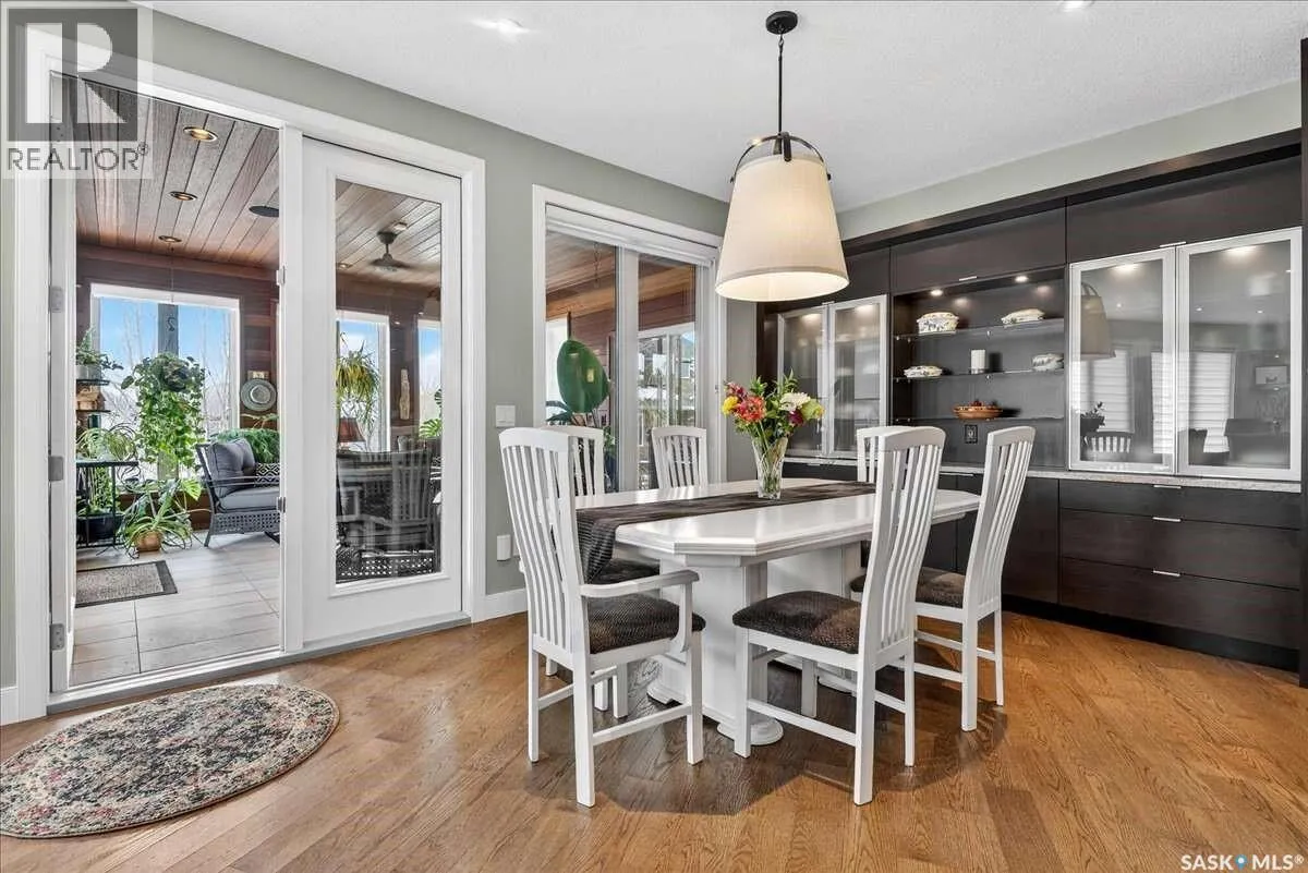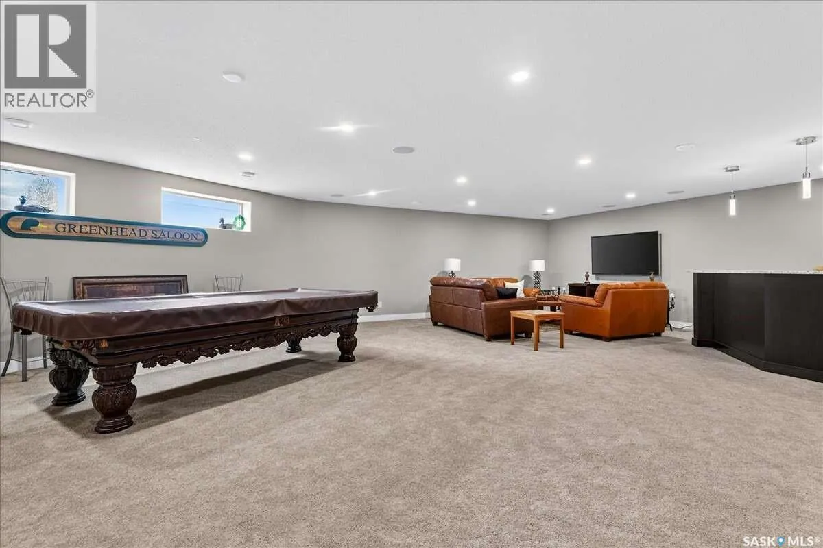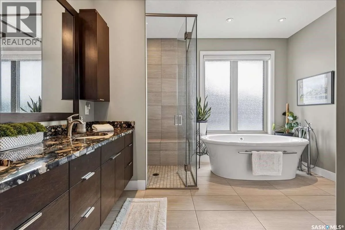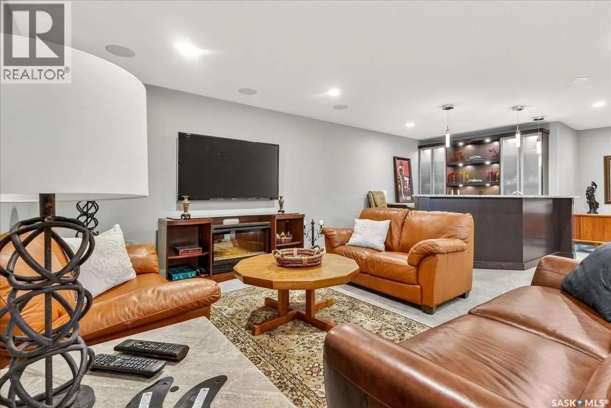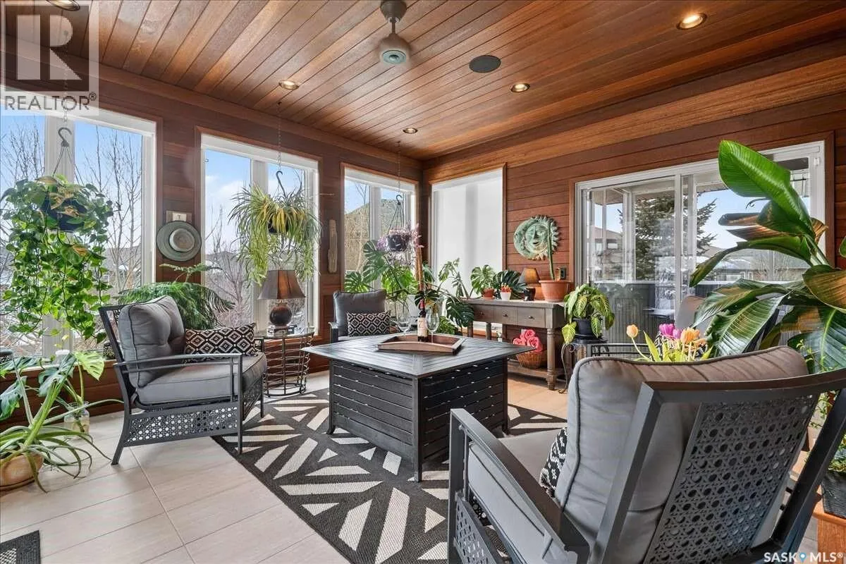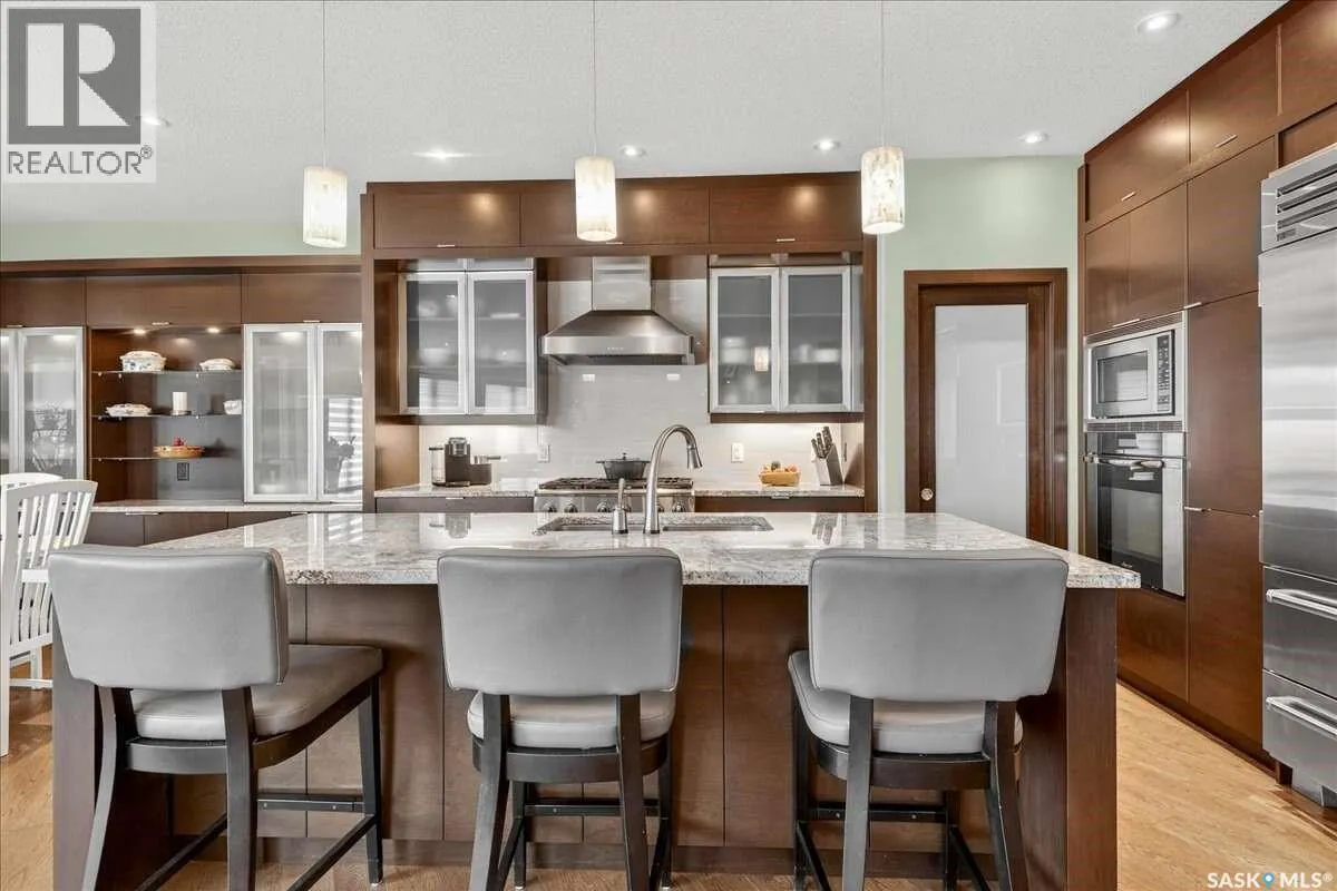 For more information, please click the "More Information" button. 4134 Timber Creek Place, Regina, Saskatchewan S4V 3G7 is a beautifully crafted custom Munro home offering 2,273 sq ft on the main floor, designed with high-end finishes throughout. The home welcomes you with 9-foot ceilings, hardwood flooring, and large windows with electric light-filtering blinds that bring in abundant natural light. The open-concept layout features a spacious living room with a stunning stone gas fireplace, built-in shelving, and cabinetry. The kitchen centers around a large island with granite countertops and includes premium appliances such as a Decro 6-burner gas stove, wall oven, microwave, Sub-Zero fridge/freezer, and a walk-in pantry. The dining area includes matching cabinetry and opens to a four-season sunroom with radiant in-floor heating, along with an adjacent screened and covered space featuring a Hot Springs hot tub. The primary bedroom is generously sized with a large closet and a luxurious ensuite featuring a soaker tub, custom tiled shower, and dual sinks. The main floor also includes an additional bedroom, bathroom, den, and a laundry room with custom cabinetry. The finished basement offers two more bedrooms, a 4-piece bathroom, and a large recreation room with a granite bar and appliances, ideal for entertaining. The mechanical room includes a Control-4 system managing heating, cooling, sound, and TV, plus a Sub-Zero freezer. The garage, basement, and sunroom all feature in-floor heating supported by a Triangle Tube boiler, Navien system, and Bryant furnace. The triple garage includes 15-foot ceilings, epoxy heated floors, and a vehicle lift. Outside features include a patio, planters, mature trees, a Generac generator, gemstone lighting, and a security system, with snow and lawn care handled by the bare-land strata. (id:27476)