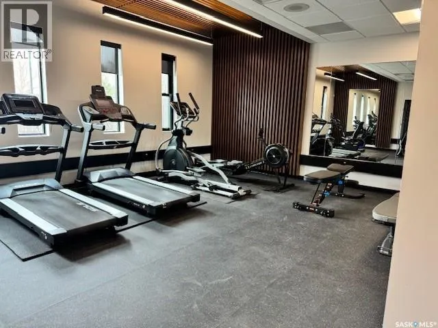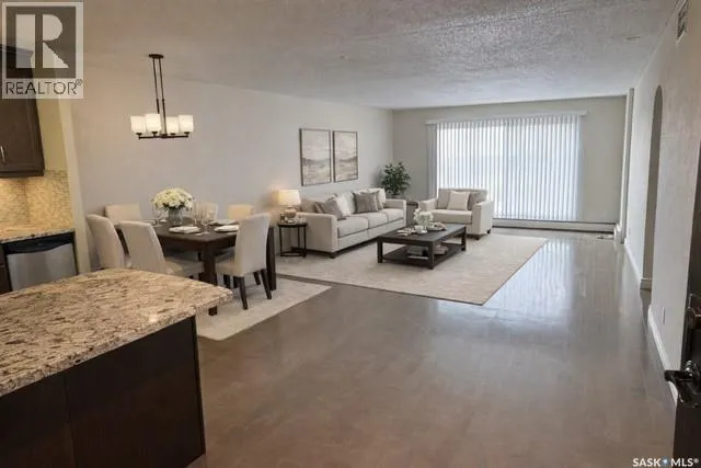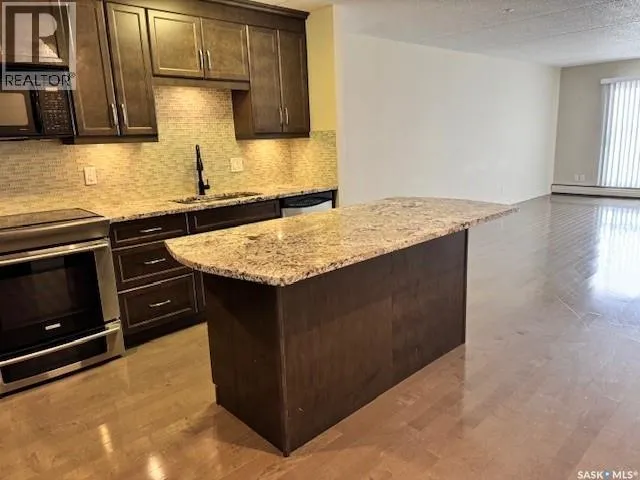 Welcome to this beautifully upgraded 2 bedroom, 2 bathroom condo located in the well-established community of Roberts Plaza. This inviting unit features a bright and open floor plan, highlighted by rich espresso cabinetry in the kitchen with granite countertops throughout, and a functional sit up island- perfect for casual dining or entertaining. The modern kitchen is complete with stainless steel appliances, offering both style and practicality. The space flows into the dining area and a spacious living room. Patio doors lead to a private balcony where you can enjoy impressive city views. Both bathrooms have been tastefully updated with granite countertops that add a touch of luxury to the home. Additional features include 1 underground parking stall for added convenience and security. Residents of Roberts Plaza also enjoy access to a variety of desireable building amenities, including indoor swimming pool, sauna, newer gym, amenities room, and more, making this an ideal place to call home. Condo Fees include: Common Insurance, Common area maint., Ext. Building maint., garbage, lawn care, snow removal, reserve fund, sewer, HEAT, POWER, WATER, and all amenities. Some photos are virtually staged. (id:27476)