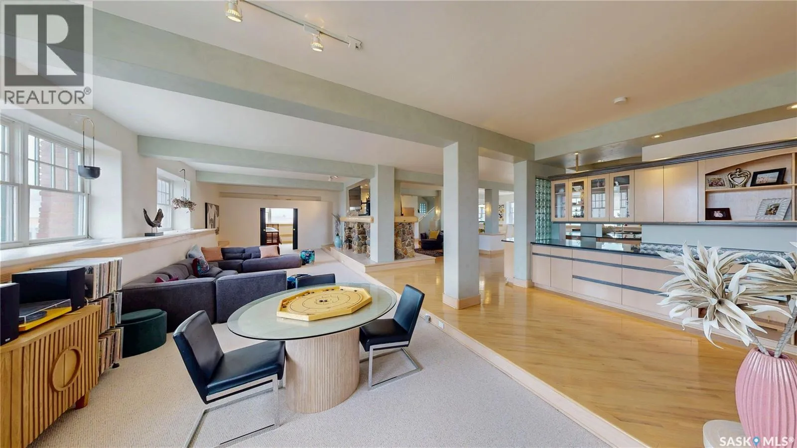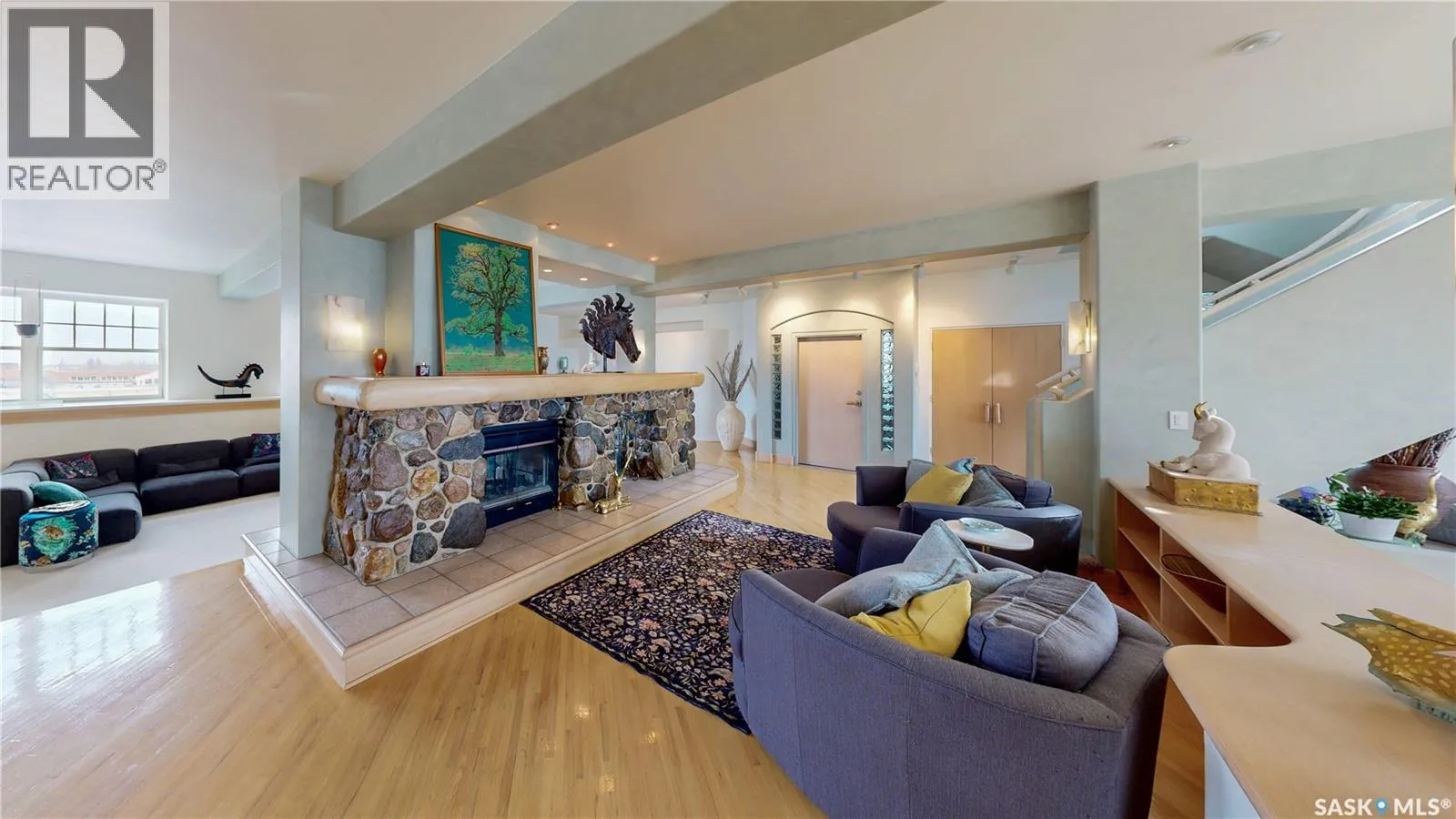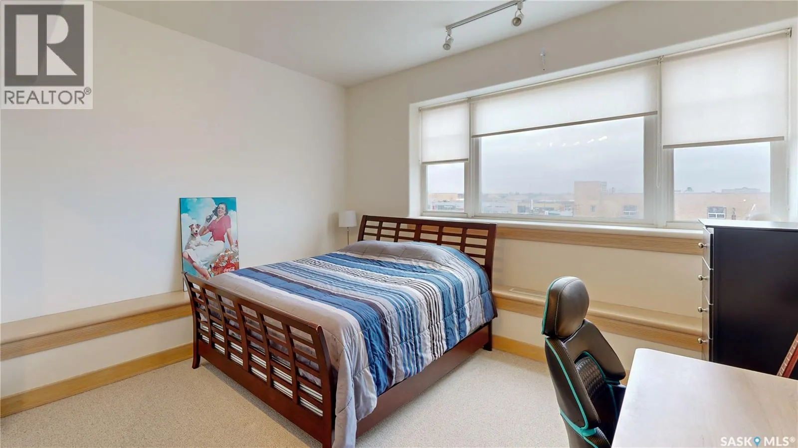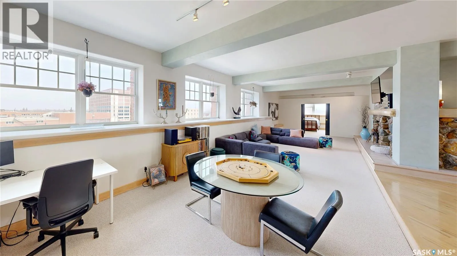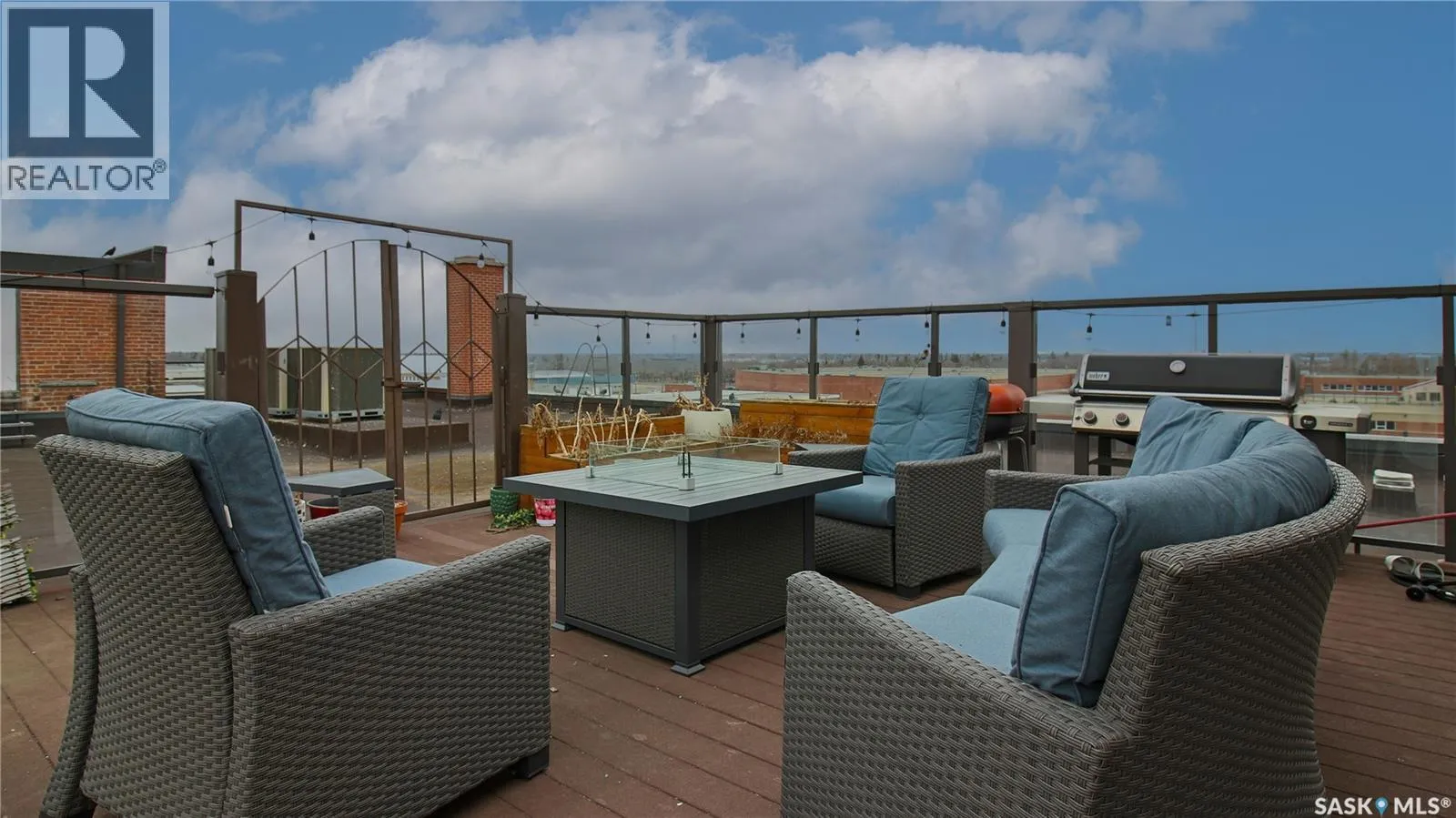 Welcome to Unit 400, the penthouse suite at 1150 Rose Street located in the vibrant Warehouse district. This 1913 built, 4917 square foot, apartment style warehouse condo has 5 bedrooms, 2 bathrooms and the grounds are completely gated. One of the most exceptional and rare highlights of this unit is the abundance of private parking spaces! There are 4 parking spots in the 56âx30â quadruple, detached, heated garage, 6 on the parking pad in front of the garage and 2 more on the side of the building! Upon entering this suite, you are welcomed into the foyer that opens into the family room with bright windows, a stone-surround wood burning fireplace and hardwood floors. The kitchen has a massive island with bar seating and the stainless steel fridge, stove, dishwasher, and garburator are all included. The open concept flows into the adjacent dining area. To the side is a versatile bedroom that also makes a wonderful office. On the opposite side of the stone fireplace, youâll find an expansive living room, offering a perfect balance of comfort and style. This area is complimented by a bedroom on one end and a cozy den on the other. The luxurious primary bedroom is spacious with a 5 piece en-suite bathroom featuring a huge bathtub, double vanity, glass shower and walk-in closet! Following that are two more bedrooms and the main 4 piece bathroom. Finishing off this level is the laundry room with tile flooring, plenty of extra storage space, a convenient wash sink, and a folding table. There is also access to the freight elevator. On the second level is a fabulous bonus room with wrap around windows, a wet bar with tile backsplash and access to your very own private rooftop deck! The ultimate spot to soak up the sun during the day and gather around the fire table with family and friends in the evening. Additional features include central air, the owned forced air boiler, gas water heater, water softener, RO system and both elevator and stair access. As per the Sellerâs direction, all offers will be presented on 04/20/2026 6:00PM. (id:27476)