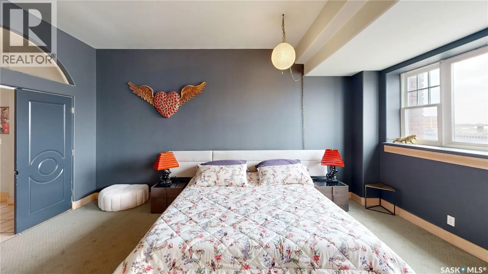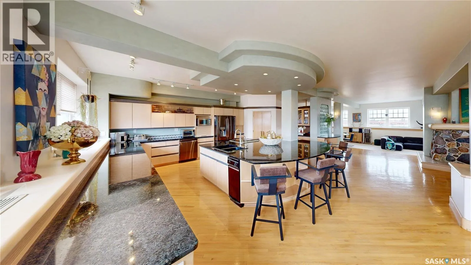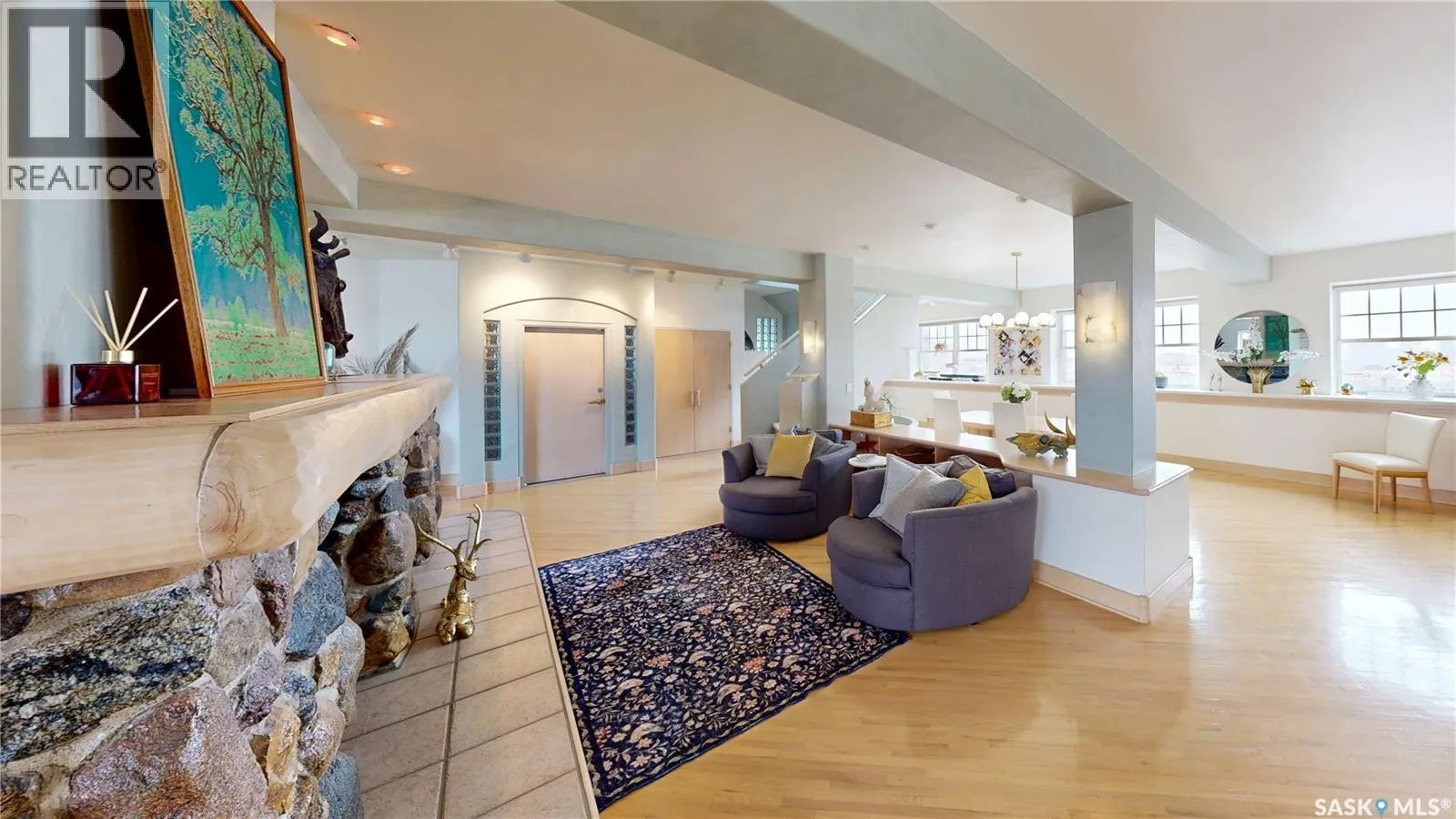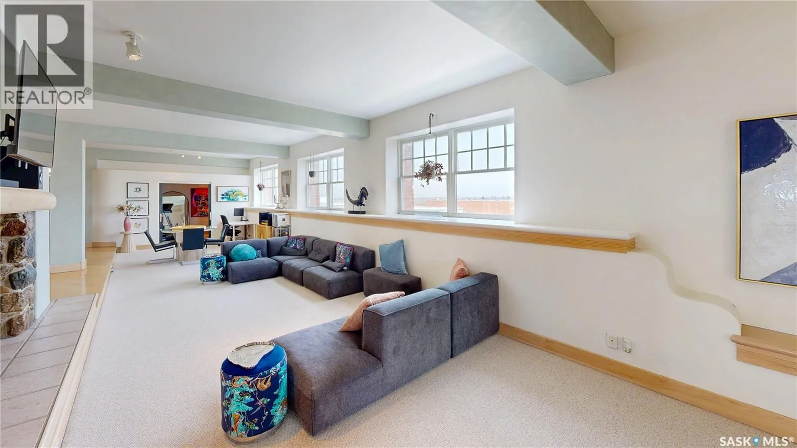 Welcome to Unit 400, the penthouse suite at 1150 Rose Street located in the vibrant Warehouse district. This 1913 built, 4917 square foot, apartment style warehouse condo has 5 bedrooms, 2 bathrooms and the grounds are completely gated. One of the most exceptional and rare highlights of this unit is the abundance of private parking spaces! There are 4 parking spots in the 56âx30â quadruple, detached, heated garage, 6 on the parking pad in front of the garage and 2 more on the side of the building! Upon entering this suite, you are welcomed into the foyer that opens into the family room with bright windows, a stone-surround wood burning fireplace and hardwood floors. The kitchen has a massive island with bar seating and the stainless steel fridge, stove, dishwasher, and garburator are all included. The open concept flows into the adjacent dining area. To the side is a versatile bedroom that also makes a wonderful office. On the opposite side of the stone fireplace, youâll find an expansive living room, offering a perfect balance of comfort and style. This area is complimented by a bedroom on one end and a cozy den on the other. The luxurious primary bedroom is spacious with a 5 piece en-suite bathroom featuring a huge bathtub, double vanity, glass shower and walk-in closet! Following that are two more bedrooms and the main 4 piece bathroom. Finishing off this level is the laundry room with tile flooring, plenty of extra storage space, a convenient wash sink, and a folding table. There is also access to the freight elevator. On the second level is a fabulous bonus room with wrap around windows, a wet bar with tile backsplash and access to your very own private rooftop deck! The ultimate spot to soak up the sun during the day and gather around the fire table with family and friends in the evening. Additional features include central air, the owned forced air boiler, gas water heater, water softener, RO system and both elevator and stair access. As per the Sellerâs direction, all offers will be presented on 04/20/2026 6:00PM. (id:27476)