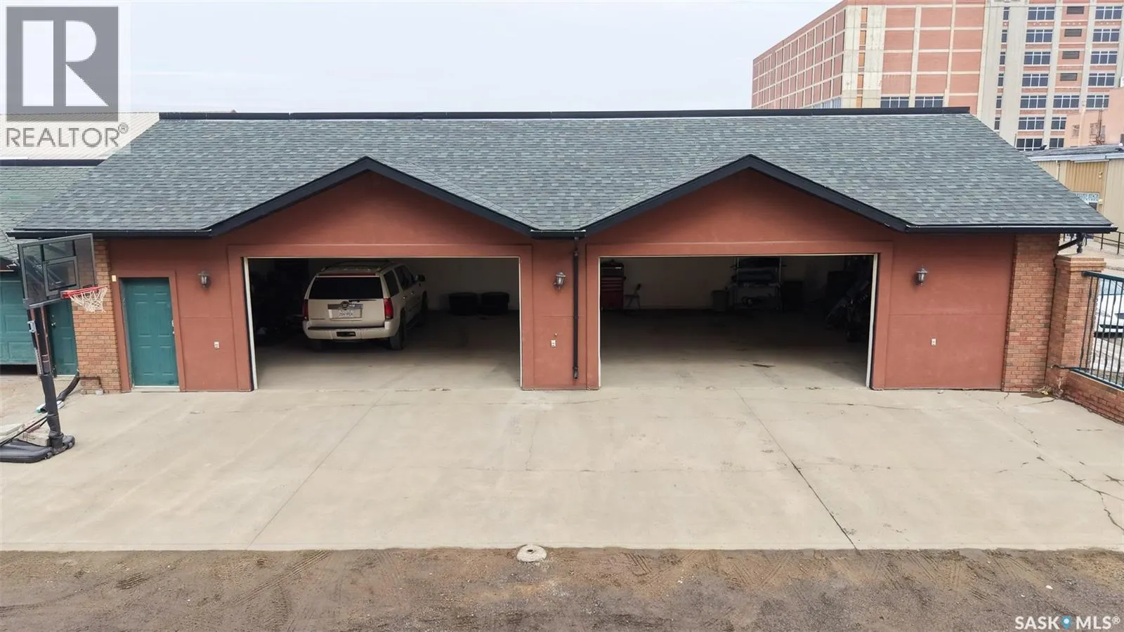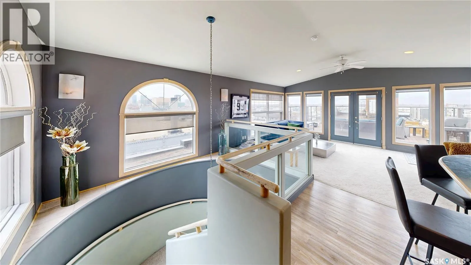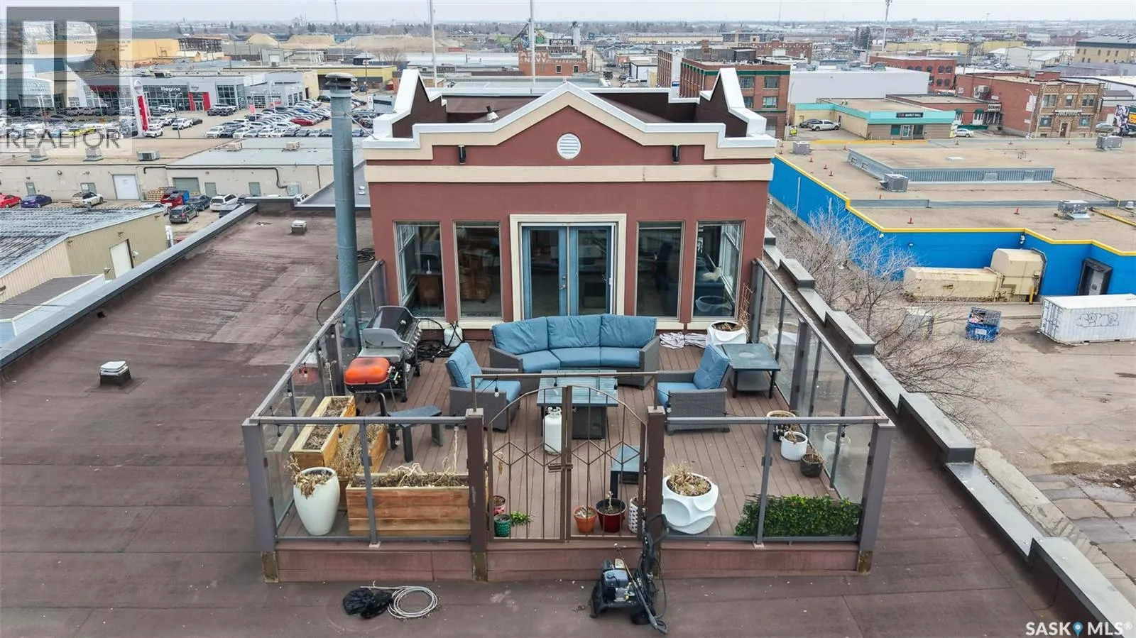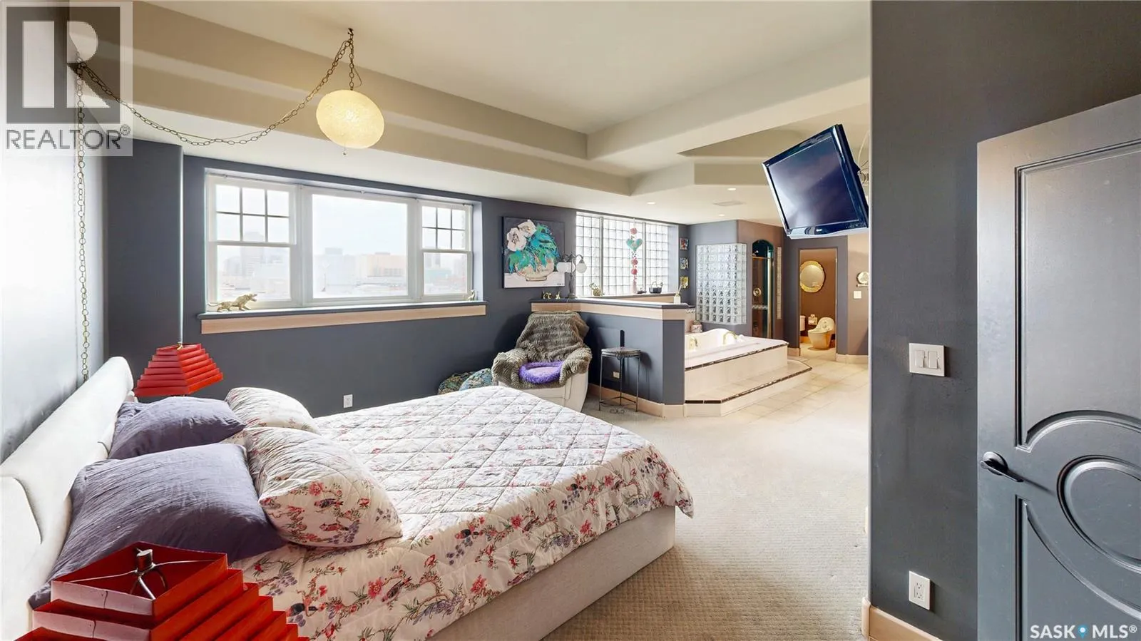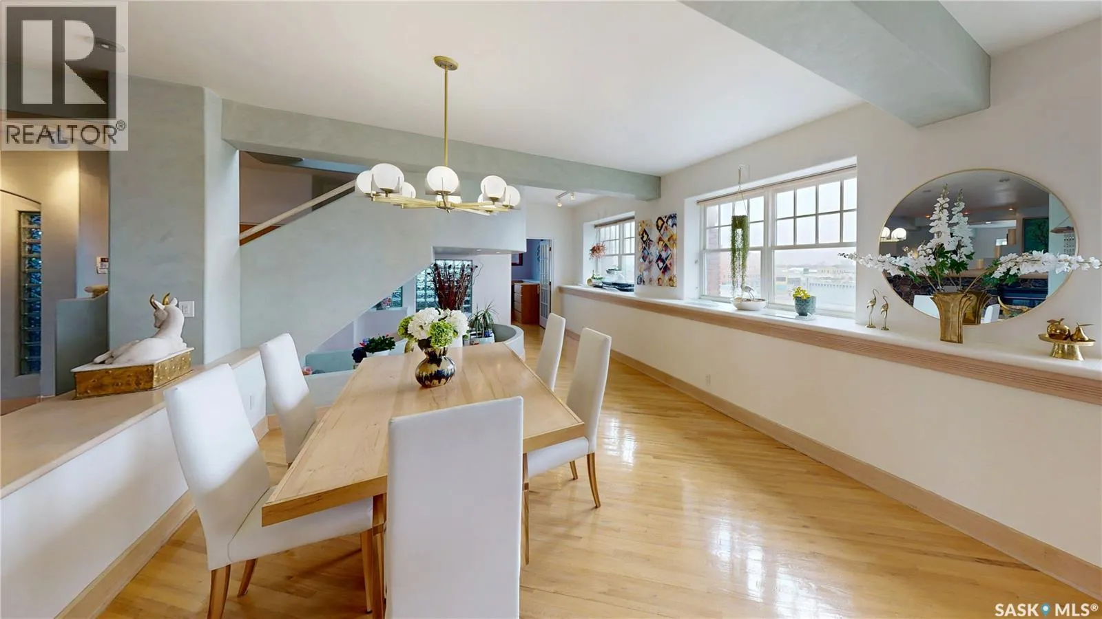 Welcome to Unit 400, the penthouse suite at 1150 Rose Street located in the vibrant Warehouse district. This 1913 built, 4917 square foot, apartment style warehouse condo has 5 bedrooms, 2 bathrooms and the grounds are completely gated. One of the most exceptional and rare highlights of this unit is the abundance of private parking spaces! There are 4 parking spots in the 56âx30â quadruple, detached, heated garage, 6 on the parking pad in front of the garage and 2 more on the side of the building! Upon entering this suite, you are welcomed into the foyer that opens into the family room with bright windows, a stone-surround wood burning fireplace and hardwood floors. The kitchen has a massive island with bar seating and the stainless steel fridge, stove, dishwasher, and garburator are all included. The open concept flows into the adjacent dining area. To the side is a versatile bedroom that also makes a wonderful office. On the opposite side of the stone fireplace, youâll find an expansive living room, offering a perfect balance of comfort and style. This area is complimented by a bedroom on one end and a cozy den on the other. The luxurious primary bedroom is spacious with a 5 piece en-suite bathroom featuring a huge bathtub, double vanity, glass shower and walk-in closet! Following that are two more bedrooms and the main 4 piece bathroom. Finishing off this level is the laundry room with tile flooring, plenty of extra storage space, a convenient wash sink, and a folding table. There is also access to the freight elevator. On the second level is a fabulous bonus room with wrap around windows, a wet bar with tile backsplash and access to your very own private rooftop deck! The ultimate spot to soak up the sun during the day and gather around the fire table with family and friends in the evening. Additional features include central air, the owned forced air boiler, gas water heater, water softener, RO system and both elevator and stair access. As per the Sellerâs direction, all offers will be presented on 04/20/2026 6:00PM. (id:27476)