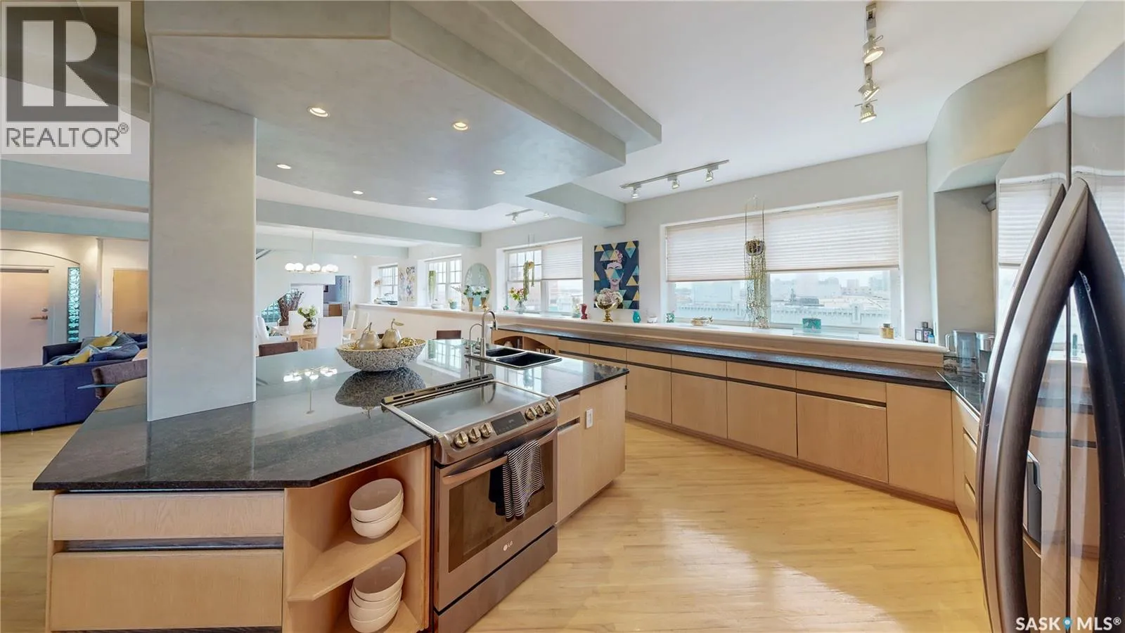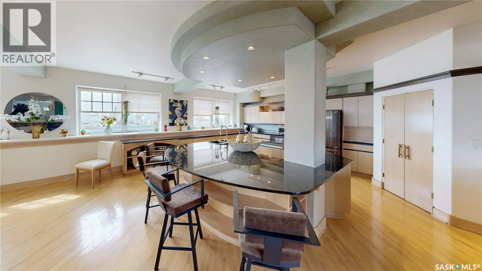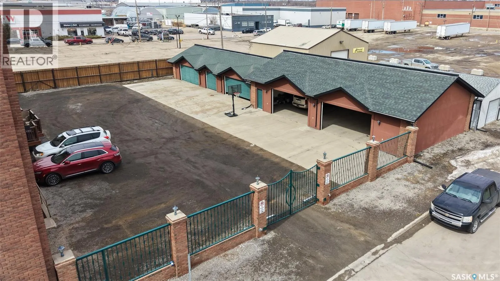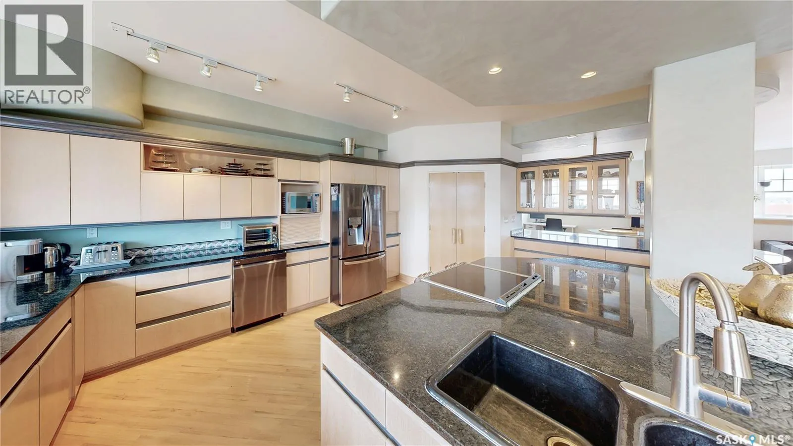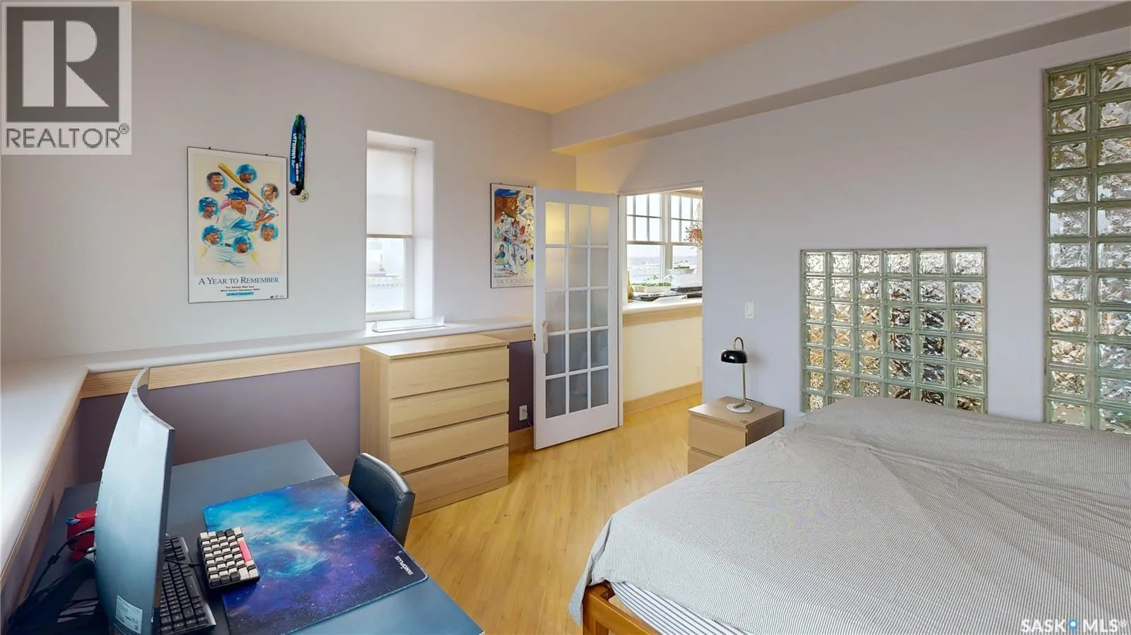 Welcome to Unit 400, the penthouse suite at 1150 Rose Street located in the vibrant Warehouse district. This 1913 built, 4917 square foot, apartment style warehouse condo has 5 bedrooms, 2 bathrooms and the grounds are completely gated. One of the most exceptional and rare highlights of this unit is the abundance of private parking spaces! There are 4 parking spots in the 56âx30â quadruple, detached, heated garage, 6 on the parking pad in front of the garage and 2 more on the side of the building! Upon entering this suite, you are welcomed into the foyer that opens into the family room with bright windows, a stone-surround wood burning fireplace and hardwood floors. The kitchen has a massive island with bar seating and the stainless steel fridge, stove, dishwasher, and garburator are all included. The open concept flows into the adjacent dining area. To the side is a versatile bedroom that also makes a wonderful office. On the opposite side of the stone fireplace, youâll find an expansive living room, offering a perfect balance of comfort and style. This area is complimented by a bedroom on one end and a cozy den on the other. The luxurious primary bedroom is spacious with a 5 piece en-suite bathroom featuring a huge bathtub, double vanity, glass shower and walk-in closet! Following that are two more bedrooms and the main 4 piece bathroom. Finishing off this level is the laundry room with tile flooring, plenty of extra storage space, a convenient wash sink, and a folding table. There is also access to the freight elevator. On the second level is a fabulous bonus room with wrap around windows, a wet bar with tile backsplash and access to your very own private rooftop deck! The ultimate spot to soak up the sun during the day and gather around the fire table with family and friends in the evening. Additional features include central air, the owned forced air boiler, gas water heater, water softener, RO system and both elevator and stair access. As per the Sellerâs direction, all offers will be presented on 04/20/2026 6:00PM. (id:27476)