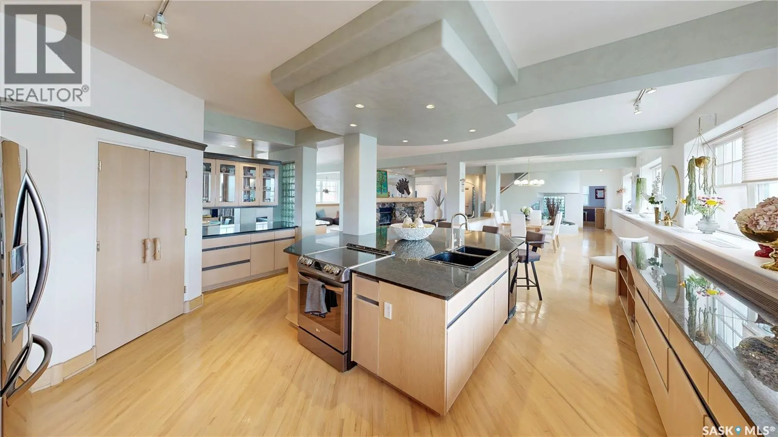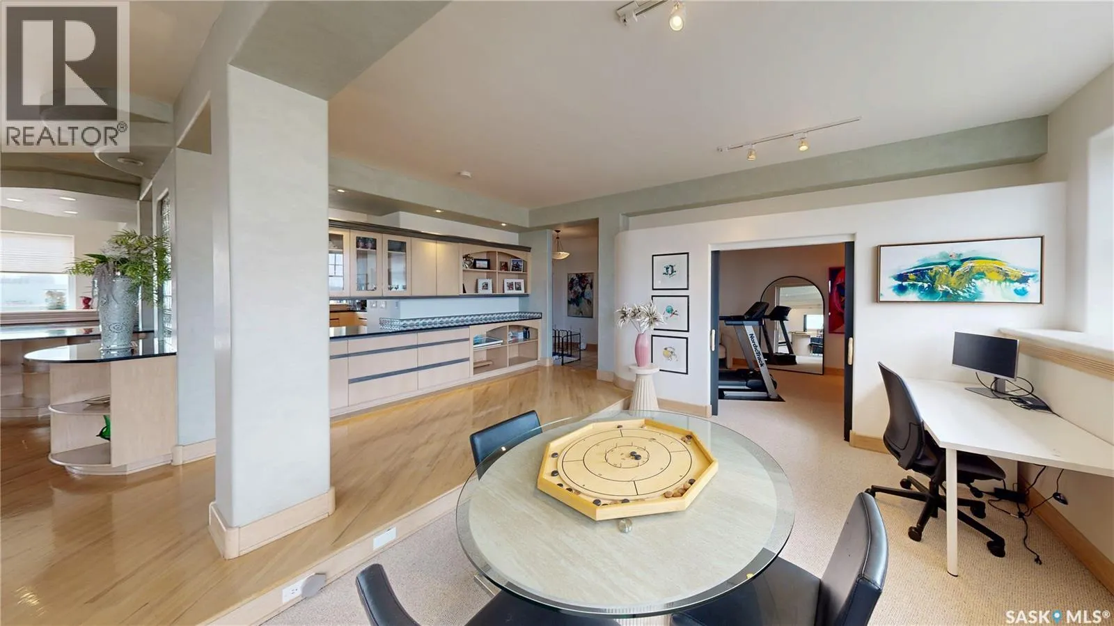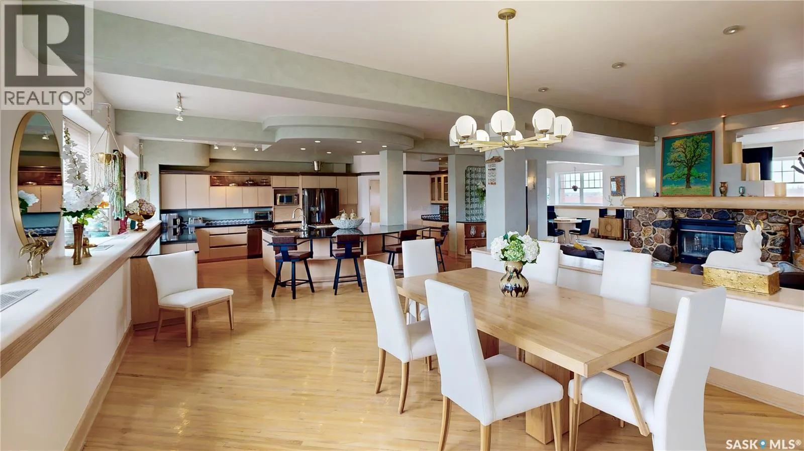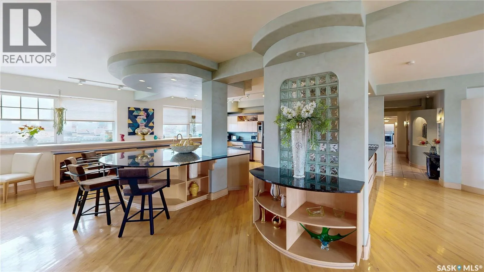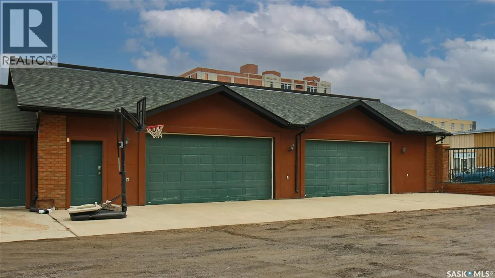 Welcome to Unit 400, the penthouse suite at 1150 Rose Street located in the vibrant Warehouse district. This 1913 built, 4917 square foot, apartment style warehouse condo has 5 bedrooms, 2 bathrooms and the grounds are completely gated. One of the most exceptional and rare highlights of this unit is the abundance of private parking spaces! There are 4 parking spots in the 56âx30â quadruple, detached, heated garage, 6 on the parking pad in front of the garage and 2 more on the side of the building! Upon entering this suite, you are welcomed into the foyer that opens into the family room with bright windows, a stone-surround wood burning fireplace and hardwood floors. The kitchen has a massive island with bar seating and the stainless steel fridge, stove, dishwasher, and garburator are all included. The open concept flows into the adjacent dining area. To the side is a versatile bedroom that also makes a wonderful office. On the opposite side of the stone fireplace, youâll find an expansive living room, offering a perfect balance of comfort and style. This area is complimented by a bedroom on one end and a cozy den on the other. The luxurious primary bedroom is spacious with a 5 piece en-suite bathroom featuring a huge bathtub, double vanity, glass shower and walk-in closet! Following that are two more bedrooms and the main 4 piece bathroom. Finishing off this level is the laundry room with tile flooring, plenty of extra storage space, a convenient wash sink, and a folding table. There is also access to the freight elevator. On the second level is a fabulous bonus room with wrap around windows, a wet bar with tile backsplash and access to your very own private rooftop deck! The ultimate spot to soak up the sun during the day and gather around the fire table with family and friends in the evening. Additional features include central air, the owned forced air boiler, gas water heater, water softener, RO system and both elevator and stair access. As per the Sellerâs direction, all offers will be presented on 04/20/2026 6:00PM. (id:27476)