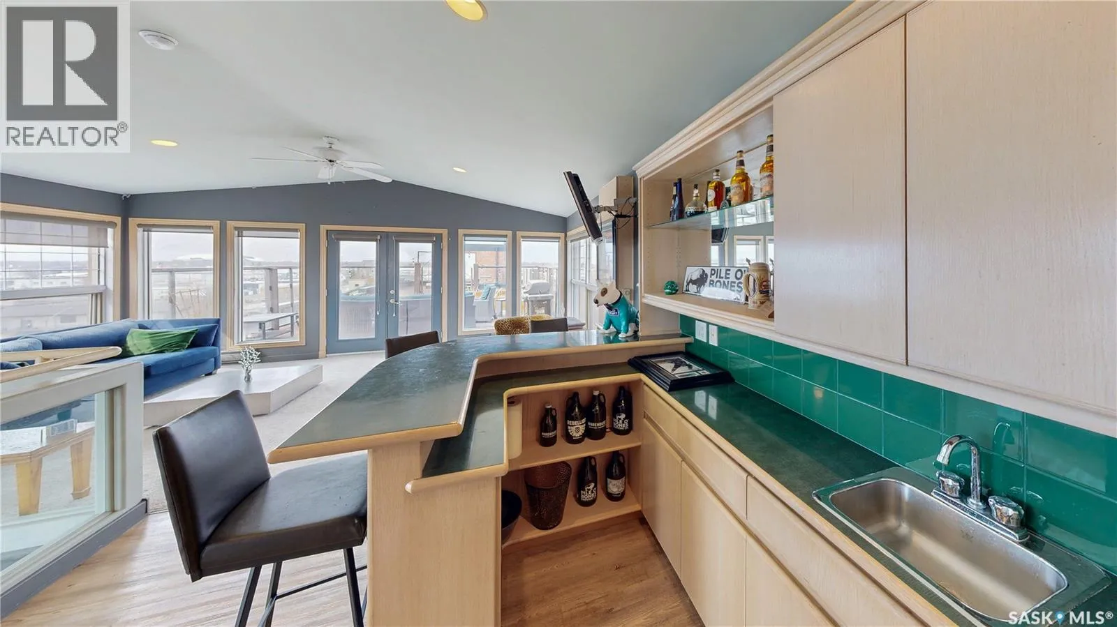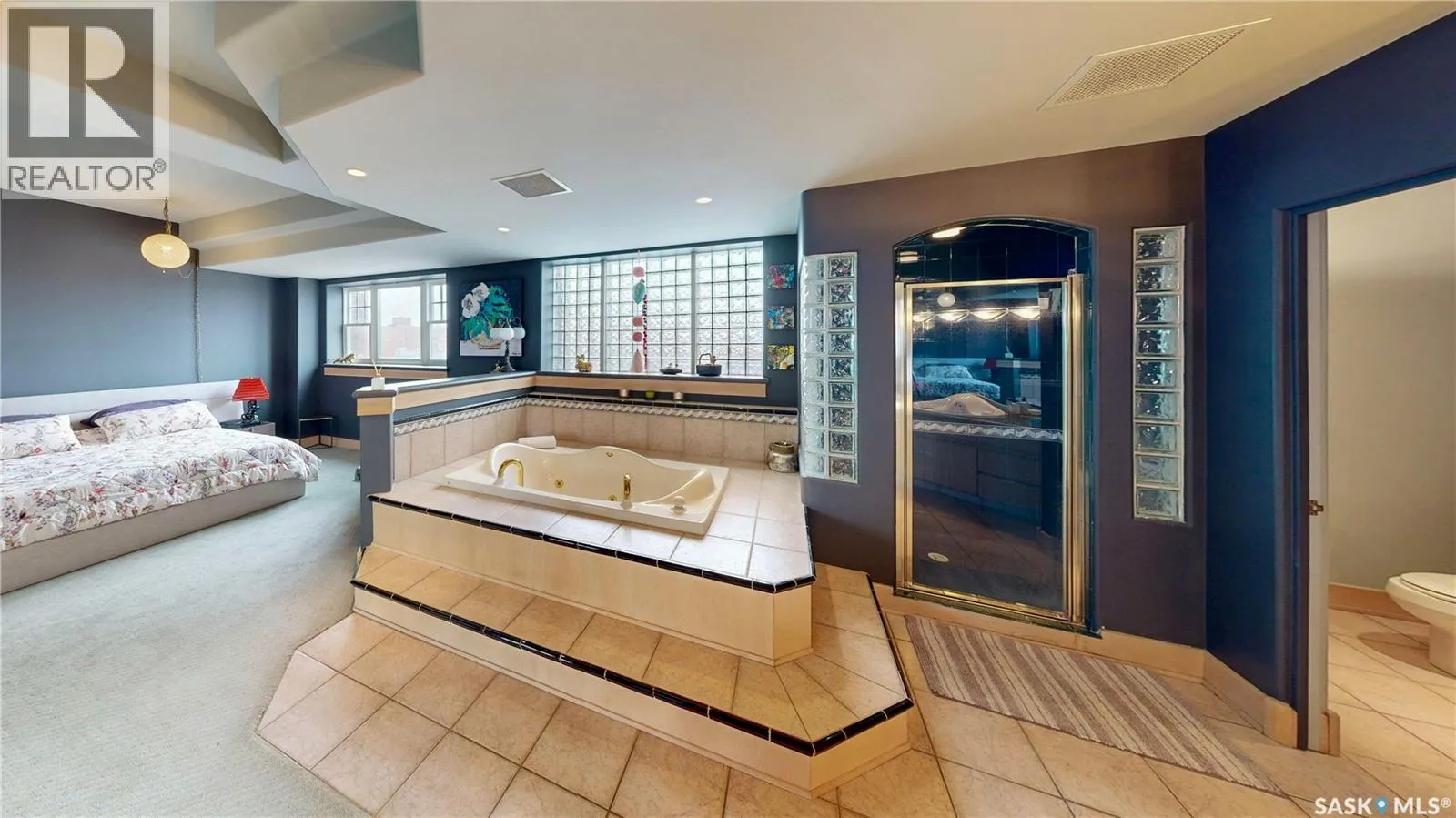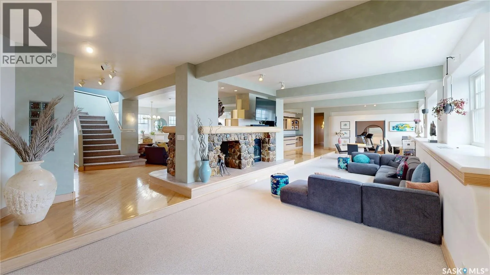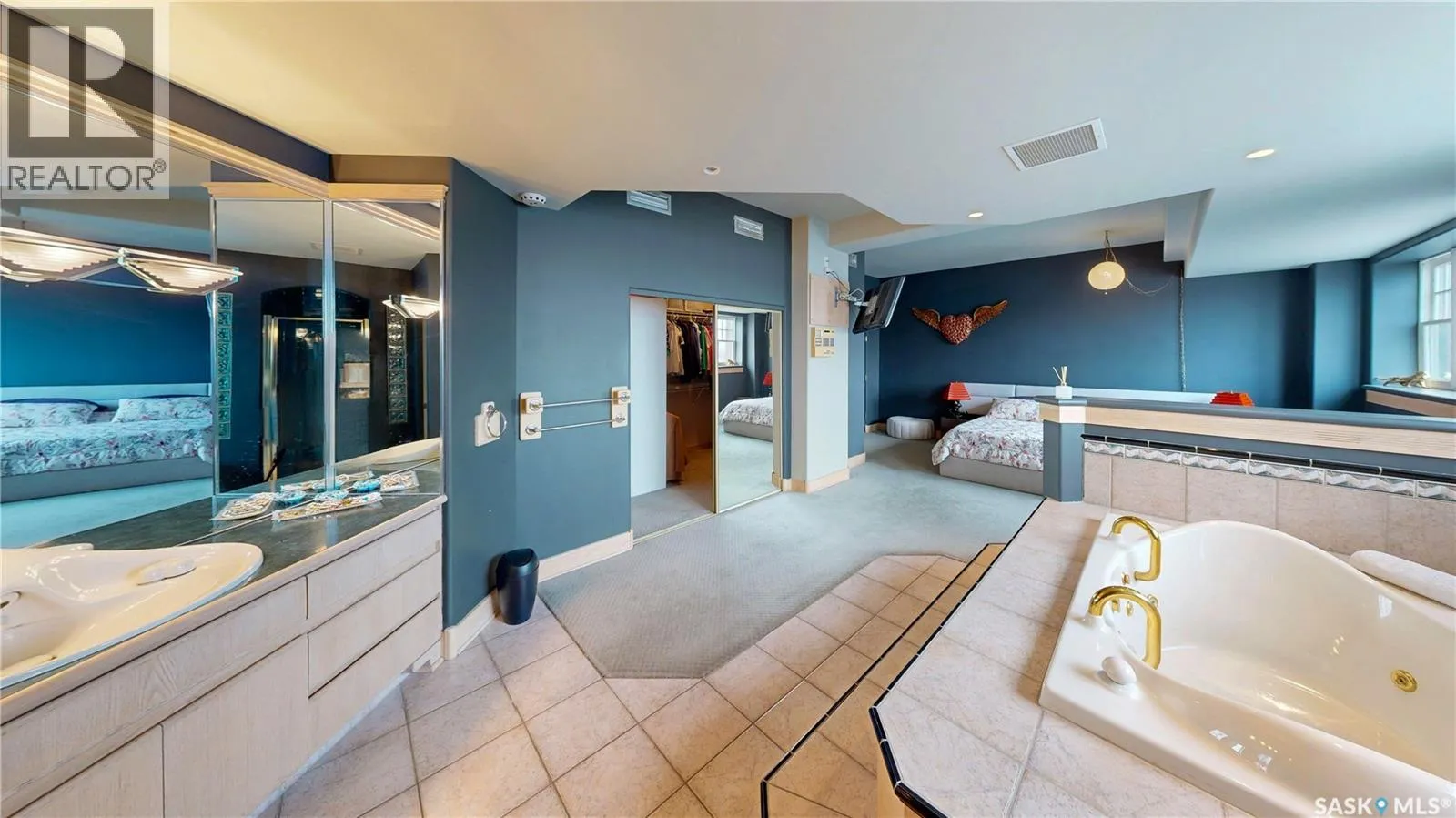 Welcome to Unit 400, the penthouse suite at 1150 Rose Street located in the vibrant Warehouse district. This 1913 built, 4917 square foot, apartment style warehouse condo has 5 bedrooms, 2 bathrooms and the grounds are completely gated. One of the most exceptional and rare highlights of this unit is the abundance of private parking spaces! There are 4 parking spots in the 56âx30â quadruple, detached, heated garage, 6 on the parking pad in front of the garage and 2 more on the side of the building! Upon entering this suite, you are welcomed into the foyer that opens into the family room with bright windows, a stone-surround wood burning fireplace and hardwood floors. The kitchen has a massive island with bar seating and the stainless steel fridge, stove, dishwasher, and garburator are all included. The open concept flows into the adjacent dining area. To the side is a versatile bedroom that also makes a wonderful office. On the opposite side of the stone fireplace, youâll find an expansive living room, offering a perfect balance of comfort and style. This area is complimented by a bedroom on one end and a cozy den on the other. The luxurious primary bedroom is spacious with a 5 piece en-suite bathroom featuring a huge bathtub, double vanity, glass shower and walk-in closet! Following that are two more bedrooms and the main 4 piece bathroom. Finishing off this level is the laundry room with tile flooring, plenty of extra storage space, a convenient wash sink, and a folding table. There is also access to the freight elevator. On the second level is a fabulous bonus room with wrap around windows, a wet bar with tile backsplash and access to your very own private rooftop deck! The ultimate spot to soak up the sun during the day and gather around the fire table with family and friends in the evening. Additional features include central air, the owned forced air boiler, gas water heater, water softener, RO system and both elevator and stair access. As per the Sellerâs direction, all offers will be presented on 04/20/2026 6:00PM. (id:27476)