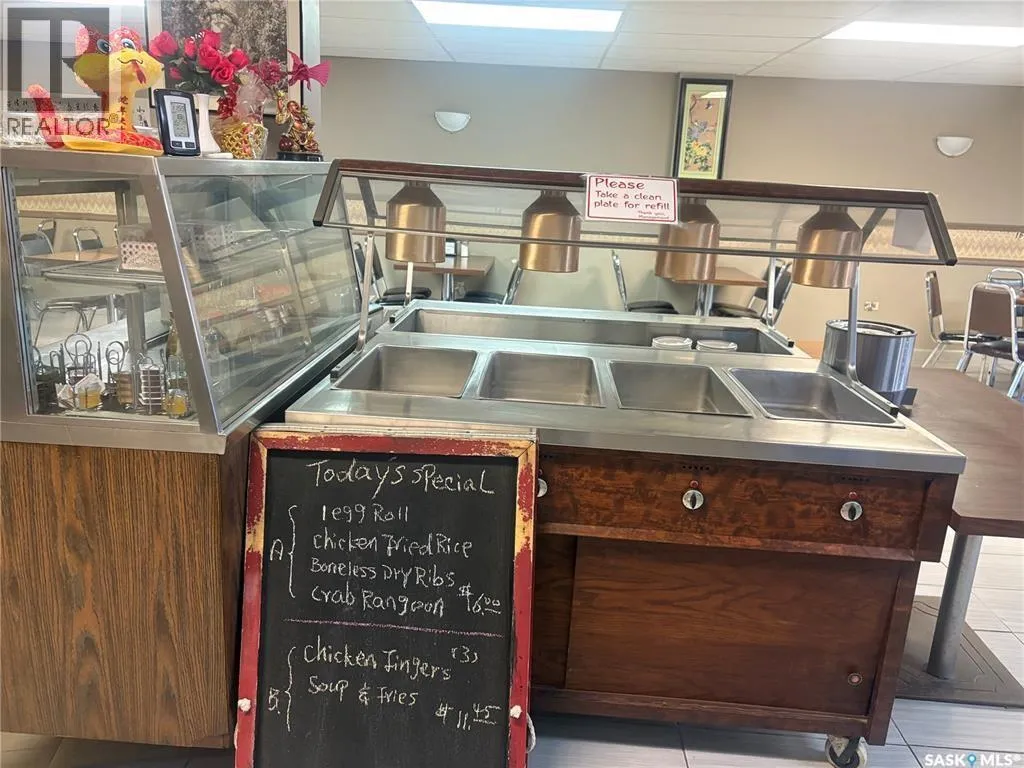 Long term family-owned restaurant for sale in Rosetown. 80 Seats offering Chinese food and western cuisine. Front parking and employee parking at the back. All equipment and machinery, fixtures and restaurant equipment are included except dishwasher (dishwasher is rented). Second floor has owner/employee living area with 5 bedrooms, 2 living rooms and 2 full bathrooms. Updated included A/C, hot water tank, shingle repairing, furnace upstairs and restaurant flooring. (id:27476)