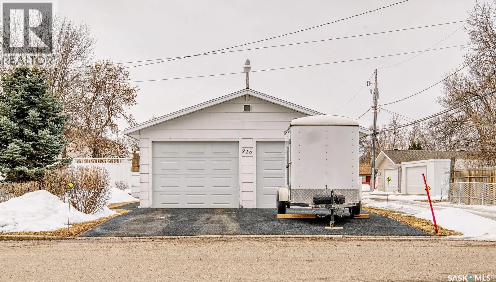 A BEAUTIFUL BUNGALOW WITH A DOUBLE DETACHED GARAGE AND PEACEFUL BACKYARD RETREAT! Perfectly positioned on a corner lot and elegantly elevated - 715 King Street is a home that truly embraces the beauty of the outdoors showcased in its exquisite backyard! Boasting of more than 1,000 sq. ft., mature trees frame the front door where you are ushered inside and are greeted by a living room that is sun kissed, spacious and serene! With a flawless flow, the sleeping quarters are thoughtfully set to one side of the home. Where, youâll find two nice-sized bedrooms - one that is bright and shimmering with sun light, the other has soft filtered light creating a cozy atmosphere. Just steps away, a 4-piece bathroom adds everyday convenience, complete with a deep tub to decompress. Then be gently guided to your wide open kitchen tailored and tweaked to be practical and purposeful with smart drawer storage, plenty of cabinetry, and a dining area integrated within. Main floor laundry adds to the comfort of single level living then the basement provides even more room to stretch out in! Full of personality - thereâs a family room and two whimsical children's' bedrooms with custom-made built-ins that were crafted with care! A fifth and final bedroom offers a tranquil haven for overnight guests, complemented by a stylish boutique bathroom on the lower level. Last up, a charming mudroom delivers even more storage before you step outside into your wow-worthy picturesque paradise! Sink into your hot tub and feel the stress of the day melt away as the soothing water washes over you! Private, silent and paired with an awning to block any wind - this home seamlessly dissolves the boundaries between indoors and out! Refined with a durable rubberized surface, the deck leads you to your perennials, a shed, workshop and double detached garage to tinker away in! Greenspace, towering trees and a manicured hedge add to your Zen oasis! So come take a look - this one is calling your name! (id:27476)