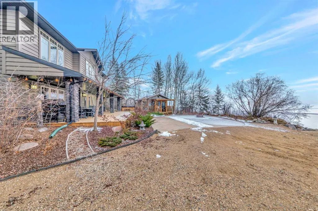 Luxury and lifestyle come together on one of Sandy Beachâs most expansive sandy shorelines. This executive waterfront home offers over 3,500 sq. ft. of premium living space, is perfectly positioned for full four-season enjoyment, and provides direct lake access, endless summer water activities, winter recreation, golfing, camping, clubhouse amenities, and more.The property is beautifully developed front to back, featuring a dry-rock landscape design, a double detached garage, additional sheds for wood and storage, and a private guest house for family and friends. Relax around the lakeside fire pit or take in panoramic waterfront views from the covered deck, your own year-round retreat.Inside, the craftsmanship stands out. Hardwood and tile flooring span the home, complemented by solid maple trim, doors, and cabinetry throughout, along with an impressive grand entry on the lakeside. The primary bedroom features a luxurious 5-piece en-suite and a large walk-in closet, with two additional bedrooms.The private upper level offers a fantastic space for guests, complete with its own kitchen, 3-piece bath, wood-burning stove, and elevated lake views, ideal for hosting family and visitors or accommodating multi-generational living.The main living room features another wood-burning fireplace and opens to a chef-inspired kitchen equipped with a WOLF 6-burner gas stove, a Sub-Zero built-in panel refrigerator, and an impressive oversized pantry that includes a full refrigerator and freezer, along with additional built-in cabinetry for storage. The nearby laundry room includes a sink, plus a convenient 2-piece guest bath.In-floor heating keeps the home warm and efficient year-round. The cold-storage vault off the utility room provides secure additional space and would also serve exceptionally well as a wine vault.Additional property features include two sand-point wells and two 1,000-gallon septic tanks, ensuring reliable year-round operation and comfort.This is eli te lakefront living with generous space, refined finishings, an exceptional shoreline, and all the conveniences needed for summer, winter, and everything in between. 3D Virtual Tour Available. (id:27476)
